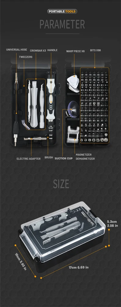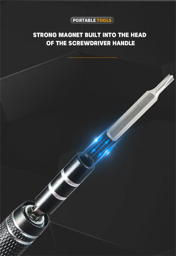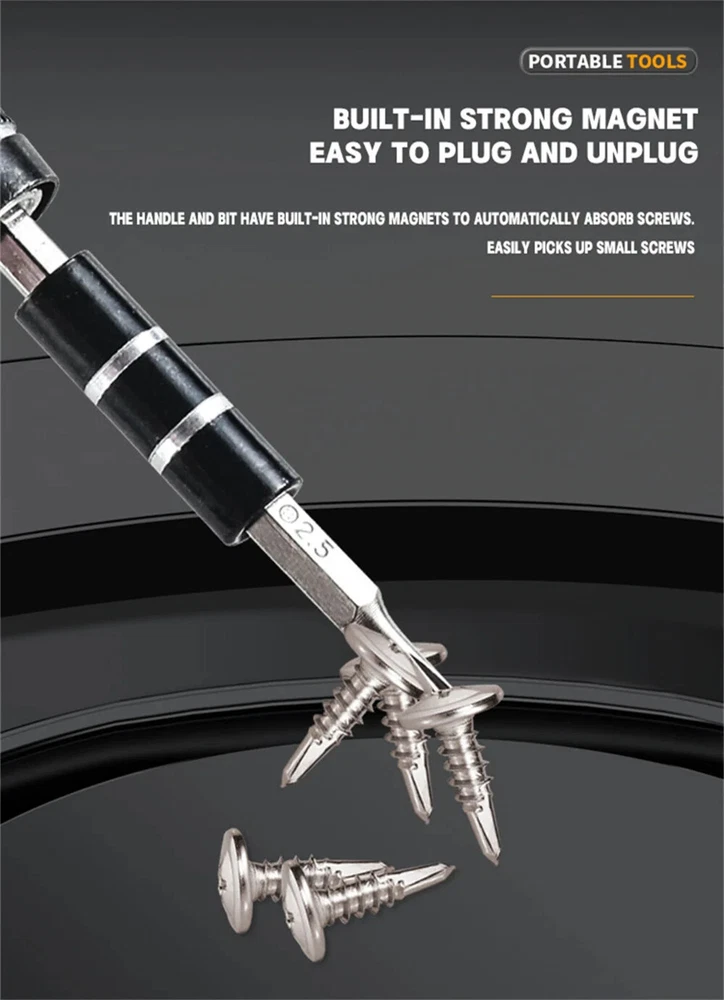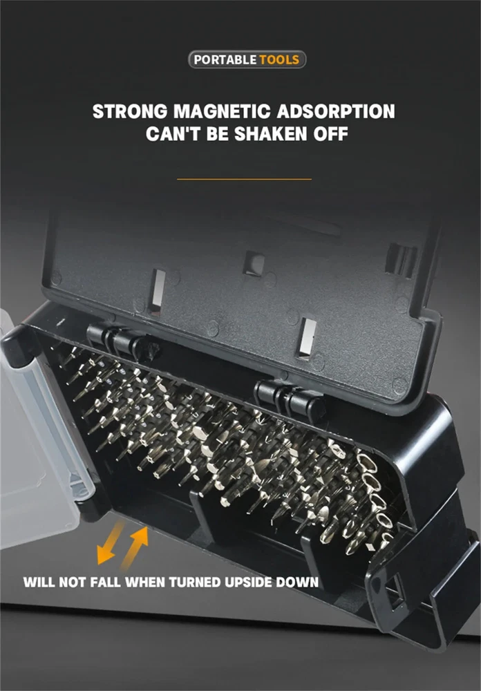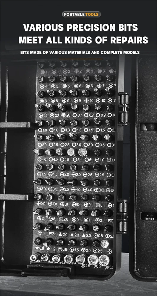 【ALWAYS CHOOSE THE CLASSIC】 The 116 in 1 Precision Screwdriver Kit is the most original and classic electronics repair tool kit, containing 98 screwdriver heads and 17 accessories. The electronic multi-screwdriver basically covers all the tools for electronics and small repairs - perfect for laptops, phones, computers, jewelers, glasses, game consoles, drones, and other electronics. 【TACKLE ALL WITH EASE】 The laptop screwdriver kit features a rotatable cap, ergonomic handle design, and a non-slip grip that provides comfort for extended use. The strong magnetic tip makes it easy to pick up and hold screws, and the flexible extension tool is perfect for those hard-to-reach screws. The magnetic driver kit also includes magnetic bit holder, tweezers, opening tool kit, SIM card removal tool, suction cup, and more. 【RELIABLE MATERIAL】 This magnetic replaceable screwdriver is crafted from high-quality CR-V steel, which boasts impressive strength, precision, and durability without damaging devices. Every bit is designed using thousands of refined repair data and undergoes a high-temperature treatment process to ensure stability and resistance to stripping, guaranteeing long-lasting use. 【PRACTICAL & COST-EFFECTIVE】 This computer screwdriver repair kit is equipped with 29 spare bits for frequently used models - such as phillips, slotted, torx, Y-type and hexagon, which reduces the trouble to find a new bit or replace a new screwdriver set if the bit is lost or damaged, making the lifespan of this electronics repair toolkit longer and save your money! 【PORTABLE & RELIABLE】 This mini screwdriver set has a compact size of 6.7 x 3.5 x 2.1 inches, making it the ultimate tool kit for computer enthusiasts on the go! The classic ABS case features a secure stay-shut latch, ensuring complete protection and organization of your tools. Plus, with Necamocu's lifetime warranty, you can shop with complete peace of mind. Don't miss out on this must-have tool kit for your tech arsenal! Content / delivery: 1x magnetic handle 1 x extension shaft 1 x short post 1 x extension shaft 1 x toolbox 1 x tweezers 1 x iPhone pin 1 x magnetiser/demagnetizer 1 x suction cup 6 x bracts 3 x crowbar 7 x 4mm Mini Sockets: M2.5 · M3 · M3.5 · M4 · M4.5 · M5 · M5.5 91x precision bit Packing included: 1x Padarsey Multi-Magnetic Screwdriver Set 116 in 1 Note: Please allow 1-2cm measuring deviation due to manual measurement Due to various monitors and lighting conditions, colors may be slightly different from listed photos