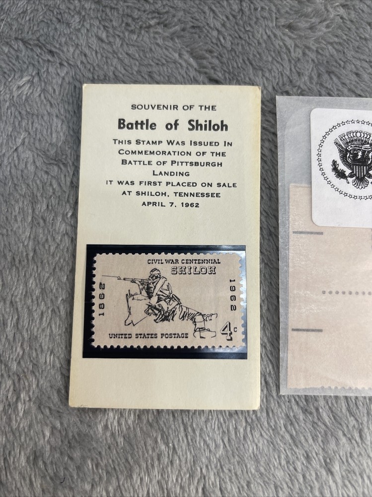 Up for sale is a plate block and single stamp commemorating the American Civil War Centennial. The stamp depicts the Shiloh battlefield and is in mint never hinged condition. The plate block includes four 4-cent stamps and also features the same design as the single stamp. Both items are from the United States and were issued in 1962 with a face value of 4 cents each for a total of 20 cents. The color of the stamps is black and peach blossom. Although ungraded, these items are of high quality and come with no certification.