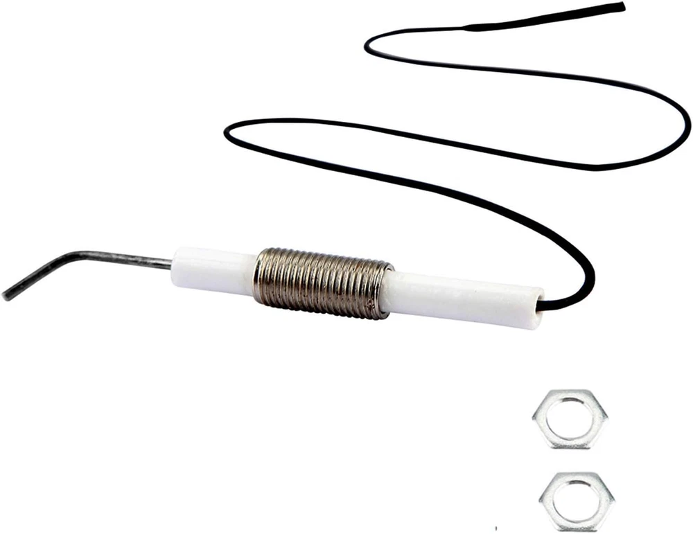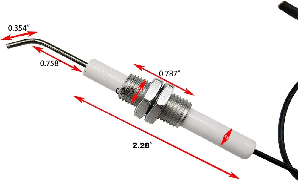 11.8" Long Gas Grill Stove Electrode Spark Plug Eletronic Ignition For Piezo New Length of wire 1.18 inch with high tempereture 200°C resistance for Piezo Igniter Only Universal spark with M10*1 thread includes two nuts to fix on your plate Suitable for repari your gas stove, grill, heater or other gas appliance for spark The end of the terminal is in round with 2.3mm insert, If yours is square, try to stamp it and connect your current igniter to get a signal Pack of 2 for a spare part 2.5 inches x 3.4 inches x 0.5 inches. Weight: 0.32 oz Item Weight 0.32 ounces Country of Origin China Package Dimensions 3.4 x 2.5 x 0.5 inches Size 11.8" Threaded Round Terminal