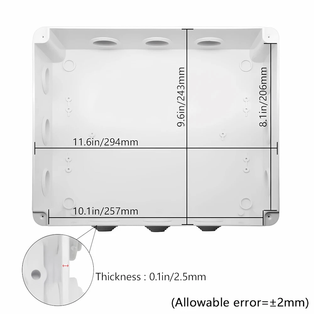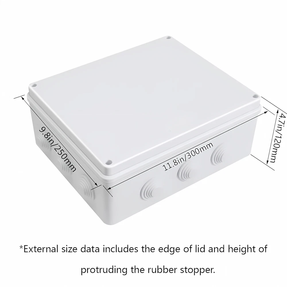 Features: [ Sturdy Construction ] Electrical Junction box is made of high-quality ABS plastic material, which offers excellent impact resistance and electrical insulation. Rest assured that your equipment will be well-protected in harsh environments. [ Safe and Certificated ] With CE RoHS compliant and waterproof rated, the electrical box is free of hazardous substances. The plastic box is predrilled which is easy to install and modify for your project. [ Indoor and Outdoor Use ] With the feature of water resistance and dustproof,it can effectively block splashing water, rain, dust, snow, oil, UV and more. Whether you need to use it indoors or outdoors, this surface mounted project box is easy to operate. [ Extensive Application ] Our junction box is used in a variety of applications: residential homes wiring and connecting electrical devices, such as light fixtures, switches, and outlets; protect and connect electrical equipment for machines, motors etc. Size: 11.8"x9.84"x4.72" Package Included: 1x Electrical Junction Box