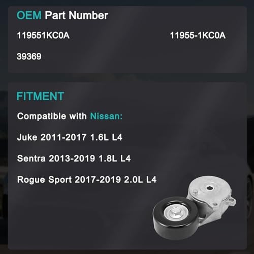 Belt Tensioner Assembly with Pulley for Nissan Juke Sentra Rogue Sport 1.6L 1.8L 2.0L L4 2011-2019 Belt Tensioner Assembly with Pulley for Nissan Juke Sentra Rogue Sport 1.6L 1.8L 2.0L L4 2011-2019 OEM Part Numbers: 119551KC0A, 11955-1KC0A, 39369 for accurate fitment. Compatible with Nissan Juke (2011-2017), Sentra (2013-2019), and Rogue Sport (2017-2019) with specified engine sizes. Constructed from high-grade materials for durability and reliable performance. Ensures optimal belt tension to prevent slippage, extending engine life and improving fuel efficiency. Reduces noise and vibration for a smoother driving experience. Includes a 1-year or 50,000 km service support period.