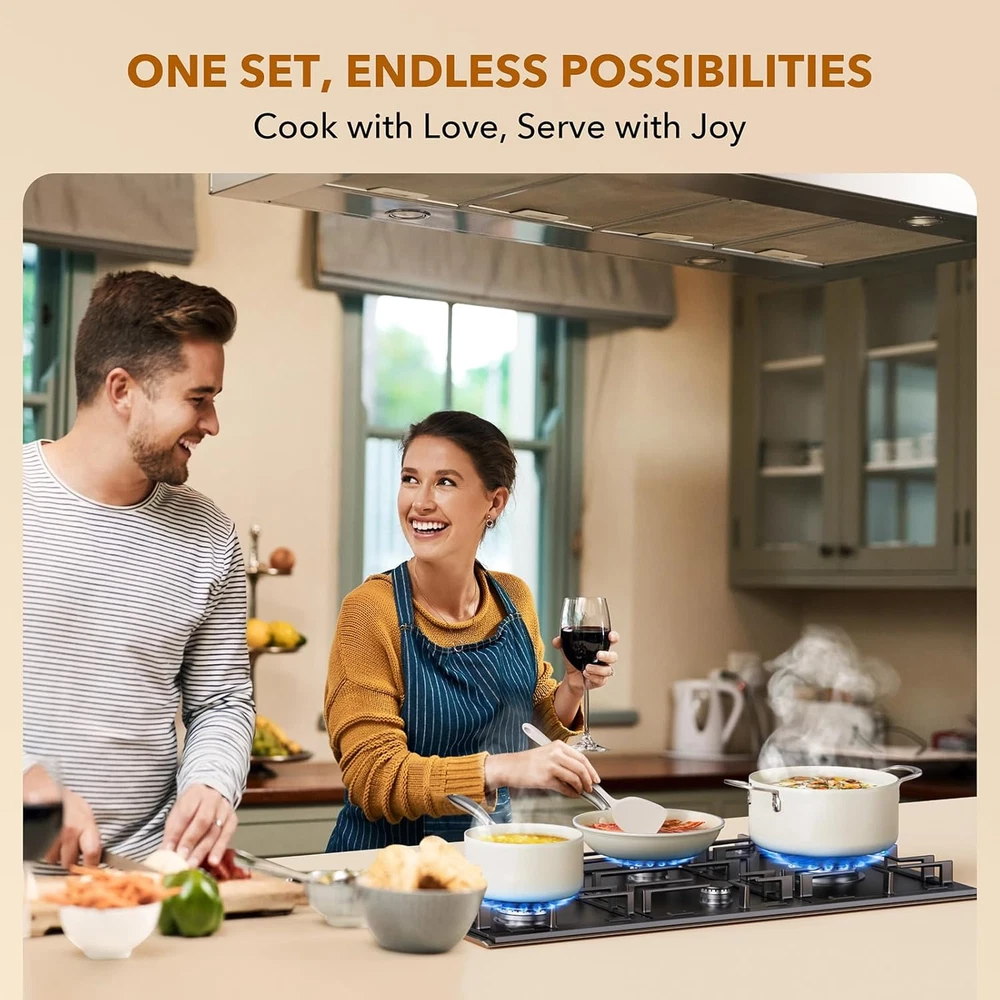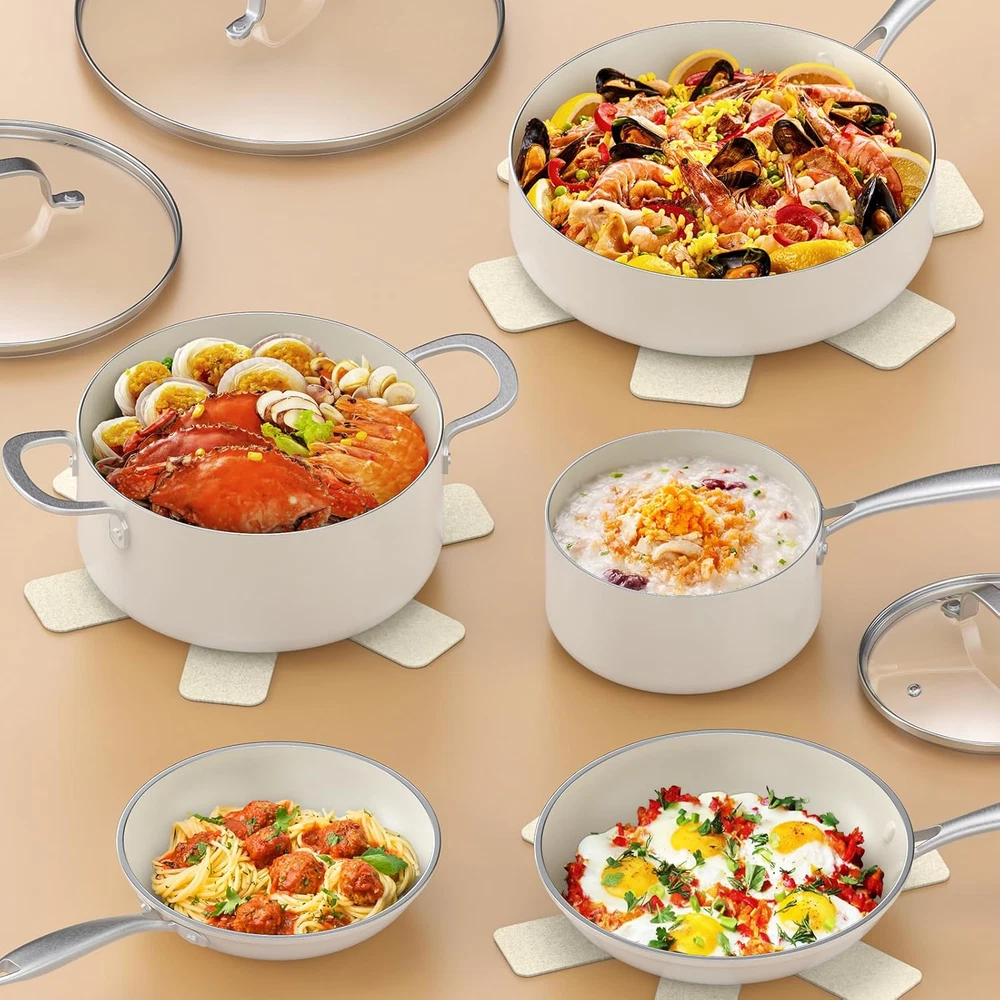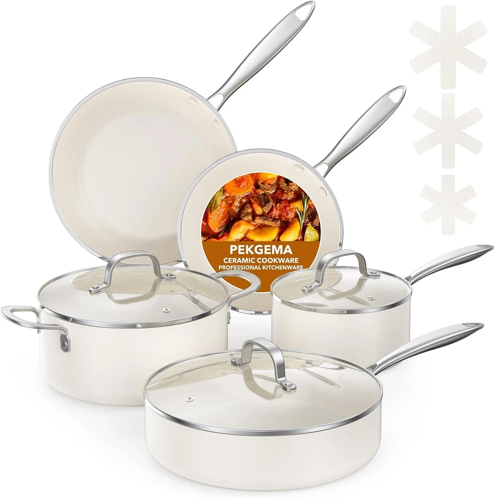 Healthy Nonstick Ceramic: This cookware set delivers 5X superior nonstick performance and is made from 100% Free PTFE, PFOA, PFAS, Cadmium, Lead materials for safe, long-lasting use. 30% Thicker & Built to Last: The pot and pan set body is 30% thicker, featuring a reinforced durable structure that resists breaking and wear, ensuring long-term reliability. 11-Piece Ceramic Cookware Set Includes: 8.5-inch Frying Pan, 10-inch Frying Pan, 1.5QT Saucepan with Lid, 4QT Sauté Pan with Lid, 4.3QT Casserole Pot with Lid, and 3 pot protectors. Oven Safe: Seamlessly transition from stovetop to oven for versatile cooking. The durable nonstick coating and stainless steel handles withstand oven temperatures up to 500°F. Easy to Clean: This nonstick cooking set makes cleanup a breeze—just wipe with a paper towel or rinse with water. It’s durable, stain-resistant, and dishwasher safe for even more convenience. Perfect for Induction & All Stovetops: The high-magnetic stainless steel base ensures fast, even heating on induction, gas, electric, and ceramic cooktops. Worry-Free Guarantee: We stand behind the quality of our PekGema pots and pans set. If you have any questions or concerns, simply contact our customer service team for a hassle-free solution—your satisfaction is our priority. Product Description Happy Pans, Healthy Meals – No Toxins, No Sticky Mess! Our ceramic-coated pots and pans set is so clean, even your veggies will thank you! Free from PFAS, PFOA, PTFE, lead, and cadmium, it’s kid-friendly, stress-free, and ridiculously nonstick—because the only thing that should stick around is family dinner time, not your food! 30% Thicker, 3X More Durable – Oven-Ready Confidence! Built to last! With a 30% thicker body, this cooking set delivers 3X enhanced durability and even heat distribution. Tough enough for daily cooking and oven-safe for effortless roasting and baking—because great meals deserve great cookware! 1 What's Included 2 11in/4 Qt Saute Pan w/Lid 3 4.3 Qt Casserole w/Lid 4 8 &10 inch Frying Pan 5 1.5 Qt Saucepan w/Lid 1 Compatible w/All Stoves 2 Ergonomic Handle 3 Stainless Steel Base 4 Easy To Clean PekeGema New Arrivals Healthy Ceramic Nonstick Safe, Easy, Kid-Friendly! Healthy Ceramic Nonstick Safe, Easy, Kid-Friendly! 10X Ultra Nonstick Exceptional Nonstick Performance Oven Safe Perfect for Roasting & Baking! Oven Safe Perfect for Roasting & Baking! Dual Pour Spouts Say goodbye to messy spills! Induction Compatible Even & Rapid Heating! Includes Steamer Perfect for Effortless Veggie Cooking! Induction Compatible Even & Rapid Heating! Includes Pot Protectors Protects Pot Base & Countertop! Induction Compatible Even & Rapid Heating! Includes Cooking Accessories 2 Utensils, 2 Pot Protectors and Extra Scrub Sponges! Includes Cooking Accessories 2 Utensils, 4 Pot Protectors and Extra Scrub Sponges!