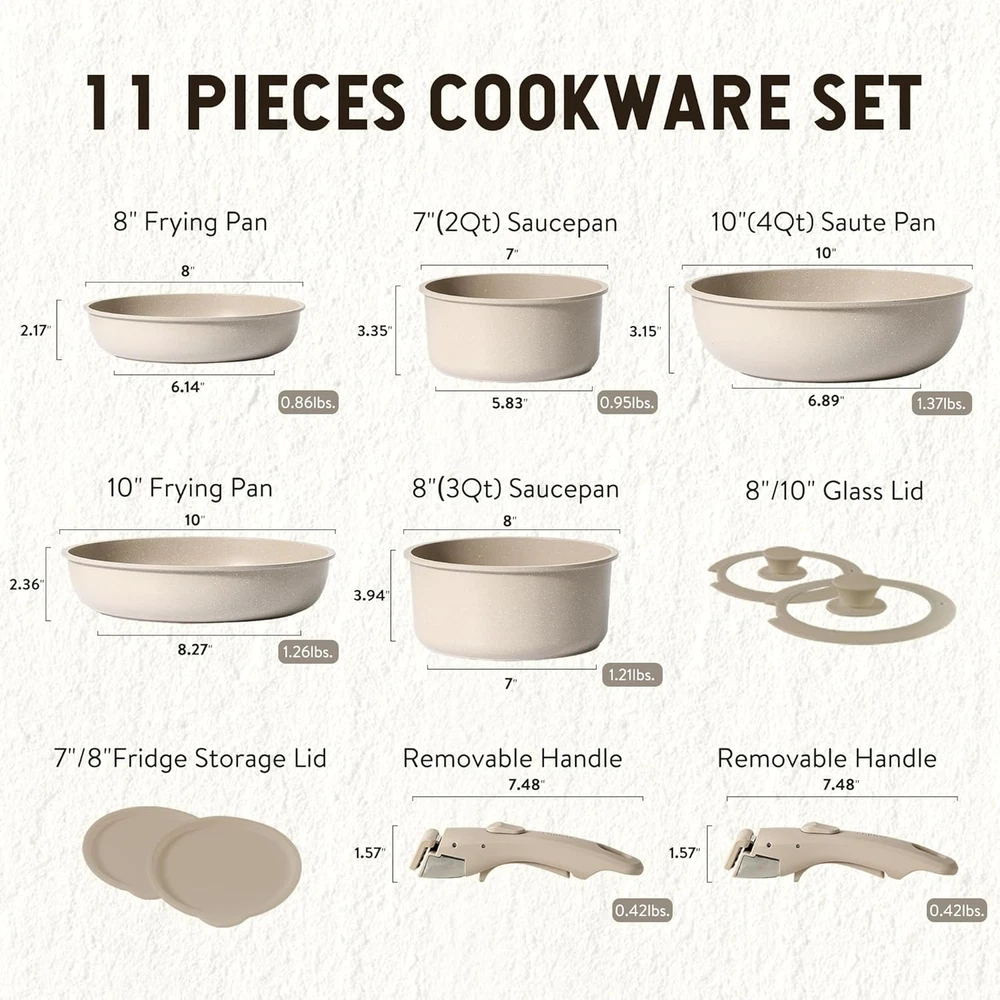 For a Clutter-free Cupboard: Optimal storage and easy stacking with the handles off saves up to 70% more space of Carote detachable handle pots and pans set. For a Fuss-free Cleaning: As both a cookware set and a dinnerware set, 1-time cleaning for all. Cleanup with 0 elbow grease thanks to the nonstick granite. Multitasking Cookware Set: Removable handle for the ultimate versatility– go from ALL kinds of hobs to the oven, to grill, to the fridge, and onto the table in a click. You Won't Compromise on Quality: Balanced convenience-rich features, rapid and even heat transfer, and nonstick performance as the same as other Carote cookware sets. Worry-free Service: Each CAROTE cookware passes a strict multi-inspection process. In case you received defective items caused by delivery, please don't hesitate to reach out, You will be guaranteed to get a solution. Set Includes: 2*fry pans(10''&8''), 2*sauce pans(3qt&2qt), 1*saute pan(10''/4qt), 2*detachable handles, 2*silicone lid(10''&8''), 2*storage lids(8''&7‘’). Product Description What benefits can the detachable handle cookware set bring to you? 70% Space-saving: Perfect stacking in storage compartments like drawers, cabinets, RV, camping use, travel trailer, and motorhome. Effortlessly Move: Removable handle for the ultimate versatility– go from ALL kinds of stoves to the oven, grill, fridge, and dinner table. VERSATILE COOKING Non-stick Pans and Pots Effortless Cooking in the Detachable Cookware Sets! With an ultra-peeling-resistant nonstick surface, this detachable cookware set marries breath-taking design with the latest in non-stick advances. Even the simplest recipes get the star treatment with Carote's unique "Click" cookware set. Clean with a 5s wipe Fuss-free Cleaning! Easy to clean pans and pots finished with an enhanced nonstick exterior make cleanup easy and with zero elbow grease. Space saving tech Kitchen Storage Hack! NO MORE CABINET CHAOS: 70% Space-saving magic, keep your kitchen tidy and clutter-free! 1 Easy Stoves Use 2 Easy Food Storage 3 Easy Oven Use 4 Easy Serving Click, Cook, Carote Pots and Pans Set Removable Handle