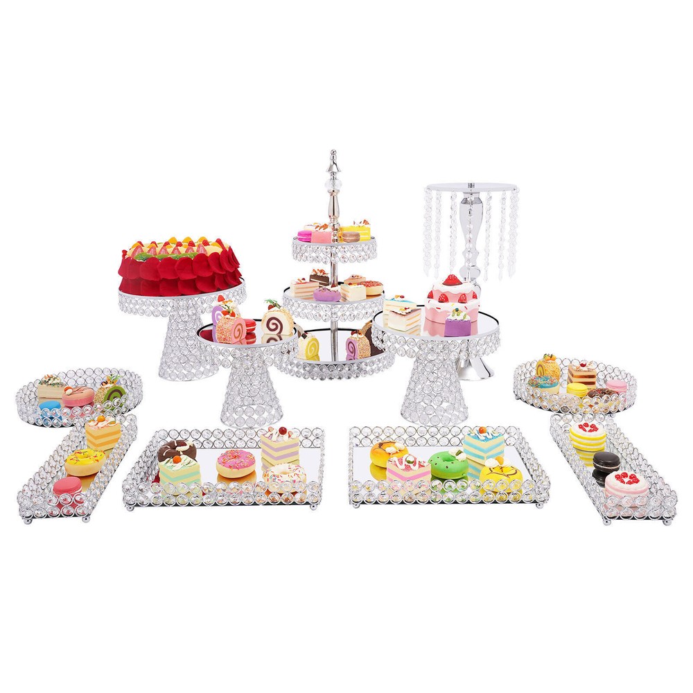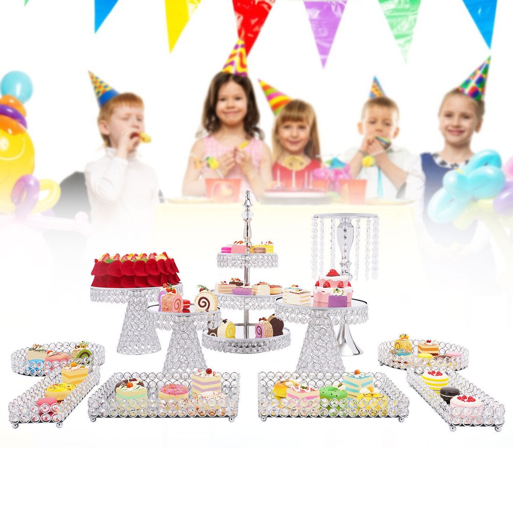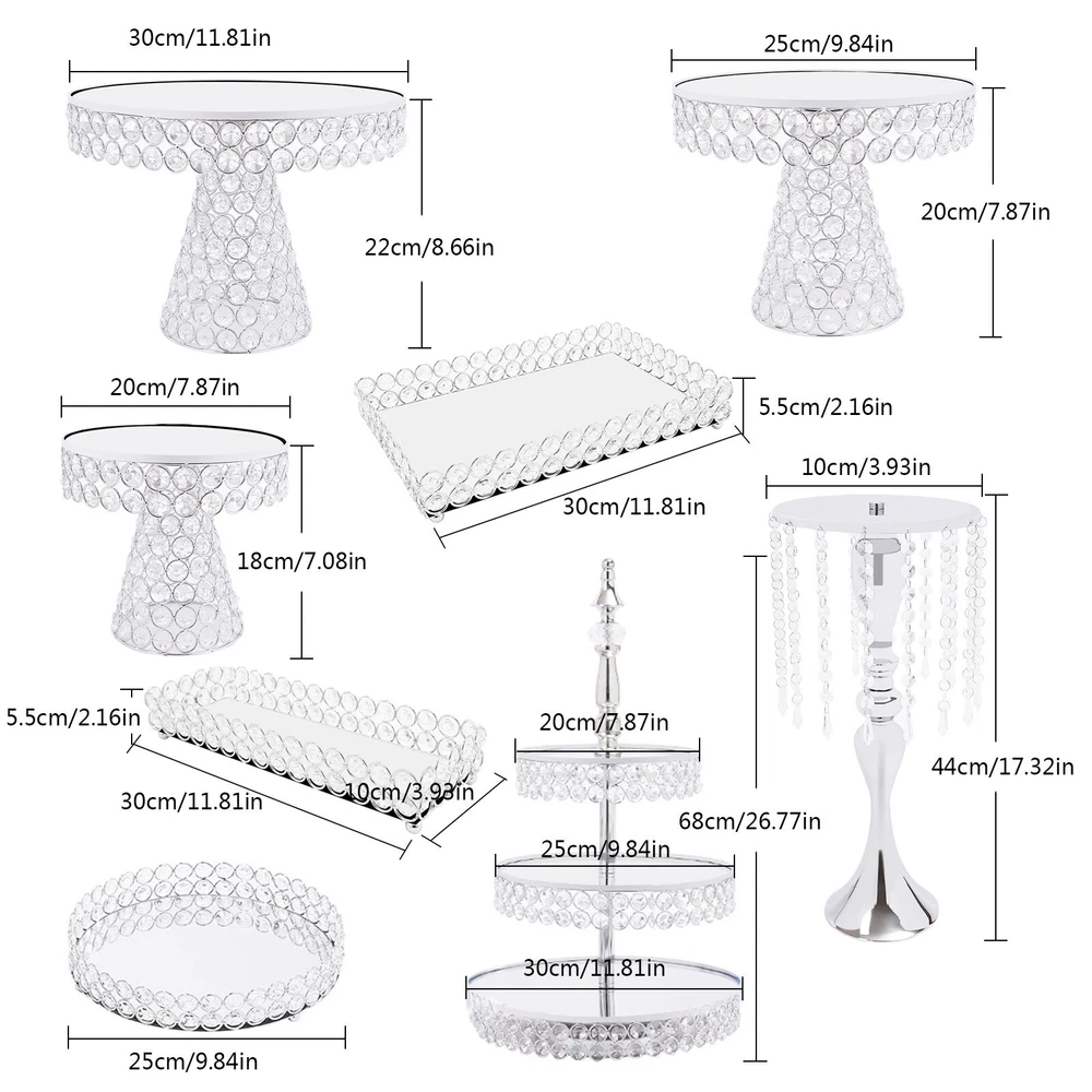 11-Piece Set Cake Stands Round Cupcake Stands,Metal For Wedding Brithday Party Description 11-Piece Set Cake Stands Round Cupcake Stands,Metal Wedding Brithday Party Celebration Dessert Display Plates, Silver Description This set of cake stands is made of sturdy iron, glass, and crystal bead, which is durable and features a delicate, smooth texture. With a silver electroplated exterior, crystal decorative beads, and a mirror panel, the cake stand will glow brilliantly when exposed to light or sunlight, creating a glittering dessert table to support your delicious food. It will become an attractive and atmospheric decoration to your room, wedding, or party to create your own stylish space. Key Features Practical Set: This is a 11-piece set consisting of a 3-tier cake stand, four rectangular trays, and two round trays, and four round cake stands. This kit will unify your decorating style and easily meet your daily decorating and display needs. Sturdy and Durable: It is made of high-quality iron and glass, and adopts a fine welding process, making it very strong, wear-resistant, impact-resistant, a nd not easy to deform to ensure good bearing performance and long service life. Elegant Appearance: The mirror panel and elegant silver appearance will sparkle under the light, while the crystal beads surrounding it give this cake stand a noble accent that will stand out at an upmarket party. Easy to Assemble&Disassemble: To assemble the cake stand, simply screw the cake pan into the pre-set holes in the base, saving time and effort. It also allows simple dismantling for carrying and storage. Ideal Dessert Display: The multiple styles of cake stands will nicely sort and display your cupcakes, muffins, pastries, biscuits, biscuits sweets, fruit, cheese, etc or other small items, making an attractive table centerpiece to show your friends and guests your hospitality and generosity. Ideal Gift: The elegant appearance and good practicality make it a great gift. You can present it as a gift for hostesses, family, and friends on Christmas, New Year, Thanksgiving day, etc. Easy to Clean : Its smooth, flat electroplating surface and mirror panel allow you to easily remove dust and stains with a damp rag. Customer Service : We aim to provide quality products and services. If you have any problems, please feel free to contact us. We will reply and solve the problem for you as soon as possible. Details Electroplating Process: It has undergone a meticulous electroplating process, so that it has good anti-rust and corrosion-resistance . At the same time, the electroplating process produces a mirror effect, adding a three-dimensional and exquisite feeling. Solid Base and Support Feet: The cake rack is designed with a secure conical base and rounded base, while the bottom of the tray uses spherical support feet to provide solid support and stability without tilting and shaking, and can also prevent the table from being scratched. Application It can be used for tea parties, wedding table center decorations, anniversaries, birthday parties, baby showers, bakeries, graduation ceremonies, Christmas, and Thanksgiving gifts, aisle guides, party decorations, and activity decorations, as well as home decorations. Specifications Material: Iron+Glass+Crystal Bead Color: Silver Assembly Required: Yes Style: Morden Number of Pieces: 11 Mounting Type: Freestanding Process: Welding, Electroplating Large Rectangular Tray Size: 30*20cm/11.81*7.87in Small Rectangular Tray Size: 10*30cm/3.93*11.81in Diameter of the Round Tray Size: 25cm/9.84in Diameter of the Three-tier Cake Stand: 30cm/11.81in+25cm/9.84in+20cm/7.87in Height of the Three-tier Cake Stand: 68cm/26.77in Cake Stand with Conical Column Base Size(D*H): 30*22cm/11.81*8.66in; 25*20cm/9.84*7.87in; 20*18cm/7.87*7.08in Raised Cake Stand With Crystal Bead Pendant Size(D*H): 10*44cm/3.93*17.32in Package Included 2* Large Rectangular Trays 2* Small Rectangular Trays 2* Round Trays 1* Three-tier Cake Stand 3* Cake Stands with Conical Column Base 1* Raised Cake Stand With Crystal Bead Pendant All Accessories for Installation Notes 1. Please do not soak in water or store in a damp place for a long time. 2. Please avoid exposure to the sun, and avoid scratching the surface with sharp objects. Dishwashers, ovens, or microwaves are not recommended. 3. Please note that the cakes in the photos is for showing. They are not included in the package. Please allow the slight color difference caused by the shooting light and 1-3cm error due to manual measurement, and make sure you do not mind before you order. Description Payment Delivery details Terms of sales About us Contact us Payment We accept ebay payment 。 Fees such as import duties, taxes are not included in the item price or shipping costs. These charges are the buyer's responsibility. Delivery details Shipping: 2-9 working days to: USA Terms of sales We maintain high standards of excellence and strive for hundred percent customer satisfaction. Feedback is very important to us. We hope that you contact us immediately before you give neutral or negative feedback, so that we can address your concerns. It is impossible to address issues if we do not know about them! About us Your satis faction is our ultimate goal. We work hard to earn your trust and future business. Our certified technicians have tested each item before shipping. The unit comes with 1 year limited warranty on all manufacturing defects. a) If you receive a defective item, you may return it or ask for a discount. Please contact us within 14 days after you receive the package. b) What you returned must be intact and in its original packaging as re? u. Customer is responsible for shipping costs of the returned item. c) We will cover the cost of shipping back t with the shipping rate indicated in the registration page. We will send you a new unit or refund the full payment you paid. Thank you. Contact us Business Hour Business Hour: Monday To Friday: 8:30 AM to 5:00 PM