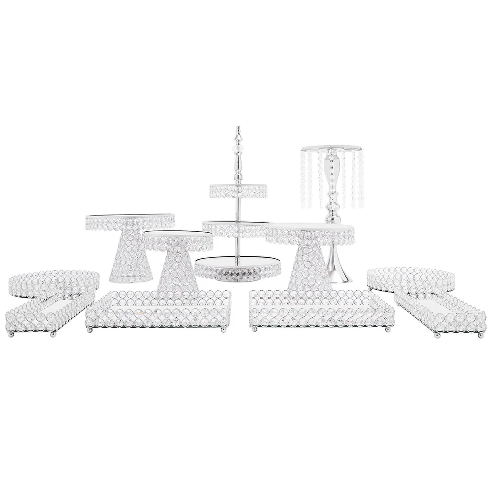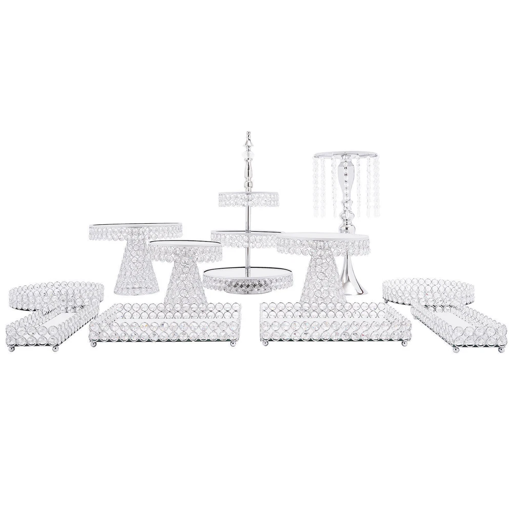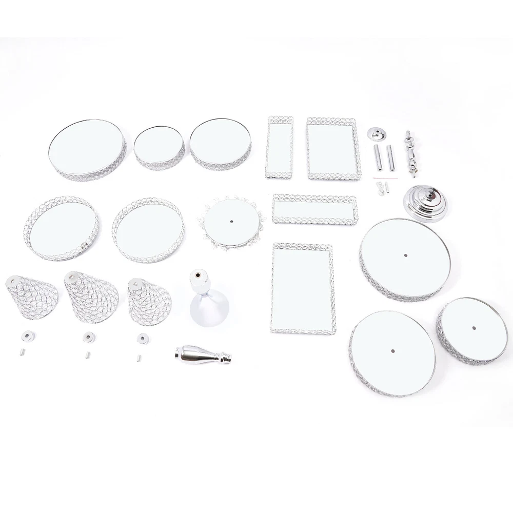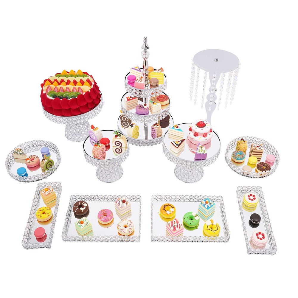 11-Piece Set Cake Stands Round Cupcake Stands,Metal For Wedding Brithday Party Description 11-Piece Set Cake Stands Round Cupcake Stands,Metal Wedding Brithday Party Celebration Dessert Display Plates, Silver Description This set of cake stands is made of sturdy iron, glass, and crystal bead, which is durable and features a delicate, smooth texture. With a silver electroplated exterior, crystal decorative beads, and a mirror panel, the cake stand will glow brilliantly when exposed to light or sunlight, creating a glittering dessert table to support your delicious food. It will become an attractive and atmospheric decoration to your room, wedding, or party to create your own stylish space. Key Features Practical Set: This is a 11-piece set consisting of a 3-tier cake stand, four rectangular trays, and two round trays, and four round cake stands. This kit will unify your decorating style and easily meet your daily decorating and display needs. Sturdy and Durable: It is made of high-quality iron and glass, and adopts a fine welding process, making it very strong, wear-resistant, impact-resistant, a nd not easy to deform to ensure good bearing performance and long service life. Elegant Appearance: The mirror panel and elegant silver appearance will sparkle under the light, while the crystal beads surrounding it give this cake stand a noble accent that will stand out at an upmarket party. Easy to Assemble&Disassemble: To assemble the cake stand, simply screw the cake pan into the pre-set holes in the base, saving time and effort. It also allows simple dismantling for carrying and storage. Ideal Dessert Display: The multiple styles of cake stands will nicely sort and display your cupcakes, muffins, pastries, biscuits, biscuits sweets, fruit, cheese, etc or other small items, making an attractive table centerpiece to show your friends and guests your hospitality and generosity. Ideal Gift: The elegant appearance and good practicality make it a great gift. You can present it as a gift for hostesses, family, and friends on Christmas, New Year, Thanksgiving day, etc. Easy to Clean : Its smooth, flat electroplating surface and mirror panel allow you to easily remove dust and stains with a damp rag. Customer Service : We aim to provide quality products and services. If you have any problems, please feel free to contact us. We will reply and solve the problem for you as soon as possible. Details Electroplating Process: It has undergone a meticulous electroplating process, so that it has good anti-rust and corrosion-resistance . At the same time, the electroplating process produces a mirror effect, adding a three-dimensional and exquisite feeling. Solid Base and Support Feet: The cake rack is designed with a secure conical base and rounded base, while the bottom of the tray uses spherical support feet to provide solid support and stability without tilting and shaking, and can also prevent the table from being scratched. Application It can be used for tea parties, wedding table center decorations, anniversaries, birthday parties, baby showers, bakeries, graduation ceremonies, Christmas, and Thanksgiving gifts, aisle guides, party decorations, and activity decorations, as well as home decorations. Specifications Material: Iron+Glass+Crystal Bead Color: Silver Assembly Required: Yes Style: Morden Number of Pieces: 11 Mounting Type: Freestanding Process: Welding, Electroplating Large Rectangular Tray Size: 30*20cm/11.81*7.87in Small Rectangular Tray Size: 10*30cm/3.93*11.81in Diameter of the Round Tray Size: 25cm/9.84in Diameter of the Three-tier Cake Stand: 30cm/11.81in+25cm/9.84in+20cm/7.87in Height of the Three-tier Cake Stand: 68cm/26.77in Cake Stand with Conical Column Base Size(D*H): 30*22cm/11.81*8.66in; 25*20cm/9.84*7.87in; 20*18cm/7.87*7.08in Raised Cake Stand With Crystal Bead Pendant Size(D*H): 10*44cm/3.93*17.32in Package Included 2* Large Rectangular Trays 2* Small Rectangular Trays 2* Round Trays 1* Three-tier Cake Stand 3* Cake Stands with Conical Column Base 1* Raised Cake Stand With Crystal Bead Pendant All Accessories for Installation Notes 1. Please do not soak in water or store in a damp place for a long time. 2. Please avoid exposure to the sun, and avoid scratching the surface with sharp objects. Dishwashers, ovens, or microwaves are not recommended. 3. Please note that the cakes in the photos is for showing. They are not included in the package. Please allow the slight color difference caused by the shooting light and 1-3cm error due to manual measurement, and make sure you do not mind before you order. Description Payment Delivery details Terms of sales About us Contact us Payment We accept ebay payment 。 Fees such as import duties, taxes are not included in the item price or shipping costs. These charges are the buyer's responsibility. Delivery details Shipping: 2-9 working days to: USA Terms of sales We maintain high standards of excellence and strive for hundred percent customer satisfaction. Feedback is very important to us. We hope that you contact us immediately before you give neutral or negative feedback, so that we can address your concerns. It is impossible to address issues if we do not know about them! About us Your satis faction is our ultimate goal. We work hard to earn your trust and future business. Our certified technicians have tested each item before shipping. The unit comes with 1 year limited warranty on all manufacturing defects. a) If you receive a defective item, you may return it or ask for a discount. Please contact us within 14 days after you receive the package. b) What you returned must be intact and in its original packaging as re? u. Customer is responsible for shipping costs of the returned item. c) We will cover the cost of shipping back t with the shipping rate indicated in the registration page. We will send you a new unit or refund the full payment you paid. Thank you. Contact us Business Hour Business Hour: Monday To Friday: 8:30 AM to 5:00 PM