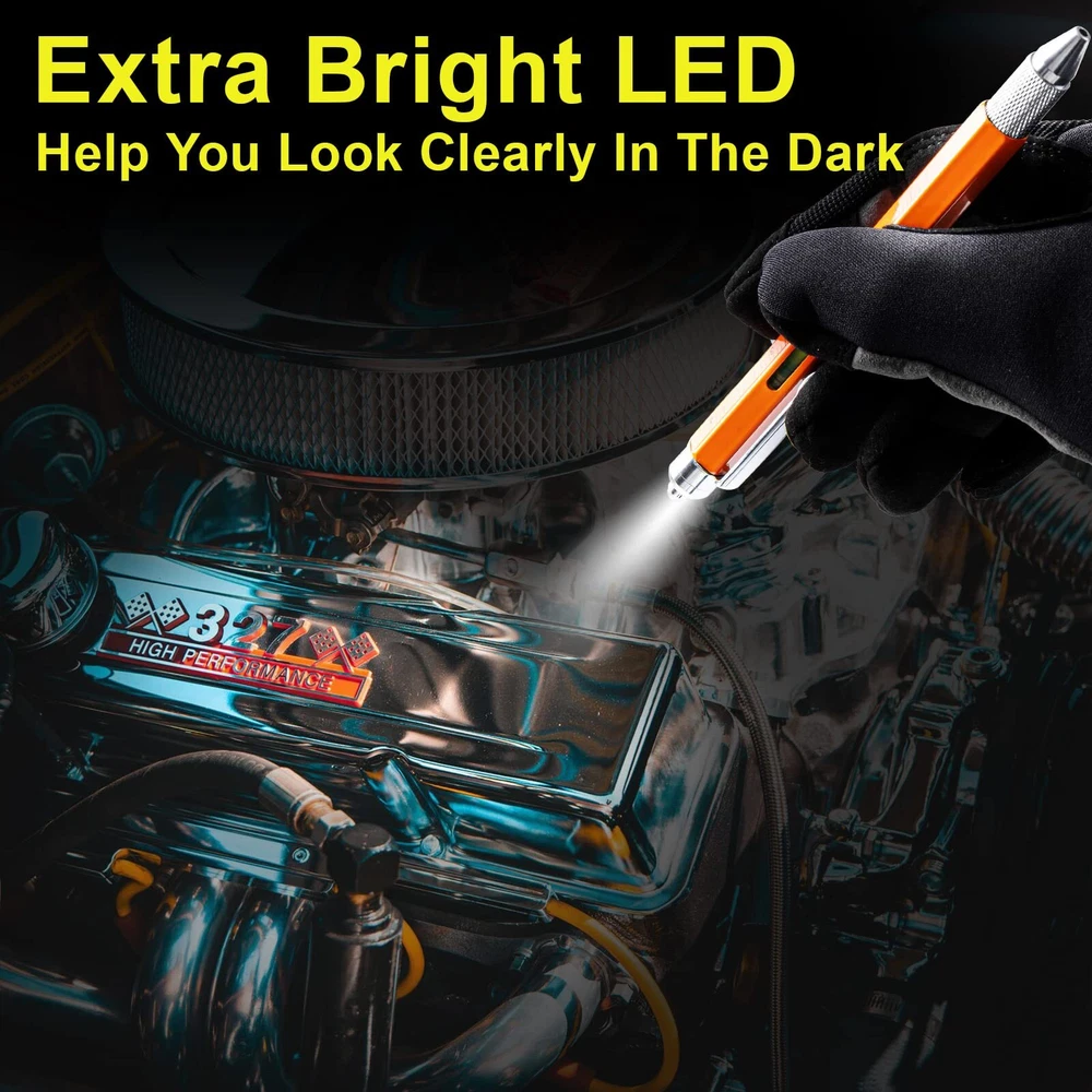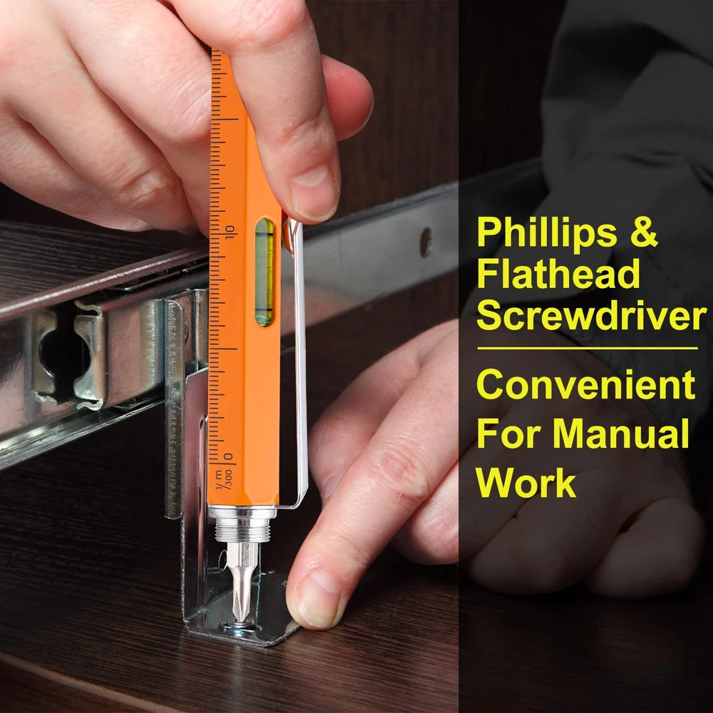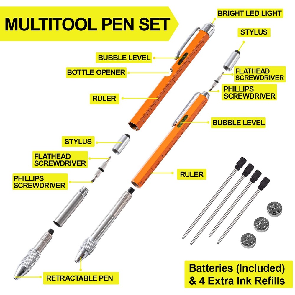 Gifts for Men Dad Him, 11 in 1 Multitool Pen Set with LED, Stylus, Level, Screwdriver, Flathead, Valentines Day Gifts for Men Gifts for Dad, Birthday Gifts for Men, Him, Husband, Father, Orange 9 IN 1 MULTI TOOL PEN: The multi pen set has combined 9 functions: LED Flashlight, Flathead and Phillips Screwdrivers, Standard and Metric Rulers, Rubber Stylus, Bubble Level, Bottle Opener, Black Ballpoint Pen Gifts for Men: This multifunction pen can meet the most manual needs, you can imagine the scene when he received it. It's a perfect stocking stuffers gift idea gift idea. Unique gifts for engineers; carpenters; farmers; handymen; artists; mechanics; electrical; engineers; architects; DIYers on Christmas Day;Thanksgiving day; Valentine's Day; Father's Day; and more LED LIGHT and SCREWDRIVER: With the super bright LED light, this pen can help you light up any conner. There is a flathead and phillips 2 in 1 screwdriver in the pen, just need you to take down the stylus , which can help you working in the daily life HIGH QUALITY MATERIAL: Heavy duty aluminum metal body with excellent strength. Useful tool for handyperson and DIYers. Due to its weight and small size, you can take it everywhere. 4 extra refills for replacement when you run out of ink or the refill broken PACKAGE and SERVICE: It comes with one 9 in 1 multitool pen (3 batteries installed), one 6 in 1 multitool pen, 4 extra ink refills and instruction. If you have any question, please feel free to contact us, and we will provide professional service to solve your problems Shipping We offer FREE shipping on all orders! We ship within Three business days of payment, usually sooner. We use a selection of shipping services such as UPS, FedEx, USPS etc. We only ship to the lower 48 states, no APO/FPO addresses or PO Boxes allowed. Local pickups and combined shipping options are not provided at this time. Return You can return a product for up to 30 days from the date you purchased it. Any product you return must be in the same condition you received it and in the original packaging. Please keep the receipt. Payment We accept payment by any of the following methods: PayPal Please pay as soon as possible after winning an auction, as that will allow us to post your item to you sooner! Feedback Customer satisfaction is very important to us. If you have any problem with your order, please contact us and we will do our best to make you satisfied. Contact Us If you have any queries, please contact us via ebay. We usually respond within 24 hours on weekdays. Please visit our eBay store to check out other items for sale! Thank you for shopping at our store.
