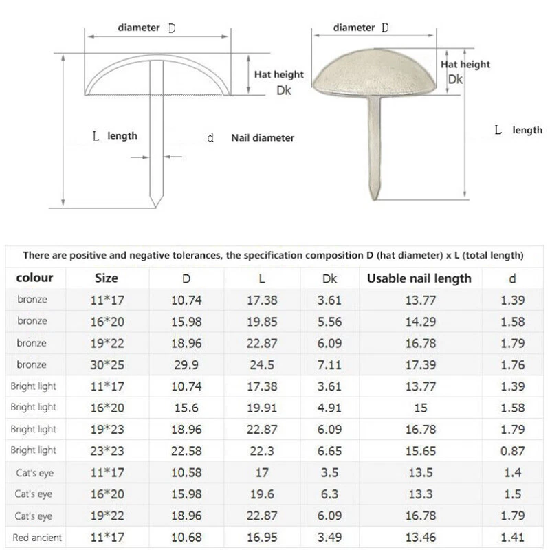 Descriptions: 100% Brand New And High Quality Product name: Nails Size:11mm 16mm 19mm 22mm 23mm 25mm 30mm 40mm Size: For example: 20mm (circular diameter 20mm) Color: Bright light/Cat's eye/Red ancient/Gold/Bronze Standard: Metric Package include: According to your choice. Payment: PayPal, PayPal Credit, MasterCard, Apple Pay, Google Pay...are all supported. Shipping: Please make sure your address 100% right. Return Policy: If you are not satisfied with the item,any problem,please contact with us before you give a negative feedback,because it doesn't help you at all.we will try our best to help you solve the problems. Feedback: Your satisfaction is very important for us.If you are satisfied with our item or service,please give us a positive feedback and 5-Star DSRs rating. Contact Us: We are very glad to help you,please feel free to contact us whatever any problems.Due to high volume of daily incoming emails and time zone difference,please allow 24 hours for us to reply. About Item: For the funcitonal products in our shop,we make sure that the functions are the same as description,but the actual color and shape may looks a little different from pictures because of the technical improvement and manufacturing variance.Please be advised before you bid.