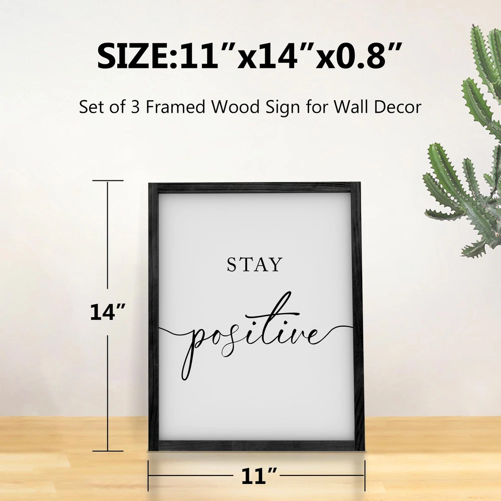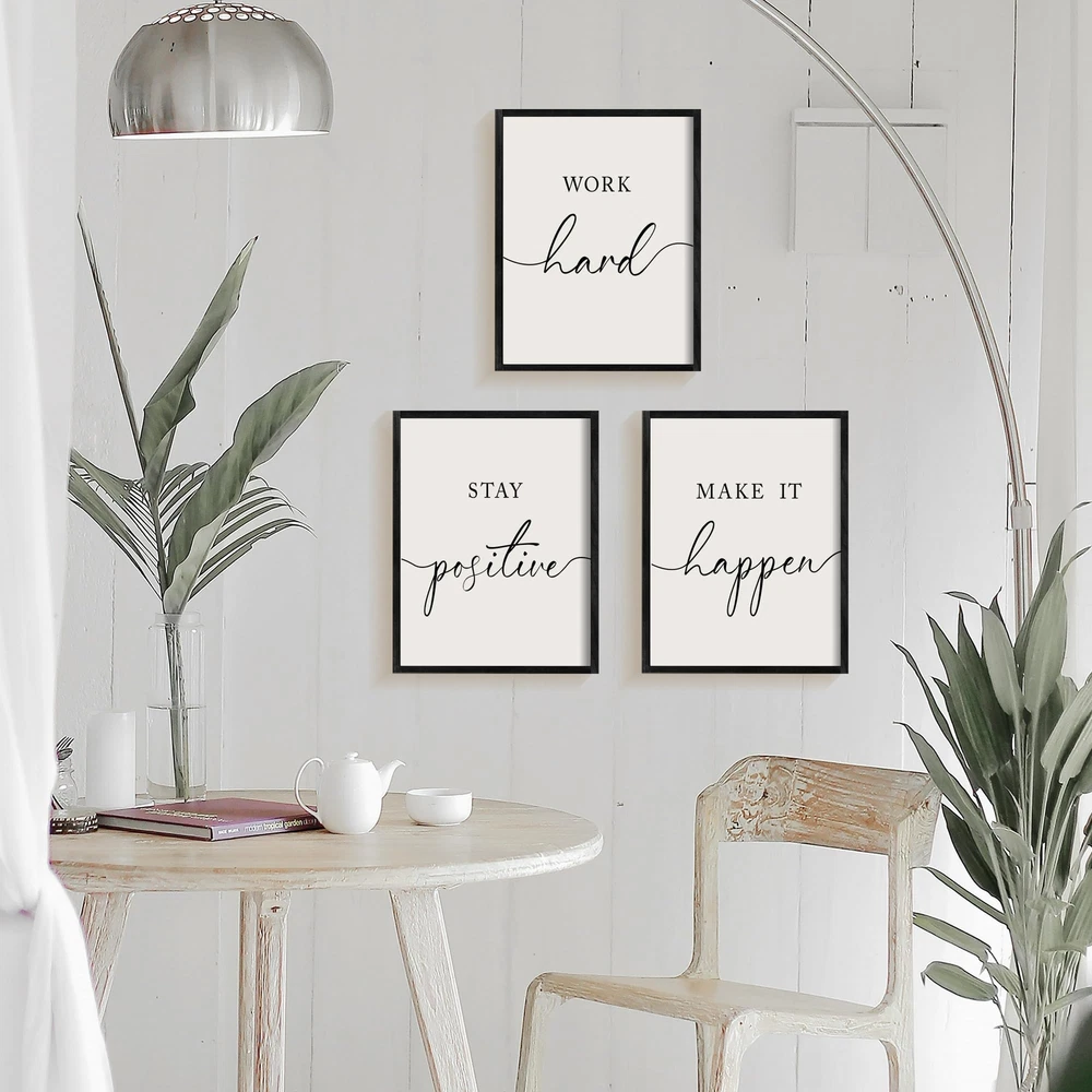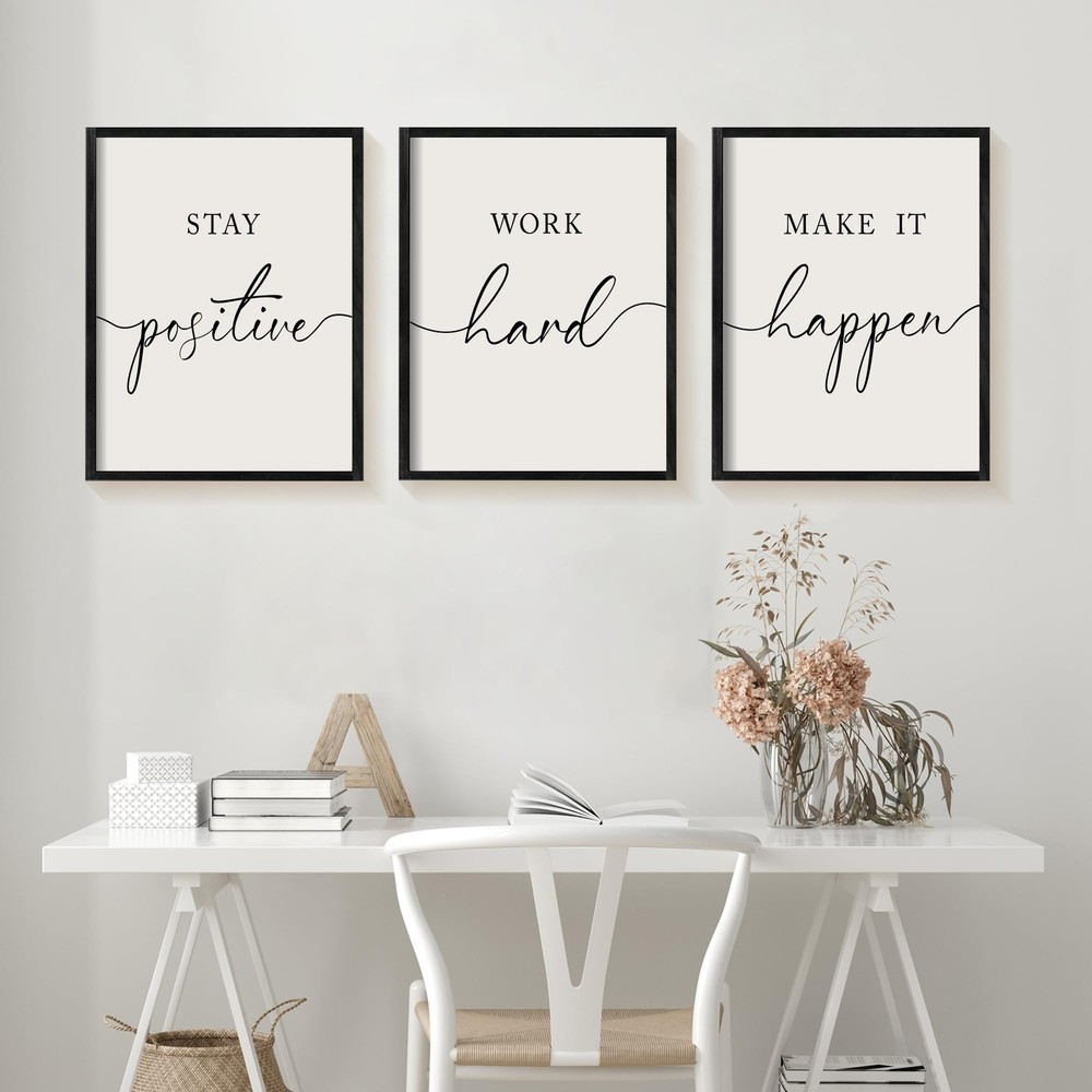 MOTIVATIONAL FRAMED WALL ART: Stay Positive Work Hard Make it Happen office wall decor has the subliminal motivation that can be seen daily, simple and easy to read. Whenever you start to feel stressed you just look up, read the wall hangings, take a deep breath and bring yourself back to enthusiasm! BRING LIFE TO OFFICE: The quotes wall decor will add some character to your space while spreading good vibes. Plus, it's a great conversation starter during those Zoom meetings! They are honestly something you choose to see and read daily, when there are good and down times in the workplace. EXCELLENT CRAFTSMANSHIP: The framed motivational wall decor is well printed and detailed on the durable cardboard with solid pine wood frames. Each word is sharply printed, clear and graceful black lettering against a white background is a perfect color match, which captures the eye. READY TO HANG WALL DECOR: The inspirational wall art is lightweight, equipped with little wall brackets built into the back of them that makes it very easy to hang with just one nail. Mounting screws are included in the package. It only takes a couple of minutes to get the job done, or just sit it somewhere. ELEGANT DESIGN: The pictures wall decor is simple in design that goes well with different decor styles and wherever you need a little pep in your step: workspace, classroom, man-cave basement area, home office, college dorm, basement hangout area, workout space, and kids room to remind them to always be positive and motivated!