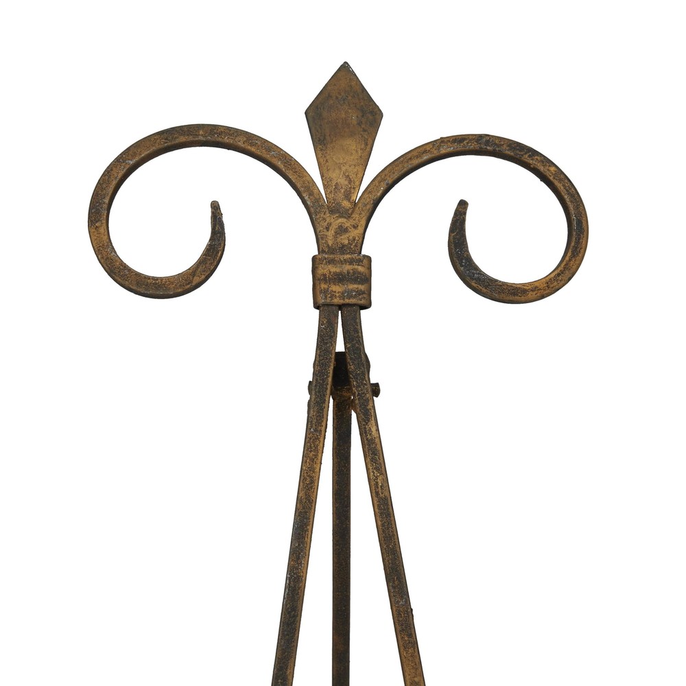 Designed with timeless sophistication, rich old-world textures and warm hues come together for a refined classic taste of luxury This gold display easel is crafted from solid iron for durability The arched easel stand flaunts a rusted gold color and a weathered finish for an antique feel, adding a touch of elegance to any setting The iron easel features a French-inspired design in a strong A-frame form, adding elegance to your favorite memories on display The weathered gold decorative easel boasts an elegant arch shape and intricate fleur-de-lis figure top design that enhances its vintage charm