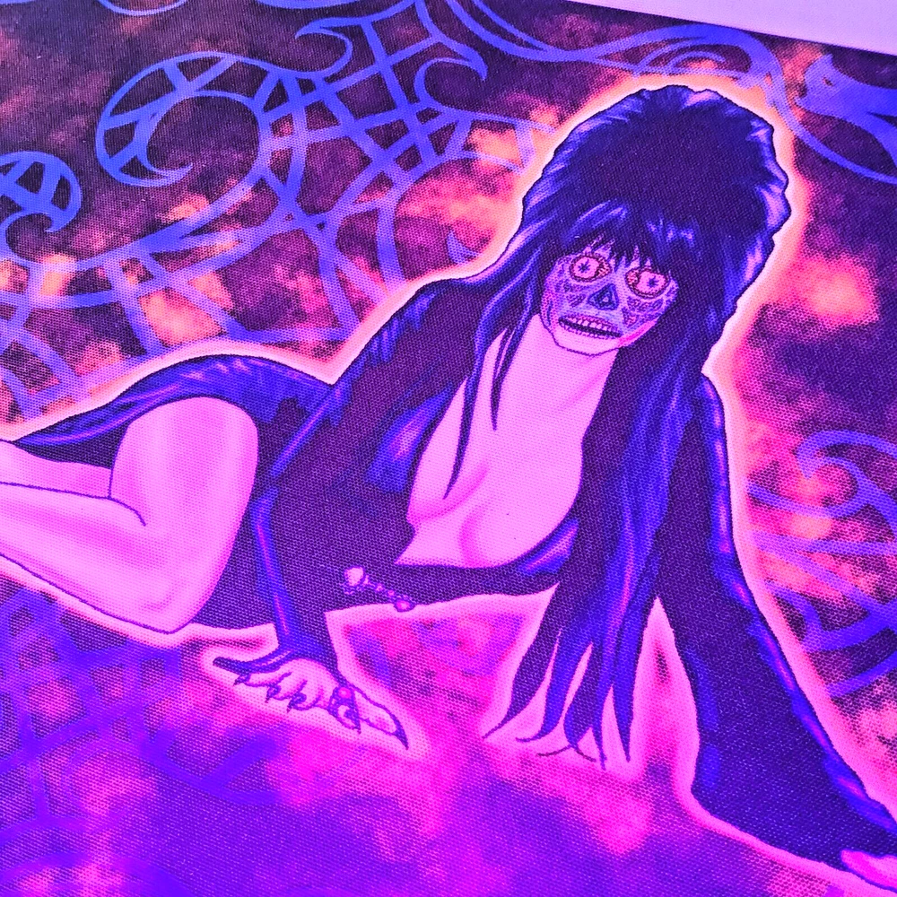 11x7 elvira as they live alien goth pinup halloween digital art prints by me,the artist. Decided that Elvira would still make a hot alien so drew her up as a "They live" baddie just straight chillin'. She gets a pass for being Elvira. Made some sublimation prints so we can all enjoy this piece. Check out other prints of my art in my shop. ***Treasure Suite offers you many pieces of my art prints now*** ###This section is for large sized sublimation prints of my digital art. measurements are 15"hx12"w. ### *Welcome to my unique collection of digital art, where creativity meets craftsmanship! Each piece in this category features my original designs, heat pressed into vibrant sublimation prints on polyester canvas material. These art pieces are not just decorations, they are collectibles that bring a touch of gothic, rock and roll, horror, pin-up, and lowbrow art into your space. *I leave extra fabric border so you can gallery wrap on frame,cut to size, or sew onto clothes. Sublimation printing is what's done on clothing, like all over sweaters,tshirts,banners,etc. So that means it can be used on clothing and washed. If print gets wrinkled, you can steam it. *These pieces are perfect for adding a distinctive edge to your home or office, and they make fantastic gifts for art enthusiasts and collectors alike. Who doesn't enjoy vibrant digital art of out of this world space huntresses, demon witches, cyberpunk vixen cyborgs, spooky mistresses,and so on?