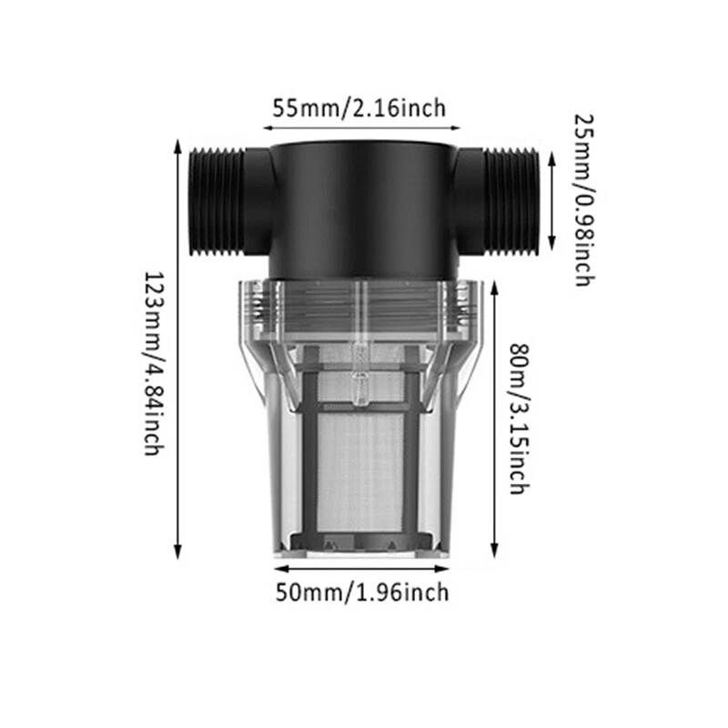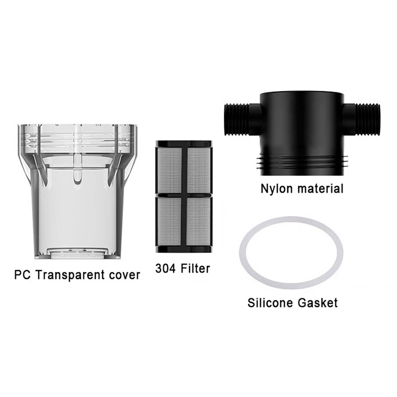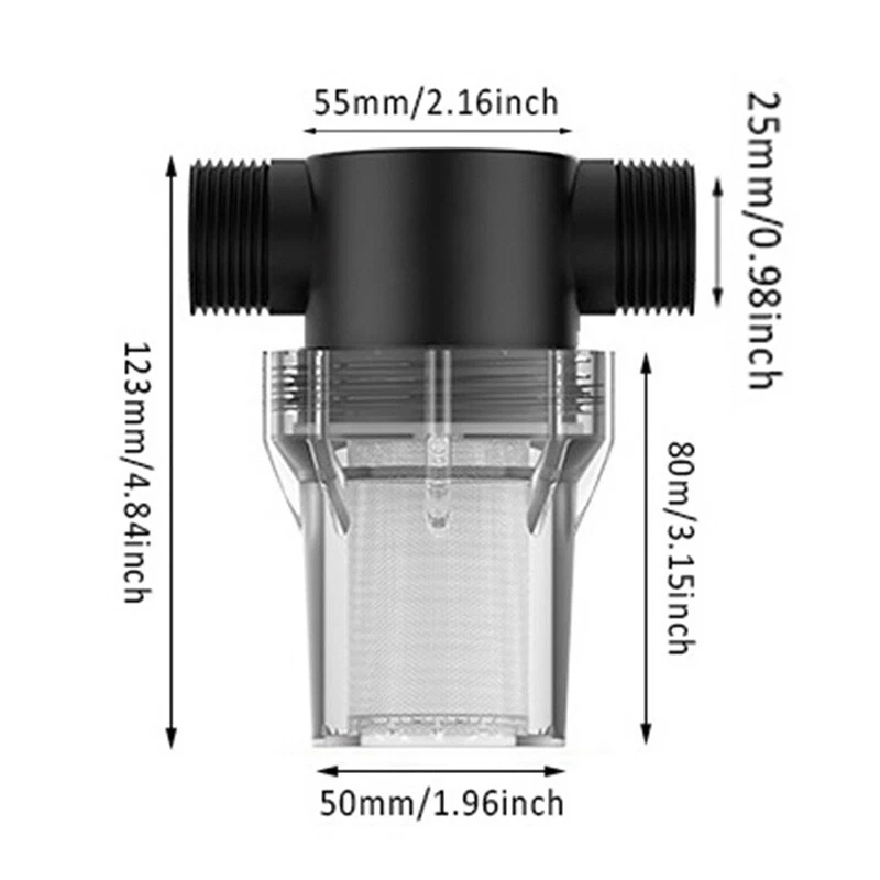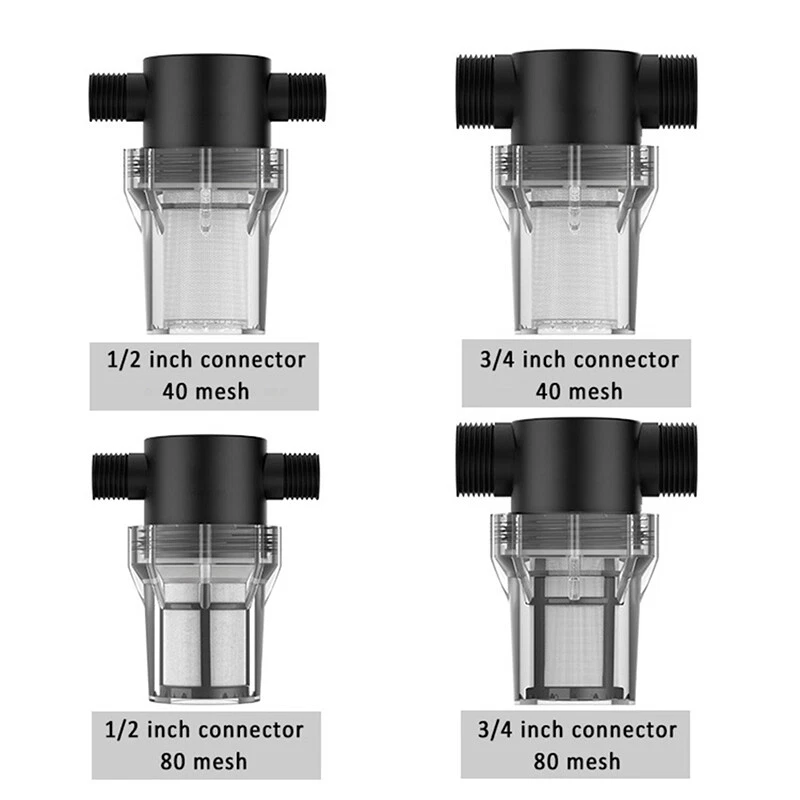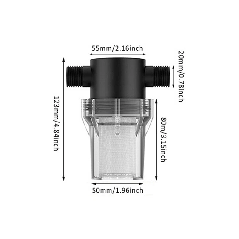 Description: Product Name: Water Pipe Filter Material: PC Color: Black + Transparent Threaded Interface: External thread Interface Size: 4-point Interface (1/2 inch), 6-point Interface (3/4 inch) Filter Mesh: 40 mesh, 80 mesh Uses: Suitable for garden irrigation, car washing, fish tanks, water tanks, etc. Features: The size of the 40 mesh and 80 mesh filters is moderate, and the flow rate will not be affected when filtering impurities. In winter or in the sun for a long time, please put a protective cover on the surface of the filter to prevent the shell from bursting. The garden hose filter is small in size, easy to clean and reuse, no need to replace it for a long time. The filter is available in several different sizes: 1/2 inch, 3/4 inch. The filter is suitable for garden hoses, pressure washers and RVs, which can effectively filter out impurities and increase the life of water equipment. Package includes: 1 X Water Pipe Filter Notice: 1. Transition: 1cm=10mm=0.39inch 2. Please allow 0-3cm error due to manual measurement. Please make sure you do not mind before bidding. 3. Due to the difference between different monitors, the picture may not reflect the actual color of the item. Thanks!