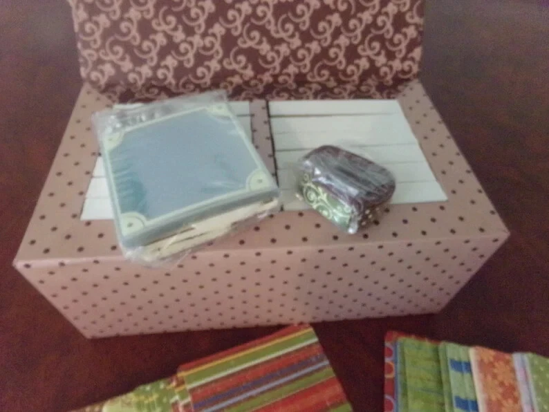 12 4x4 chipboard scrapbook albums.... all of the accessories to make all 12.... the albums are kept in a box for displaying.... in the kit are pre cut 4x4 scrapbook paper..... ribbons...brads...lettering stickers....labels... I bought this kit off of QVC...and I remember after I bought it they sold out.... I just do not have the time to make it.... I really do not know how many pieces, but I have never opened it and took it all apart other then to take the pictures... any questions please e-mail me