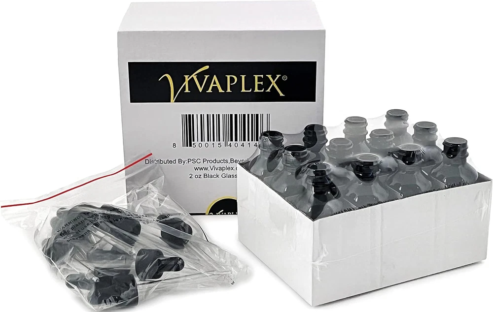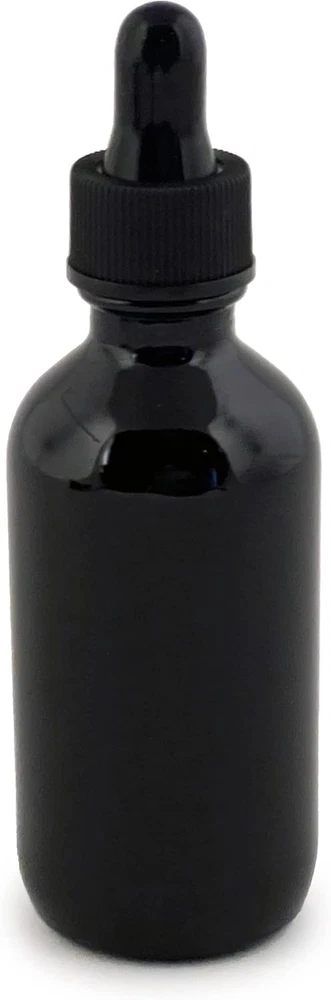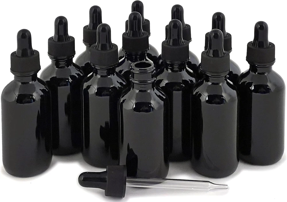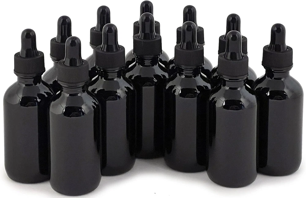 12 - 2 oz, Black Glass Bottles, with Glass Droppers, and Black Caps Perfect for essential oils, perfume oils, or other liquids. Safe, secure and convenient packaging Perfect for travel, and conveniently fits in your purse. These high quality black glass bottles with glass eye droppers, are perfect for storing your essential oils, perfumes or colognes. The Black glass provides protection from potentially harmful light and the convenient size makes it perfect for travel. The Eye Droppers allow for the perfect amount of product to be used every time.
