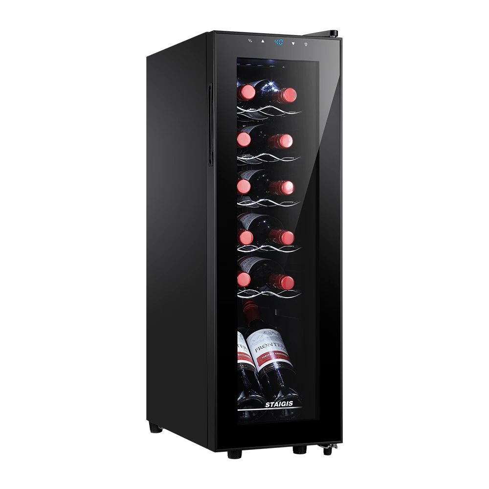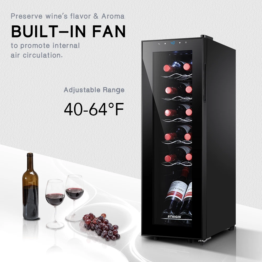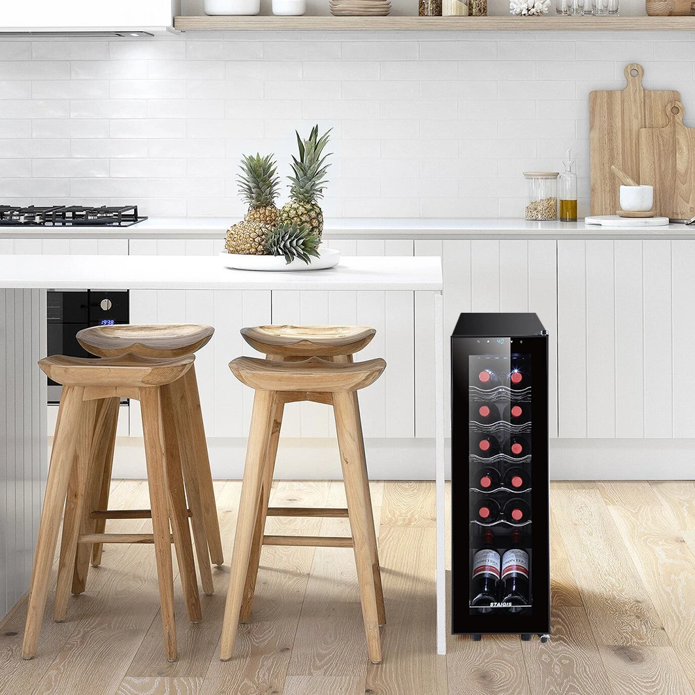 STAIGIS 12 Bottle Compressor Freestanding Wine Cooler - Our wine fridge features a special temperature stability function that maintains an optimal environment for any bottle of wine. Red, white, rose, or sparkling wine, all of your fine bottles will keep their unique flavor intact, allowing you to enjoy a unique tasting experience. the wine cooler cellar can hold up to 12 bottles and has a modern design that looks amazing in any home. LCD screen with touch function; Temperature range: 40°F to 66°F; Ensures a constant temperature; UV-resistant glass door; Made of plastic, glass, and metal; Stylish and minimalist design with silvery door frame; Capacity: 12 bottles; Ideal for red, white, rose, and sparkling wine; Luxurious housewarming present; Inner LED lighting; Sturdy seal. Keep your fine wine collection safe with the Staigis wine cooler! · Enhanced protection: this wine cooler refrigerator comes with a UV-resistant glass door that protects the wine. Also, the mini fridge features premium interior led light for an aesthetically pleasing effect. · Lcd touch panel: this 12-bottle wine refrigerator with a bright LCD display that allows you to easily modify and check the temperature. This allows you to adjust the temperature for different wines. · Enhance your wine-tasting experience and keep your collection safe with the Staigis wine fridge! · Large storage capacity: our small wine cooler the maximum capacity can hold up to 12 bottles. With five removable shelves and a display shelf. This wine fridge is perfect for storing and displaying your collection. · Temperature stability function: with advanced compressor technology, this wine refrigerator maintains a 40 ℉ to 66 ℉ temperature range and an optimal environment regardless of the outer oscillations.