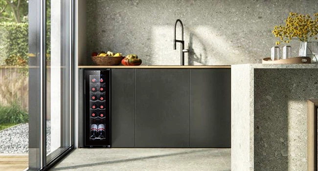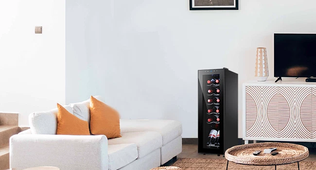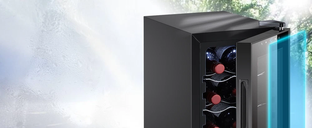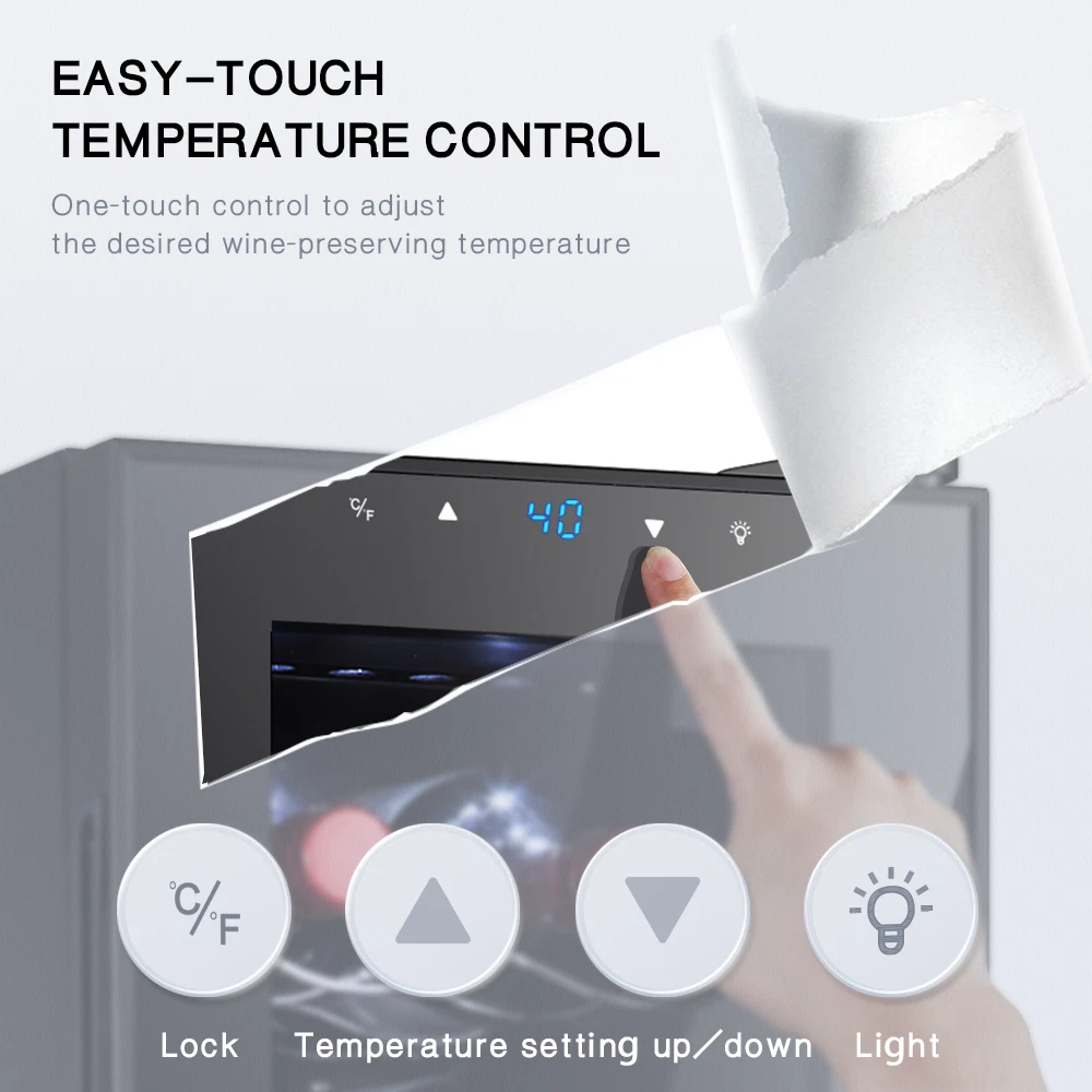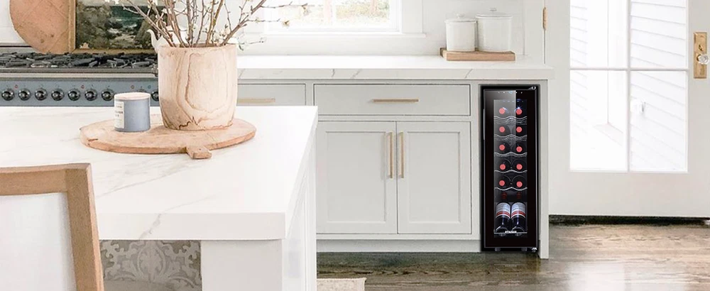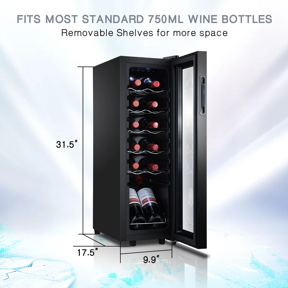 STAIGIS 12 Bottle Compressor Freestanding Wine Cooler - Our wine fridge features a special temperature stability function that maintains an optimal environment for any bottle of wine. Red, white, rose, or sparkling wine, all of your fine bottles will keep their unique flavor intact, allowing you to enjoy a unique tasting experience. the wine cooler cellar can hold up to 12 bottles and has a modern design that looks amazing in any home. LCD screen with touch function; Temperature range: 40°F to 66°F; Ensures a constant temperature; UV-resistant glass door; Made of plastic, glass, and metal; Stylish and minimalist design with silvery door frame; Capacity: 12 bottles; Ideal for red, white, rose, and sparkling wine; Luxurious housewarming present; Inner LED lighting; Sturdy seal. Keep your fine wine collection safe with the Staigis wine cooler! · Enhanced protection: this wine cooler refrigerator comes with a UV-resistant glass door that protects the wine. Also, the mini fridge features premium interior led light for an aesthetically pleasing effect. · Lcd touch panel: this 12-bottle wine refrigerator with a bright LCD display that allows you to easily modify and check the temperature. This allows you to adjust the temperature for different wines. · Enhance your wine-tasting experience and keep your collection safe with the Staigis wine fridge! · Large storage capacity: our small wine cooler the maximum capacity can hold up to 12 bottles. With five removable shelves and a display shelf. This wine fridge is perfect for storing and displaying your collection. · Temperature stability function: with advanced compressor technology, this wine refrigerator maintains a 40 ℉ to 66 ℉ temperature range and an optimal environment regardless of the outer oscillations.