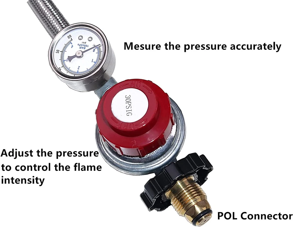 Measure Your Pressure : Use the pressure gauge to determine and regulate your propane PSI. Measuring from 0-60 psi (as well as 1-4 100xKPA), the Pressure Gauge lets users control their heat with a precise level of accuracy End Fitting to Appliance : 3/8” female flare fitting,fit for gas grills, gas stoves, turkey fryers, burners, smokers, cooker, fire pit and heater, hot water heater, as long as your appliance connection is 3/8’’ male flare connector Durable Material Design: The propane hose body is made of stainless steel it will long lasting for your appliance, provides secure, airtight connection between grill and turkey fryer or burner and tank Hose Connector to Propane Tank: Black part fitting is POL connector, you can directly connect your 40 Pound propane tank to 100 Pound, Don't need to move your atmospheric bottle Propane regulator and hose has excess flow protection and will automatically shut off, easy to install your propane bottle and propane appliance 0-30 PSI High Pressure Adjustable Propane Regulator with Gauge is your best choice. The propane has a Gauge that will tell youhow much pressure you are turning the knot to release gas,Let you adjust yourfire better,make your stove/Grill/Buner/Smoker/turkey fryerslike new. If the stove/Grill/Buner/Smoker and moreactually needs more or less pressure, you can adjust it with this instead ofjust being screwed by having the default regulator pressure. The propane hose body is made of stainlesssteel it will long lasting for your appliance, Prevent being bitten by smallanimals This propane hose with regulator has excessflow protection and will automatically shut off. Protect you from danger.