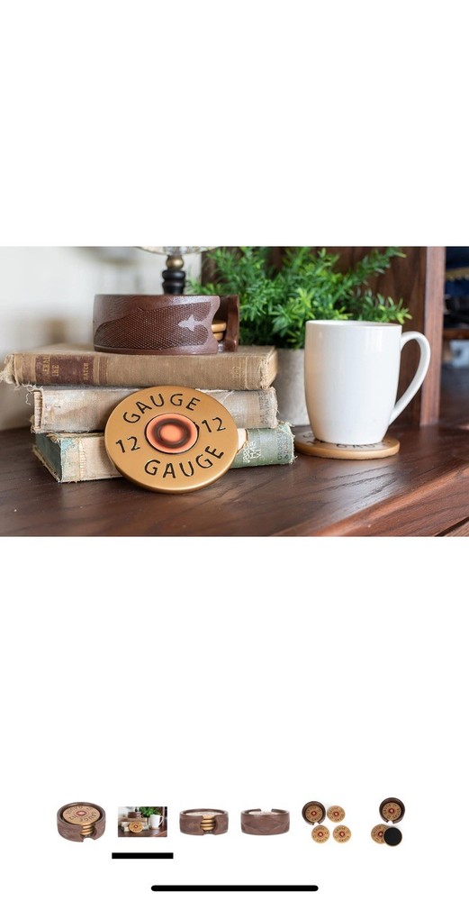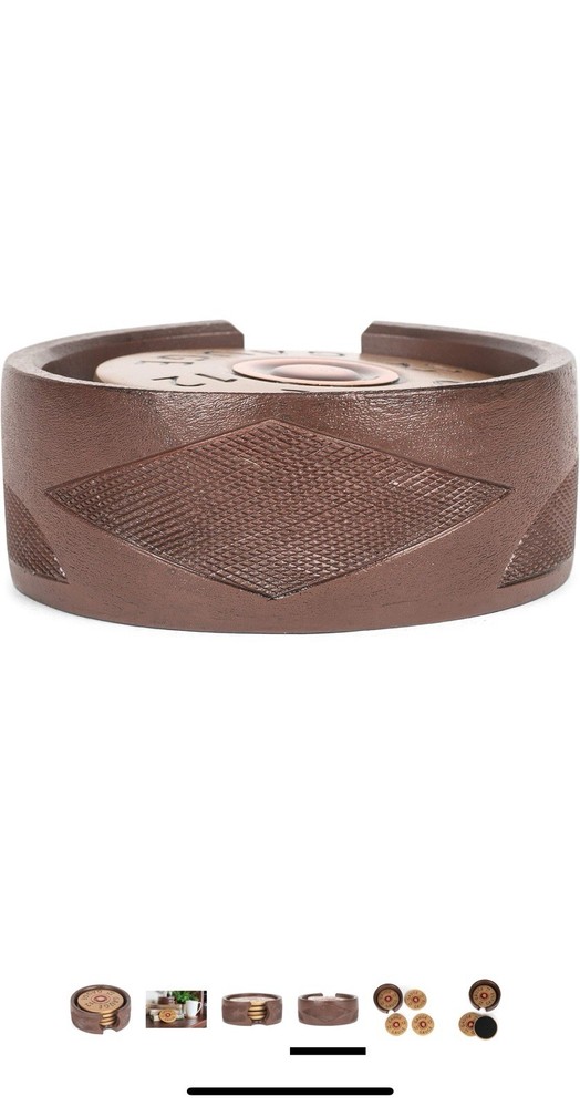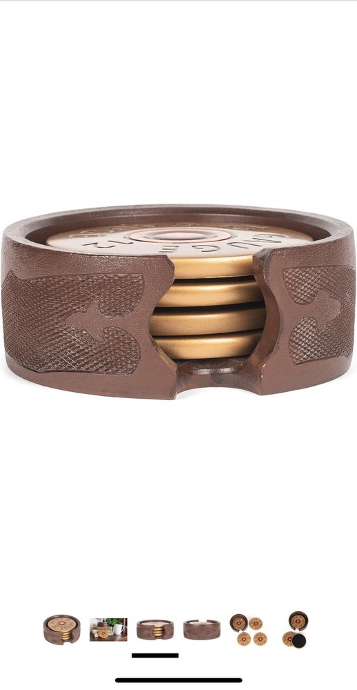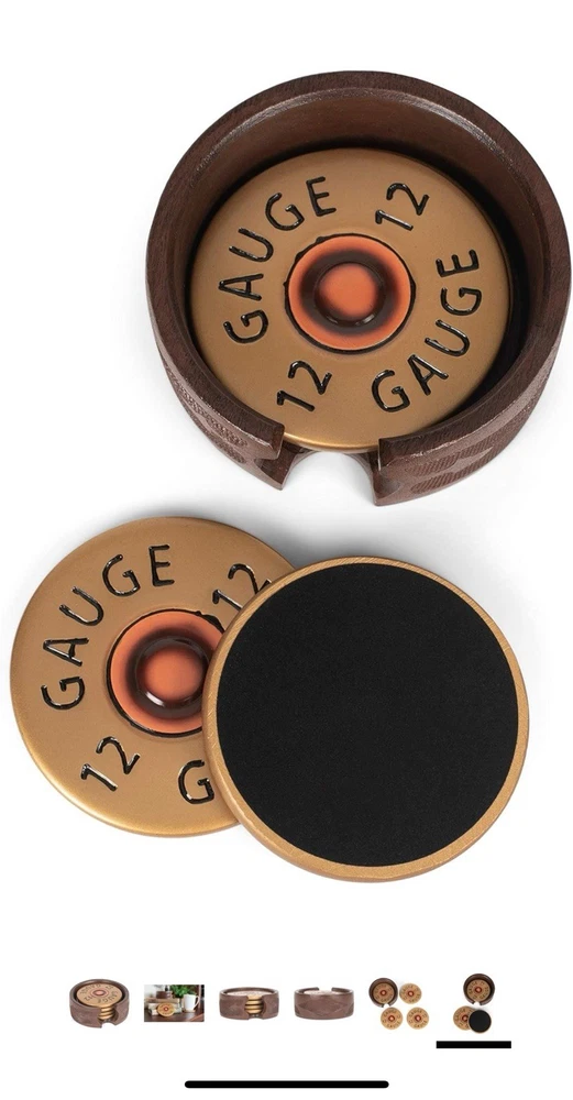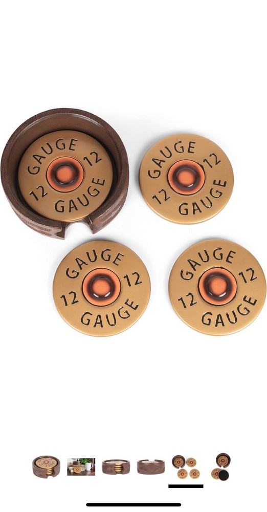 This 12 Gauge Shotgun Shell Coaster Set includes 4 round coasters and 1 holder, all featuring a unique shotgun shell pattern. The coasters are designed with a multicolor finish and made of copper, brass look, and resin materials, adding a touch of country style to any table setting. The stackable and slip-proof coasters are perfect for all occasions, especially for those who appreciate hunting themes in their decor. The coasters have a diameter of 3.75 inches, making them a practical and decorative addition to your home.