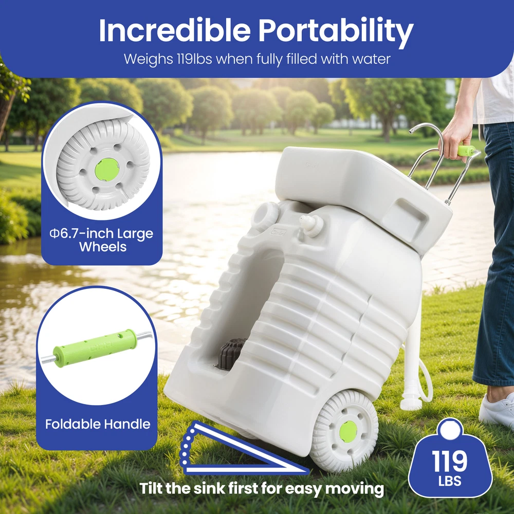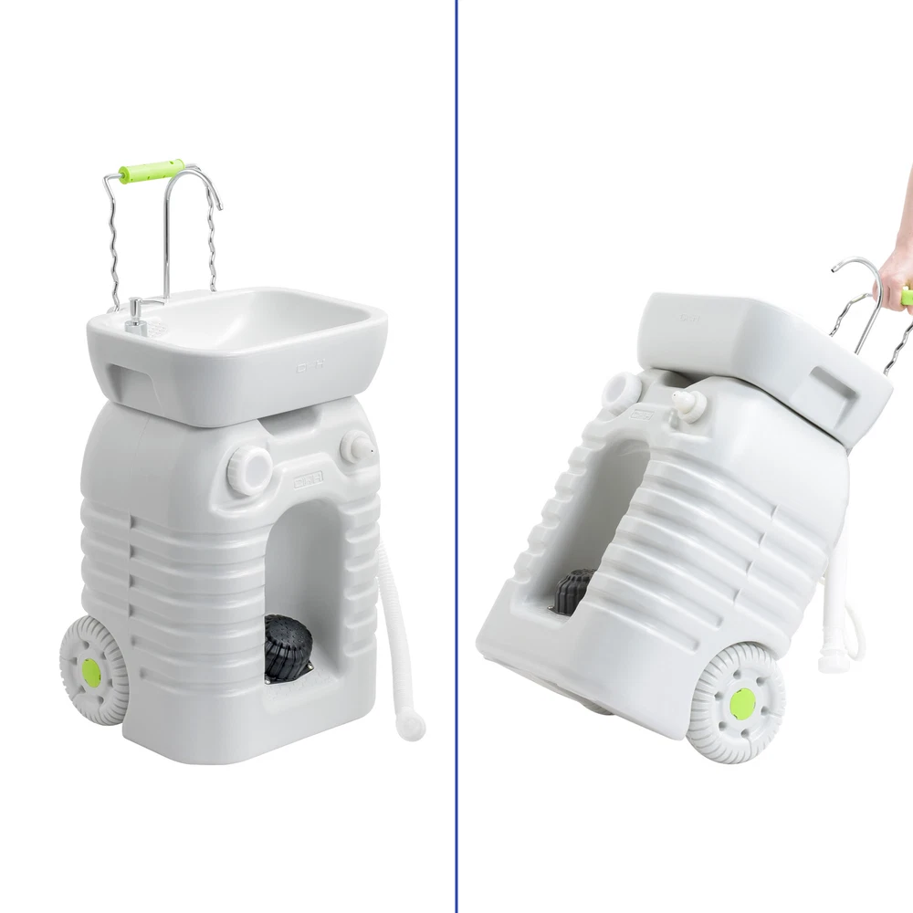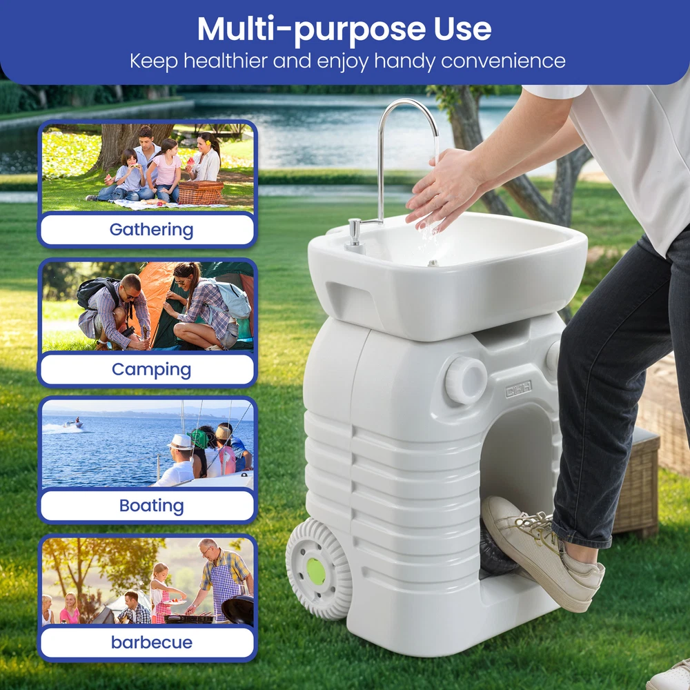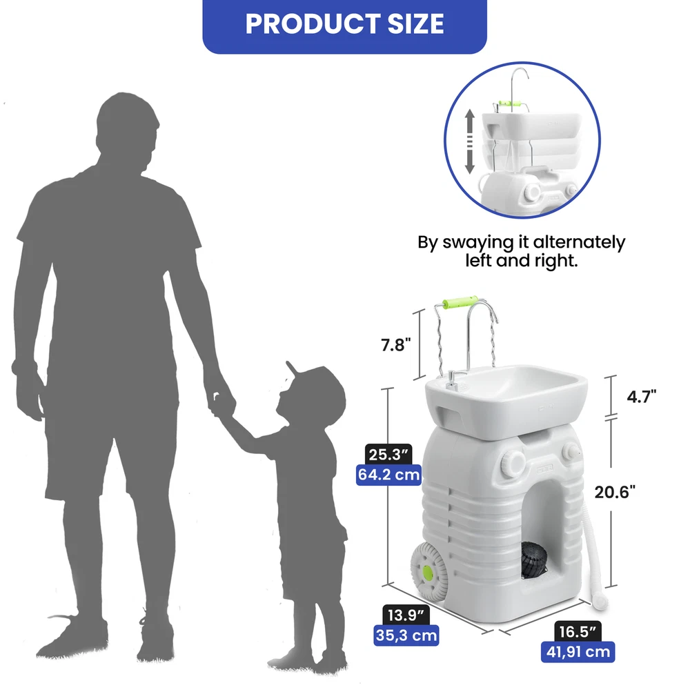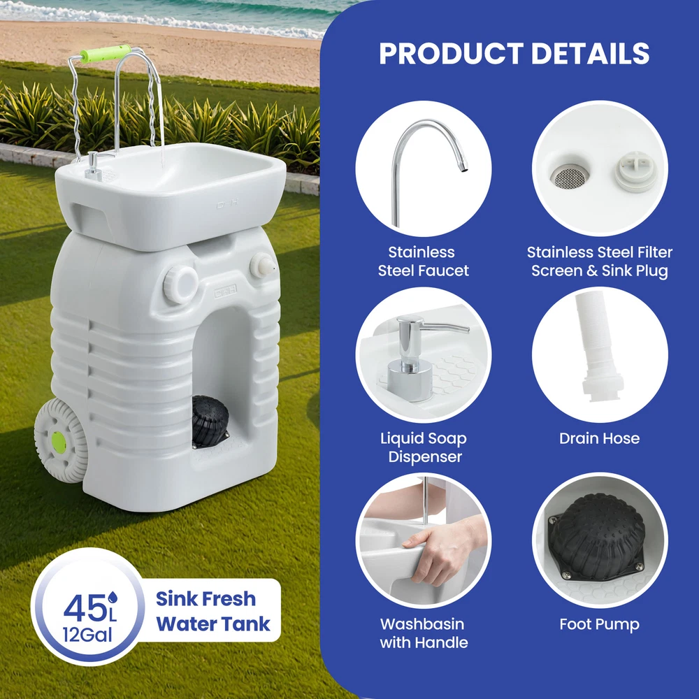12 Gallon Portable Hand Wash Sink Station 45L Basin Stand Camping RV Travel Product Description NOTE: Professional Installation would be Highly Recommended. Description: 1. Color: White 2. Material: HDPE+PP 3. Suitable for: Gathering, Camping, Travel, Indoor, Outdoor, Picnic, Hiking, Indoor. 4. Special Design: Portable, Stainless Steel Faucet, Filter Screen & Sink Plug, Liquid Soap Dispenser, Drain Hose, Foot Pump, Large Wheels, Foldable Handle, Adjustable Height Basin, Washbasin with Handle, Easy to Move. Features: 1. Portable Sink: This portable hand washing station provides maximum convenience with its detachable sink and water tank. It can be easily set up on the ground or any other location. The design ensures quick access to clean water whenever needed. Ideal for various settings, it offers a practical solution for handwashing on the go. 2. Large Capacity: This hand washing station features a large 45L (12 gallon) clean water tank, reducing the need for constant refilling. The user-friendly foot pump provides a steady stream of 200ml of water with each press. This ensures a smooth and efficient handwashing experience. It combines convenience and practicality for all your handwashing needs. 3. Adjustable Height: This portable camping sink features an adjustable height that swings, eliminating the need to bend down. It's designed to be comfortable and accessible for people of all ages, including children, adults, and seniors. The adjustable height ensures ease of use for everyone. This thoughtful design prioritizes user comfort and convenience. 4. Easy to Move: This portable handwashing station boasts a sturdy top handle and two large wheels for effortless transport to any location. The compact design makes it perfect for both indoor and outdoor use, and it can even be conveniently placed near portable toilets or sewage tanks for added hygiene. 5. Versatile Application: This portable handwashing station offers a convenient hygiene solution for a variety of activities, including camping, travel, picnics, and hiking. It's ideal for use at RVs, vehicles, boats, gardens, weddings, and construction sites without access to proper facilities. Wherever you are, it ensures you have a reliable way to wash your hands. It’s the perfect portable option for maintaining cleanliness on the go. Dimensions: 1. Product Dimensions: 16.5"L X 13.9"W X 25.3"H 2. Fresh Water Gallon Dimensions: 20.6"H 3. Wash Basin Height: 4.7"H 4. Metal Handle Height: 7.8"H 5. Sink Fresh Water Tank Capacity: 12 Gal (45L) 6. Soap Dispenser Capacity: 1.6 Gallons (6L) 7. Water Outlet Type:Foot Pump 8. Item Weight: 15.87 lbs 9. Weight When fully filled with water: 119 lbs Package Included: 1. 1 × Portable Handwashing Station 2. 1 × User Manual Shipping 1. Normally the item will be dipatched within 1 business day if payment is cleared before 12pm PST. 2. Please verify the correct shipping address in your PayPal account before making the payment. We only dispatch the item to the address that is sent to us at the time of checkout. 3. We don't ship to Hawaii, Alaska, Puerto Rico, APO/FPO/PO Boxes. 4. We don't provide local pick-up service. 5. Normally we will use USPS, UPS, FedEx & LTL to dispatch items. Payment 1. We accept PayPal and credit card. 2. We will ship to the confirmed Paypal shipping address that is provided with the payment only. Return 1. 30 days Money Back Guarantee. 2. Please contact our customer service to receive a RMA form first if want to return the item. 3. All returned items MUST in new condition with the original package. Contact If has any problem, please contact us by sending an ebay message. Our customer service will resolve the problem as soon as possible. On Jul 11, 2024 at 03:55:50 PDT, seller added the following information: On Jul 16, 2024 at 10:27:24 PDT, seller added the following information: On Jul 21, 2024 at 22:20:32 PDT, seller added the following information: On Aug 11, 2024 at 21:42:38 PDT, seller added the following information: On Sep 3, 2024 at 23:14:49 PDT, seller added the following information: On Oct 15, 2024 at 00:17:45 PDT, seller added the following information: On Nov 23, 2024 at 09:46:02 PST, seller added the following information: On Dec 13, 2024 at 13:26:50 PST, seller added the following information: