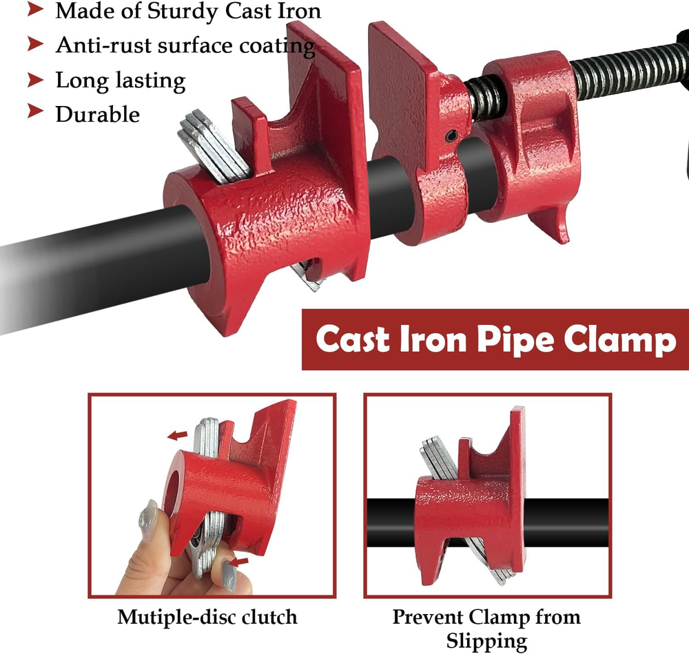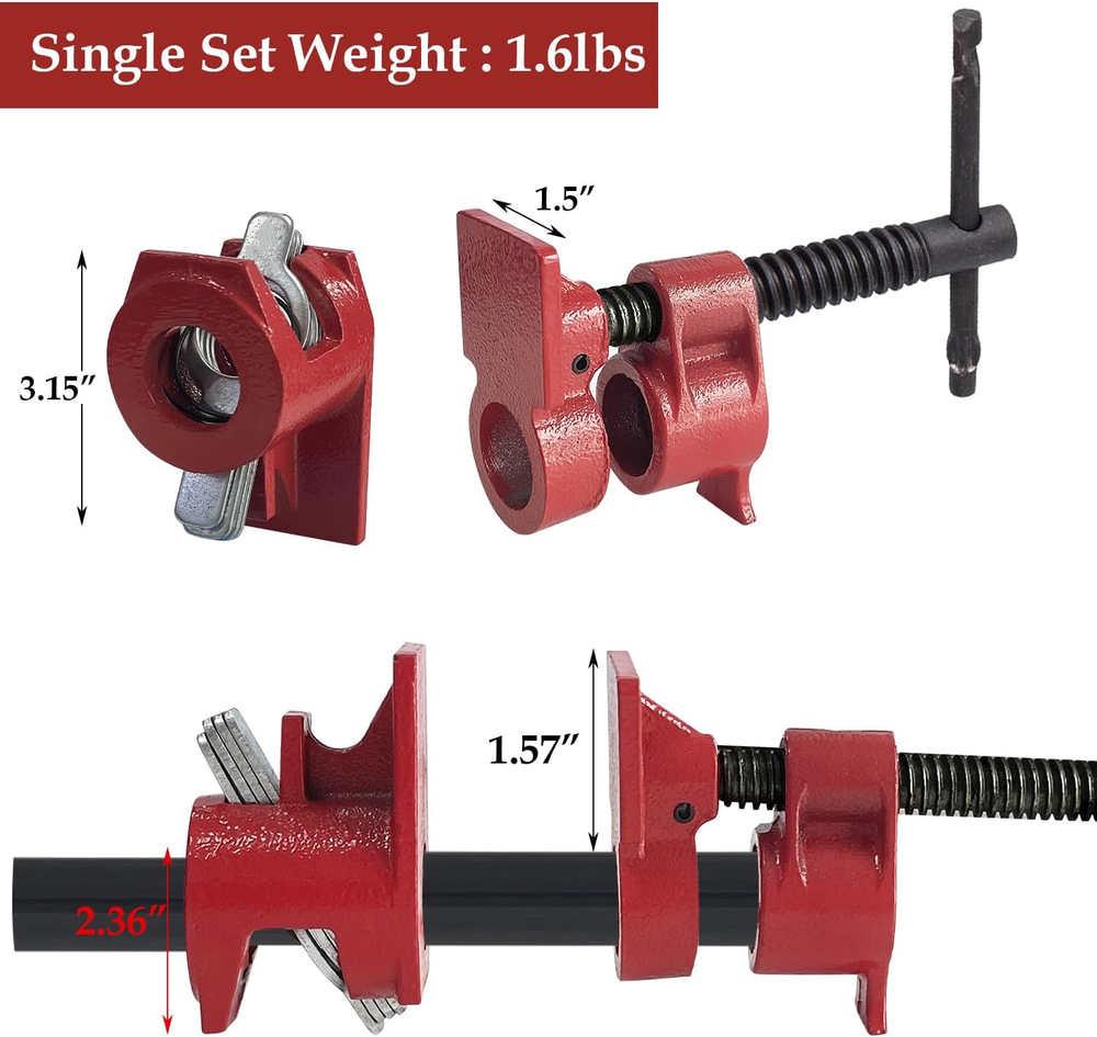 Store New Arrivals Add to Favorite View Feedback Contact Pipe Clamps 1/2 Inch 2 PACK Wood Gluing Pipe Clamp Set Bar Clamps Heavy Duty Woodworking Cast Iron Clamp Fixture (1/2 Inch) Description Item model number clamp pro50 Style 1/2 Inch Power Source hand_powered Color Red Material Cast Iron Country of Origin China Batteries Required? No Item Weight 1.62 Kilograms Batteries Included? No Package Dimensions 6.73 x 4.96 x 4.29 inches Included Components clamps Package Include 2 sets of 1/2-inch pipe clamps, total weight is about 3.3lbs. Made of premium cast iron with painted surface which is rust-resistant and wear-resistant, our clamps are durable and designed for long service time. Ergonomic design providing smooth rotary, comfortable operation and reduced hand fatique. Easy to assemble, just insert pipe into threaded end of the pipe clamp, another section slides along the pipe to match the size of your working piece. Perfect for assembly, gluing, construction, maintenance and woodworking projects. Product Description Features Premium Material Made of premium cast iron with painted surface which is rust-resistant and wear-resistant, our clamps are durable and designed for long service time. Multiple Plate Clutch Pipe clamps with four plate clutch for heavy duty woodworking, could prevent pipes from slipping. Ergonomic Handle Ergonomic design providing smooth rotary, comfortable operation and reduced hand fatique. Adjustable Clamp Length Easy to assemble, just insert pipe into threaded end of the pipe clamp, another section slides along the pipe to match the size of your working piece. Practical Tool Perfect for assembly, gluing, construction, maintenance and woodworking projects, ensure professional and efficient woodworking operations. ABOUT US We offer the best prices around on high quality products. Our E-store includes media such as books, movies, music and games while offering electronics, toys, sporting apparel, clothing, tools, general home, garden items and more. SHIPPING We are always working hard to ensure your package arrives as soon as possible. Please understand that some factors like weather, high postal traffic, and the performance of shipping companies are outside of our control. We offer free shipping to the lower 48 states and ship within 2 business days of payment, usually sooner. We do not accept P.O. Boxes. Please provide a physical address. RETURNS We offer a 30-Day Return Policy on items which you are not completely satisfied with. You have the option for a full-refund or an exchange of the item. No returns are available on items shipped outside of the USA. PAYMENT We accept PayPal. CONTACT US This page content is yet to come Please ad us to your favorite seller and visit again later Thank You CUSTOMER SATISFACTION We try our very best to make sure every customer is completely satisfied. If there's a problem, message us! We're happy to help.