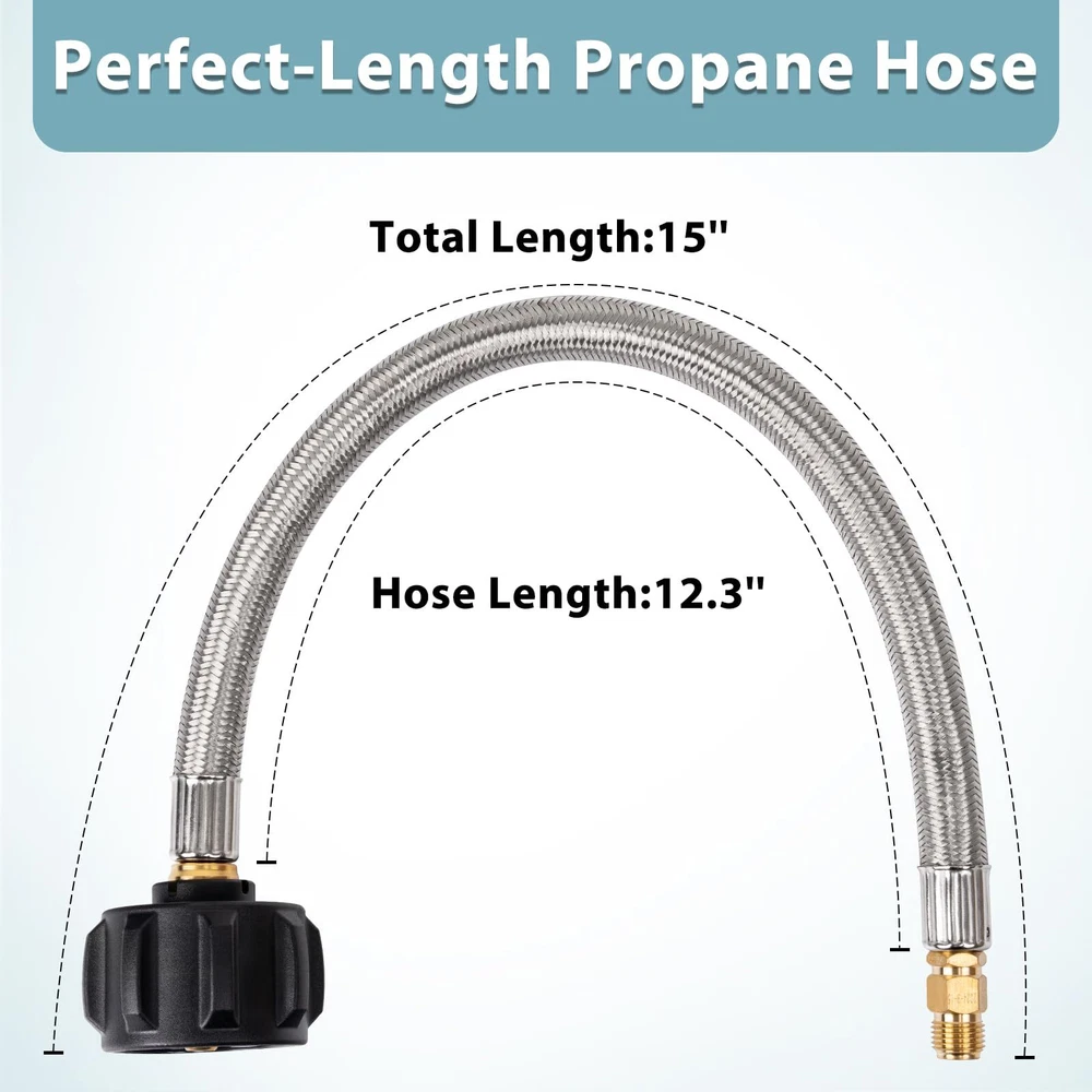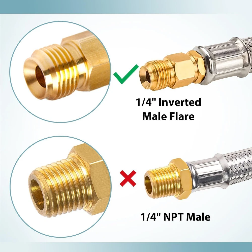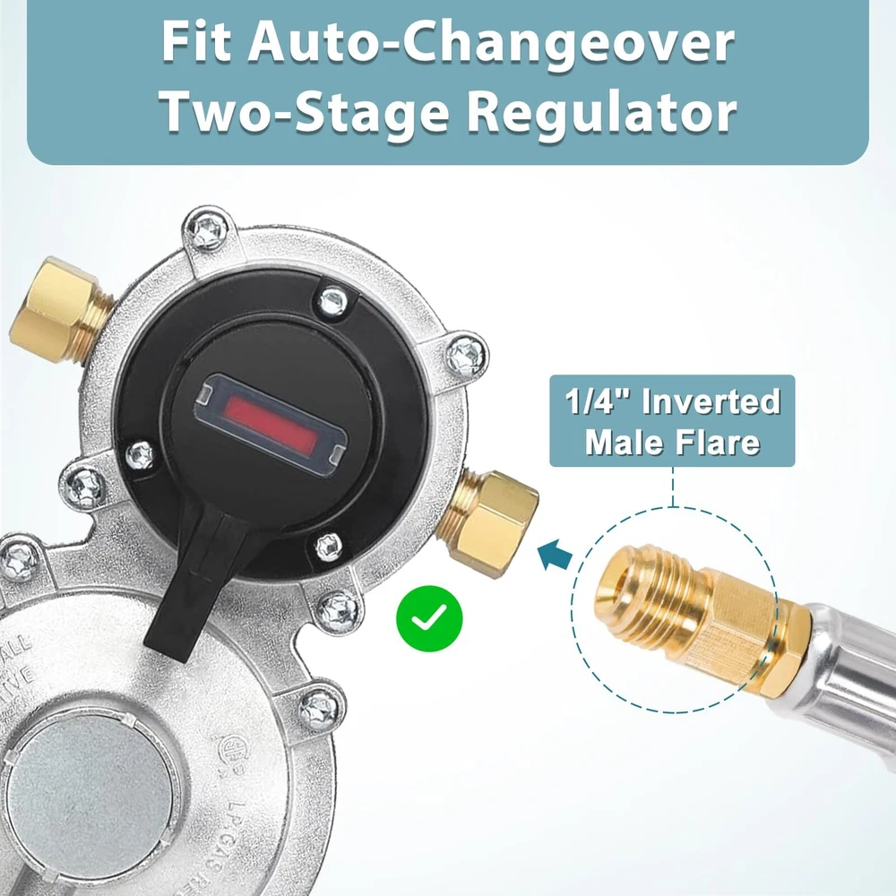 Standard Connector: QCC-1 x 1/4" Inverted male flare. (NOT 1/4" male NPT) Application: Connect your camper's propane tanks to the 2-Stage auto changeover LP propane gas regulator to a 5lb-20lb LP propane tank.Perfect for Flame King, Camco, Fairview and more More Durable: Stainless braided camper gas line replacement effectively reduces damage caused by friction and animals Safety: The well-machined thread ensures your safe and leak-free operation. Suitable for BBQ, RV and camping needs or having an outdoor cookout Easy to Install: Propane pigtail hose can be quickly and easily connected to propane tanks and RV's two-stage regulators without tools