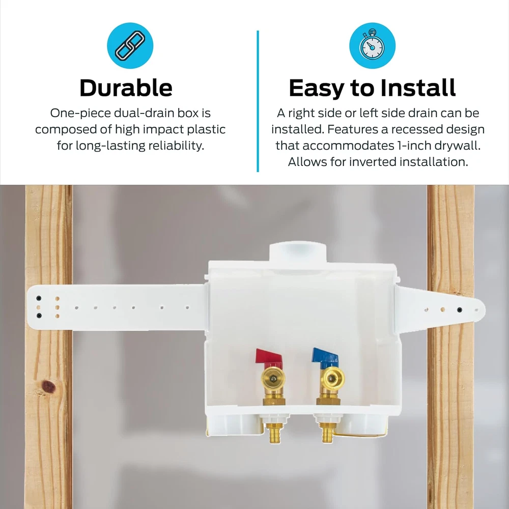 1/2 Inches Crimp PEX Connection X 3/4 Inches MHT Washing Machine Outlet Box New Eastman 1/2 Inch Crimp PEX Connection x 3/4 Inch MHT Washing Machine Outlet Box, Push to Connect Brass Plumbing Fittings, Double Drain, 60245 Product Description: The Eastman 1/2 Inch Crimp PEX Connection x 3/4 Inch MHT Washing Machine Outlet Box is a reliable and durable solution for organizing and securing washing machine water supply lines. Designed with push-to-connect brass fittings for easy installation, this outlet box features a double drain system for efficient water management. Its sturdy construction and compact design make it ideal for residential laundry spaces, providing a clean and professional look. Features: Easy Installation – Equipped with push-to-connect brass fittings, allowing for quick and hassle-free installation without the need for special tools. 1/2 Inch Crimp PEX Connection – Compatible with PEX plumbing systems, ensuring a secure and watertight connection for reliable performance. 3/4 Inch MHT Outlet – Standard male hose thread outlet accommodates washing machine hoses for a perfect fit. Double Drain System – Features dual drain openings to effectively manage water discharge, reducing the risk of leaks and overflow. Durable Construction – Made from high-quality materials, designed to withstand high water pressure and long-term use. Compact & Space-Saving Design – Fits neatly into laundry areas, providing an organized and professional installation appearance. Versatile Application – Suitable for both residential and commercial laundry setups, offering a dependable water supply connection. Style Crimp PEX (1807) Connection Pattern Outlet Box Warranty Description N/a. Batteries Included? No Batteries Required? No Finish Painted Product Dimensions 4"D x 9"W x 10.25"H Material Plastic Installation Type Screw-In Item Package Quantity 1 Item Weight 1 pounds Part Number 979757 Color White Finish Type Painted Voltage 1 Volts Included Components outlet box Size 1/2 in. PEX Connection Shipping Fast shipping is very important for us. Our standard USA shipping service is FREE. Your order will be shipped within 1-2 business days upon full payment received. Your order will be delivered within 1-3 business days after the handling time. We only ship to the confirmed address. We reserve the right to cancel any order for any reason at any time. We are not responsible for undeliverable addresses. Returns and payment We offer a 30 days return policy from checkout winning date. FeedBack Your feedback very important to us, after you get your package and you are satisfied with our service please leave us positive feedback If you have any problem with your order / any questions please before leave any type of feedback For any questions, using eBay contact system Please visit our eBay store to check out other items for sale! Thank you for shopping at our store.