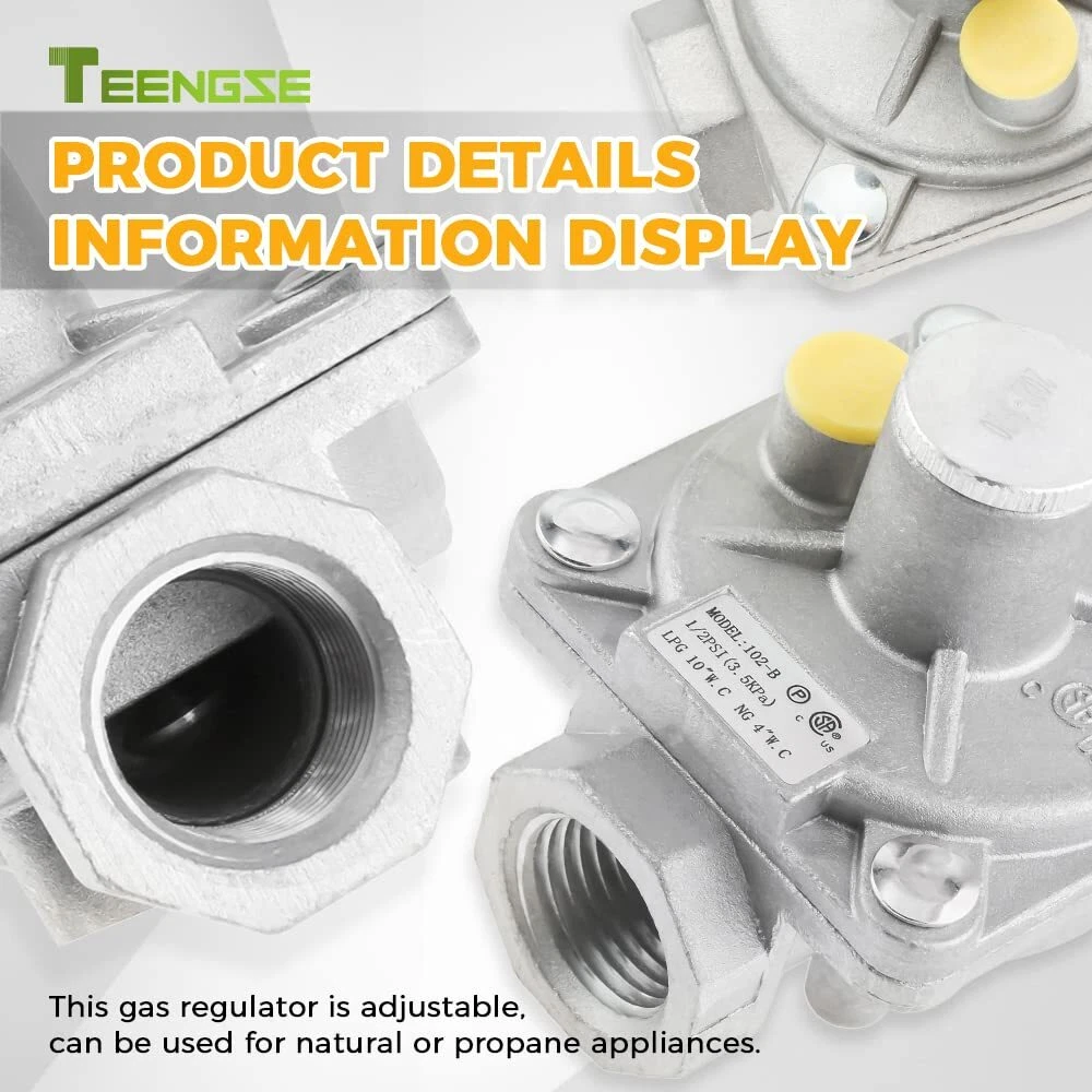 【SPECIFICATIONS】The 1/2 PSI gas regulator of the 102-B model fit for natural gas and liquefied gas valves. Both the inlet and outlet of the valve are 1/2" FPT pipe threads. We additionally furnish a brass 1/2" NPT conversion adapter-1/2" NPT male x 3/8" flare male. 1/2" NPT male x 1/2" NPT male. Plus joint thread tape. 【INSTRUCTIONS FOR USE】When the LPG gas regulating valve is used: LP inlet pressure is 2.74Kpa(11"w.c), outlet pressure is 2.45~2.55 kpa(10"w.c), and gas flow rate is 30L/min; when the natural gas regulating valve is used: LP inlet pressure is 1.74Kpa(7"w.c). Outlet pressure is 0.95~1.05 kpa(4"w.c), flow rate: 50L/min 【CONVENIENCE USE】This gas regulator is adjustable, which can be used for natural or propane application, but original setting is LP state. Please unscrew the 20.3mm diameter aluminum knob in the gas valve to switch the direction of the LP/NG copper shaft core. It is more simple, fast, and convenient. 【PERATE TEMPERATURE】32°F-225°F (0°C-107°C). Do not install the regulator too close to the heating equipment or use in very cold environment. Heat or cold can change the resistance of the spring inside the regulator. And the gas pressure regulator will not turn off the flow of gas. 【APPLICATION】This natural gas pressure regulator fit for natural gas grills, heater, oven, gas welding equipment, NG gas and liquefied interchange pressure regulator, etc.