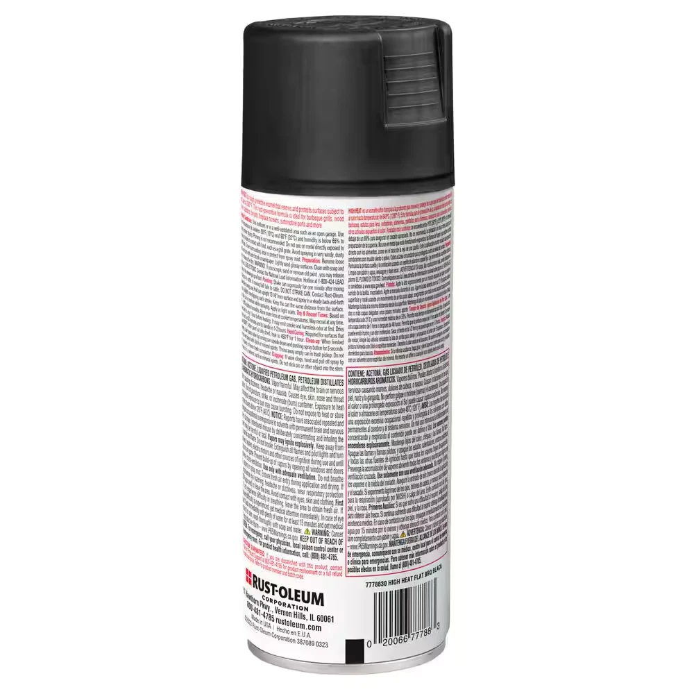 Fast Shipping On All Items 30 Days Money Guarantee Customer Support Excellent Service 100% Satisfaction Satisfaction Guaranteed 12 Ounce High Heat Flat Bar-B-Que Black Interior/Exterior Spray Paint Specification Application Rubberized Coatings & Dips Application Method Aerosol Base Material Oil Based Coating Product Category Paint Color Family Black Color/Finish Black Coverage Area (sq ft) 15 Dry to Touch (min) 20.0 min Interior/Exterior Exterior,Interior Number per Package 1 Paint & Primer in One No Paint Key Features High Heat,Rust Preventative Paint Product Form Aerosol Spray Paint/Stain Clean Up Mineral Spirits Returnable 90-Day Sheen Flat/Matte Surface Material Use Metal Transparency Solid Manufacturer Warranty Satisfaction guaranteed for full refund of purchase price Container Size 12 Ounce . Weight: 12.0 oz Item Description High heat spray paint resists temperatures up to 1200°F Tough protective enamel offers excellent color retention Covers up to 8 sq. ft. per can for indoor or outdoor use The Rust-Oleum Specialty 12 oz. High Heat Aerosol Paint works well on grills, wood-burning stoves, engines and other metal items. It comes in a variety of colors and is great for use in temperatures up to 1,200 degrees fahrenheit. The paint is rust and corrosion resistant for durability. About us We offer the best prices around on high quality products. Our E-store includes media such as books, movies, music and games while offering electronics, toys, sporting apparel, clothing, tools, general home, garden items and more. Shipping We are always working hard to ensure your package arrives as soon as possible. Please understand that some factors like weather, high postal traffic, and the performance of shipping companies are outside of our control. We offer free shipping to the lower 48 states and ship within 2-3 business days of payment, usually sooner. We do not accept P.O. Boxes. Please provide a physical address. For shipping outside of the continental USA, we only use eBay's Global Shipping Program.The item is shipped to KY and then sent to the rest of the world. International customers are responsible for all duties and taxes. Continue to check out to calculate costs for shipping the item to your country. Messages regarding eBay's Global Shipping Program MUST be directed at eBay EXCLUSIVELY. Returns We offer a 30-Day Return Policy on items in which you are not completely satisfied with. You have the option of a full-refund or an exchange of the item. No returns are available on items shipped outside of the USA Satisfaction We try over very best to make sure every customer is completely satisfied. If there's a problem, message us! We're happy to help. Payment Options Shop With Confidence