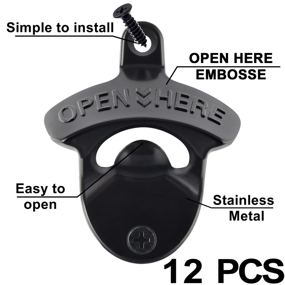 Cost-effective: 12 PCS black rustproof bottle cap opener wall mount and 12 pairs of black stainless mounting screw include of the box Durable and Embossed Design: The black soda beer bottle opener table mount is made of high-quality stainless materials with "OPEN HRER" embossed finish, suitable for indoor or outdoor use Mounting Screws Included: black post mounted bottle top opener (3.15x2.56x1.14 inches) contains mounting screws, you only need to find the installation position to complete the installation of the wall mounted bottle opener -Handed Easy Opening: Effortlessly open bottles without spills or mess, even with just hand. This stainless screw in wall drink opener allows you to swiftly remove caps from your favorite beer or soda bottles Used in different occasions: This wall mounted bottle opener can be installed on wooden caddy, cooler, post, table, shelf, bench, as well as indoor and outdoor scenes such as garages, cabins, man cave, backyard kitchens