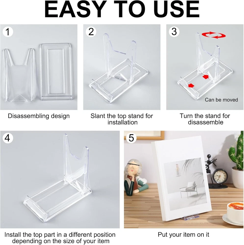 Free eBay listing template designed by dewiso.com 12 Pack Acrylic Book Stand for Display Adjustable Clear Display Holder Easel Collector Stand for Home Office Back to School Comic Album CD Magazine Postcard Artworks (4.2 x 4.3 x 2.35 Inch) FREE AND FAST SHIPPING! About this item Sufficient Quantity and Safe: this package includes 12 acrylic book stands, providing enough quantity to meet your various display needs; Each acrylic easel display stand is laser cut with smooth sides and rounded corners, ensuring the safety of users ranging from teenagers to adults, you don't need to worry about scratching your hands when placing items Adjustable and Convenient: the clear comic book stand consists of a base and a movable rear; Its height of about 4.2 inches, length of about 4.3 inches, and width of about 2.35 inches, adjustable range between about 0.8 inch and 3.5 inches, accommodate a range of 5-10 inches items; Plus, it's easy to install, reusable, and can be disassembled for storage after use, saving storage space and making it easy to carry Clear Book Stand: unlike wooden and metal display stands, our book stand is made of transparent acrylic; Its transparent and adjustable design will not obstruct the line of sight, has reasonable tilt angle to get better display, without ledge design allows for more fully displayed and it is easy to display your articles Quality Material and Stable Structure: the acrylic book stands for display are crafted from quality acrylic, they are transparent, robust, not easy to deform or break, and long time lasting; The plastic book display stands feature a stable triangular structure, enabling them to support books and items of different weights consistently and stably Multi-functional Stand: our clear, adjustable acrylic easel display stand can suitably showcase a wide variety of items such as books, photos, pictures, photos, and artworks; Its versatility makes it a nice addition to homes, offices, exhibition halls, shop windows, and museums Show more Product We offer a 30-Day Return Policy on items which you are not completely satisfied with. You have the option for a full-refund or an exchange of the item. No returns are available on items shipped outside of the US . Shipping We offer Free Shipping to the US and ship within 2 business days of payment, usually sooner. We use UPS express shipping. That's why your products are usually delivered within 3 days . Contact We try our very best to make sure every customer is completely satisfied. If there's a problem , message us! We're happy to help. 24/7 live chat available.