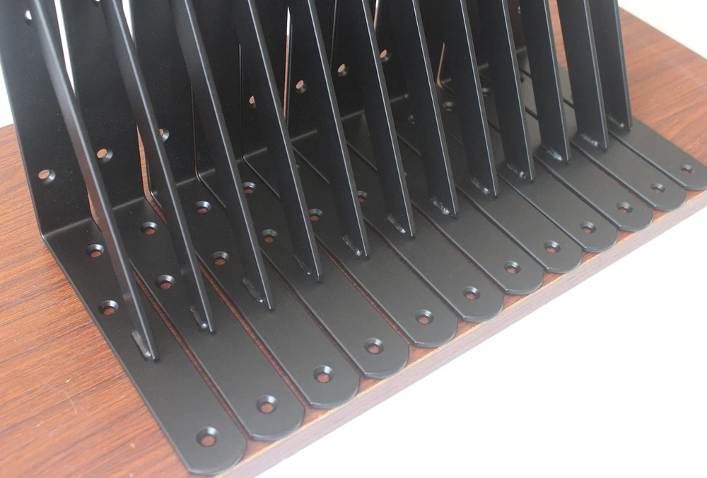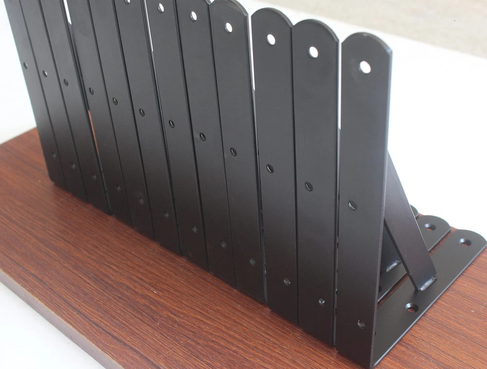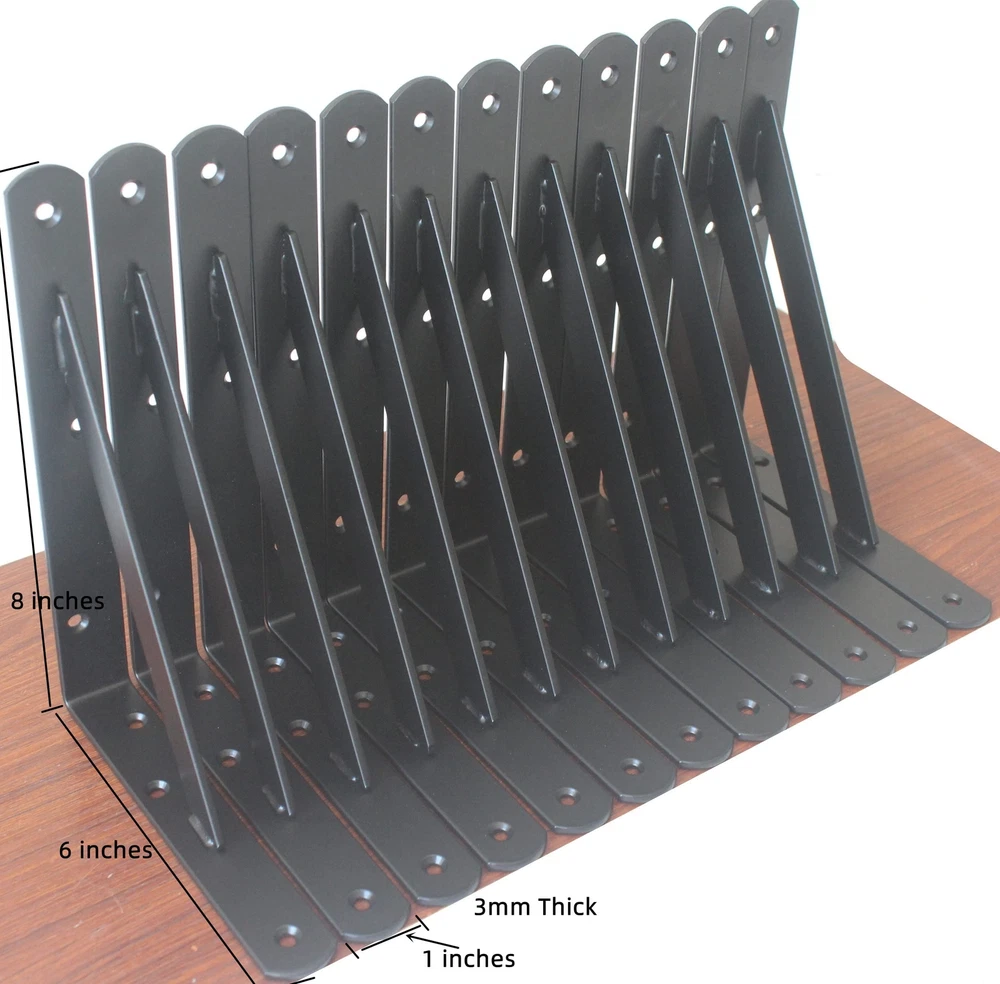 Size:L 8" x H 6" x W 1", 3mm Thick. Package included: 12 x Brackets , 36 x long Screws, 36 x short Screws(Wood plank is Not included)Our floating shelf brackets come with 12 brackets for your wall mounted shelves. Heavy Duty design, maxium support weight of 240lb for a pair of this shelf bracket. Designed to support 8 inches to 12 inches deep shelf. Matte black powder coat finish. resistant to corrosion and rust, durable. Creating a rustic, reclaimed, salvaged look,perfect for your home, office, garage, work space or anywhere else. Size:L 8" x H 6" x W 1", 3mm Thick. Package included: 12 x Brackets , 36 x long Screws, 36 x short Screws (Wood plank is Not included)Our floating shelf brackets come with 12 brackets for your wall mounted shelves. Our heavy-duty brackets can support Audio Equipment,bookshelf,kitchen ware,electric power tools , TV bench ,farm tools,etc. sturdy and durable: Made from steel, these shelf angle supports offer a strong bearing force , All screws included - Screws needed to install your new shelf brackets are included. 12-Pack shelf brackets: Maximize space with with style. Ideal for the kitchen, bathroom, bedroom, office & more. Our shelf brackets can be used as exhibition stand,bicycle stand,garden shelf, kitchen shelf,office shelf,etc Easy to Install design using basic DIY Tools. Easily mount your favorite shelves in your home office, bathroom, kitchen, living room, dining room, bedroom, garage