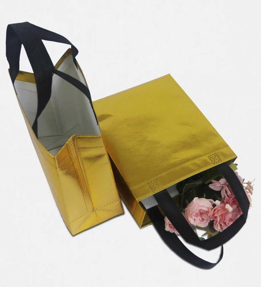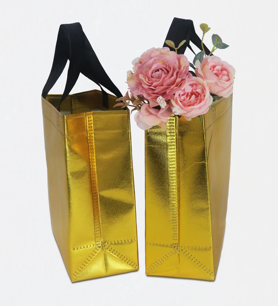 PREMIUM MATERIALS: This gold gift bags are made of high-quality non-woven fabric, so it can withstand heavier weight, stronger and not easy to break. ELEGANT & BEAUTIFUL: This shiny gift bags have a charming metallic luster on the surface, the appearance is beautiful gold, the handle is black, elegant and beautiful, fashionable and exquisite, as a gift bag is absolutely unique and attractive. REUSABLE: This reusable gift bags are made of strong and durable non-woven material, the surface is waterproof, the bottom is matched with cardboard, it can withstand heavier items, while ensuring that the bottom is flat, it can be used daily as a shopping bag, grocery bag, economical and practical. MULTIPLE OCCASIONS: This metallicl gift bags are suitable for various occasions, you can DIY various words and patterns with stickers or paint pens (please stay away from heat sources), which is very suitable for christmas, diwali, wedding, birthdays, party and other occasions. SIZE INFORMATION: The size of the gold gift bags are 8 x 4 x 10 inches/20 x 10 x 25 cm (L x W x H) , it can hold most gifts and enough party supplies.