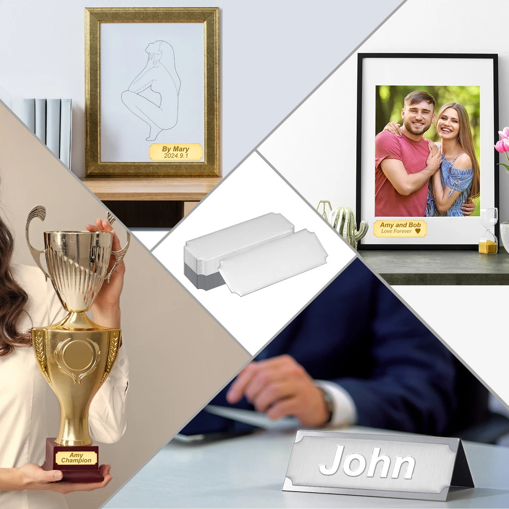Document Our engraved nameplates are perfect for mounting on plaques, picture frames, sweaters, trophies, bags, display boxes, flag cases, and anything else.SpecificationMaterial: Stainless SteelColor: Silver/Gold/BlackSize: 7.6 x 2.5 cm/3 x 1 Inch(L*W)Thickness: 0.4 mm/0.02 InchPacking List: 12 Pcs x Engraved NameplateAdvantageOur engraved nameplates are made of brushed stainless steel which is durable, stable, not easy to fade, rust, or break, and can be used for a long time. With a smooth surface, it will not scratch your skin.The right thickness makes the plate stronger and allows for deeper engraving. These elegant nameplates have a beautiful luster and a simple design. Suitable for various crafts to add brilliance.The protective film design can effectively prevent scratches. The adhesive backing design allows you to stick this nameplate anywhere without any tools and it can be firmly on the objects.InstructionPlace a metal workbench block underneath the blank stamping tags for better stamping.NOTE:1. There may be light scratches and blemishes due to shipping, but they can be polished.2. Only for laser engraving, not suitable for mechanical engraving.3. Please remove the protective film before use. 12 Pcs 3" x 1" Engraved Name Plate Picture Frame Label Art Tag,Silver/Gold/Black Our engraved nameplates are perfect for mounting on plaques, picture frames, sweaters, trophies, bags, display boxes, flag cases, and anything else. Specification Material: Stainless Steel Color: Silver/Gold/Black Size: 7.6 x 2.5 cm/3 x 1 Inch(L*W) Thickness: 0.4 mm/0.02 Inch Packing List: 12 Pcs x Engraved Nameplate Advantage Our engraved nameplates are made of brushed stainless steel which is durable, stable, not easy to fade, rust, or break, and can be used for a long time. With a smooth surface, it will not scratch your skin. The right thickness makes the plate stronger and allows for deeper engraving. These elegant nameplates have a beautiful luster and a simple design. Suitable for various crafts to add brilliance. The protective film design can effectively prevent scratches. The adhesive backing design allows you to stick this nameplate anywhere without any tools and it can be firmly on the objects. Instruction Place a metal workbench block underneath the blank stamping tags for better stamping. NOTE: 1. There may be light scratches and blemishes due to shipping, but they can be polished. 2. Only for laser engraving, not suitable for mechanical engraving. 3. Please remove the protective film before use. Hot Item Payment 1.We accept eBay payment . 2.Payment must be received within 7 business days of auction closing. Shipping 1.We ship to your eBay or Paypal address. Please make sure your eBay and Paypal address is correct before you pay. 2.Items will be shipped within 1-3 business day when we received payment. 3.Delivery time depends on destination and other factors. Description Policy 12 Pcs 3" x 1" Engraved Name Plate Picture Frame Label Art Tag,Silver/Gold/Black Our engraved nameplates are perfect for mounting on plaques, picture frames, sweaters, trophies, bags, display boxes, flag cases, and anything else. Specification Material: Stainless Steel Color: Silver/Gold/Black Size: 7.6 x 2.5 cm/3 x 1 Inch(L*W) Thickness: 0.4 mm/0.02 Inch Packing List: 12 Pcs x Engraved Nameplate Advantage Our engraved nameplates are made of brushed stainless steel which is durable, stable, not easy to fade, rust, or break, and can be used for a long time. With a smooth surface, it will not scratch your skin. The right thickness makes the plate stronger and allows for deeper engraving. These elegant nameplates have a beautiful luster and a simple design. Suitable for various crafts to add brilliance. The protective film design can effectively prevent scratches. The adhesive backing design allows you to stick this nameplate anywhere without any tools and it can be firmly on the objects. Instruction Place a metal workbench block underneath the blank stamping tags for better stamping. NOTE: 1. There may be light scratches and blemishes due to shipping, but they can be polished. 2. Only for laser engraving, not suitable for mechanical engraving. 3. Please remove the protective film before use. Hot Item Payment 1.We accept eBay payment . 2.Payment must be received within 7 business days of auction closing. Shipping 1.We ship to your eBay or Paypal address. Please make sure your eBay and Paypal address is correct before you pay. 2.Items will be shipped within 1-3 business day when we received payment. 3.Delivery time depends on destination and other factors.