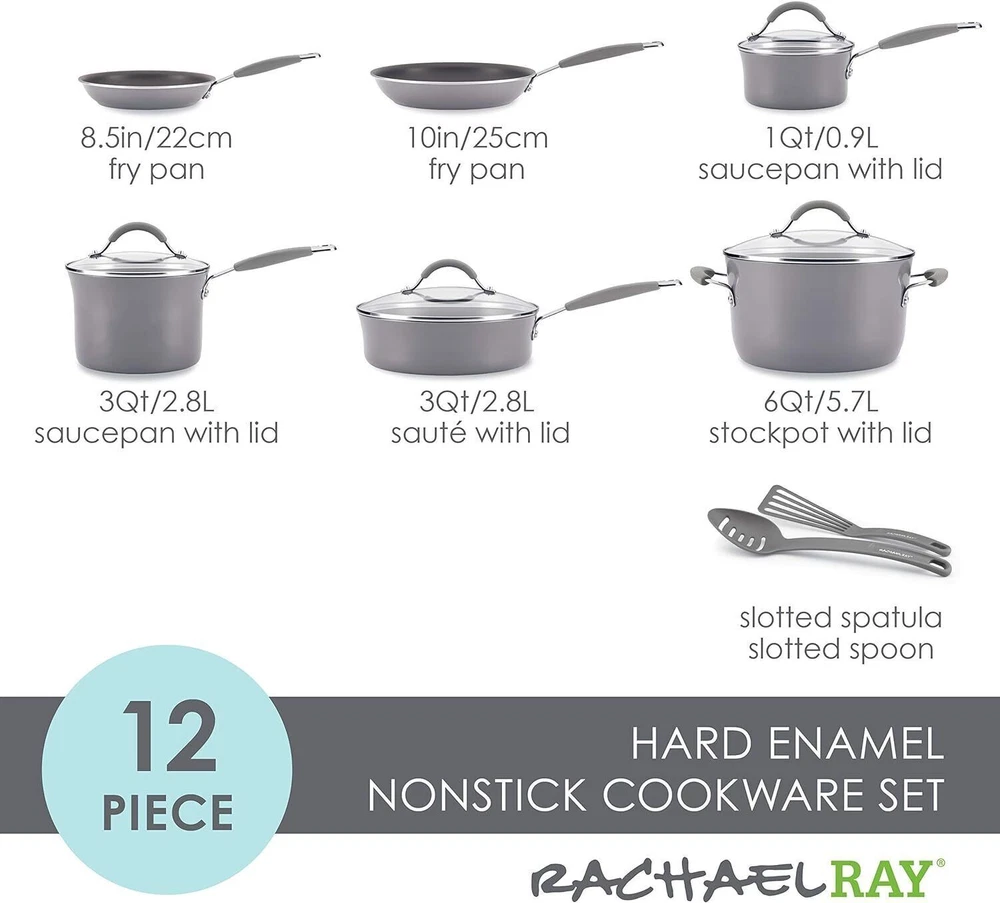 15.7" Square Iron Bonfire Pit Outdoor Camping Wood Burning Fire Pit 50.98 USD 54.23 USD Free shipping 6% off 26"Fire Pit Bowl Wood Burning Portable Outdoor Firepit Fireplace Camping Bonfire 157.03 USD 167.05 USD Free shipping 6% off 24"Round Fire Pit Grate w/10 Bars for Firepit Firewood Log Burning Rack Holder 58.04 USD 61.74 USD Free shipping 6% off 6-in-1 Hand Immersion Blender 1000W 12-Speed Handheld Blender with 600ml Beaker 50.98 USD 54.23 USD Free shipping 6% off 30" Backyards Fire Pit Poker Steel Firepit Tool with Built-in Bottle Opener NEW 49.54 USD 52.7 USD Free shipping 6% off 2-in-1 Portable Fire Pit with Pot Bracket & Carry Bag 8" Mini Tabletop Fireplace 48.87 USD 51.99 USD Free shipping 6% off Rustproof Shower Corner Caddy Organizer 4 Adjustable Shelves Tension Pole Holder 73.31 USD 77.99 USD Free shipping 6% off Tension Pole Shower Caddy 4 Basket Shelves Built-in Towel Bar Adjustable 60-97" 46.3 USD 49.26 USD Free shipping 6% off Electric Coffee Percolator 12 Cups Quick Brew Stainless Steel Easy Pour New 66.64 USD 70.89 USD Free shipping 6% off Set of 30 Clear Glass Bud Vases Thick Strong Wedding Centerpieces Decor New 48.77 USD 51.88 USD Free shipping 6% off Electric Lunch Box 80W Fast Heating Portable Food Warmer Dual Containers Travel 48.87 USD 51.99 USD Free shipping 6% off 54PCS Magnetic Nut Driver Set Impact Drill Driver Bit 1/4" Metric&SAE Nut Driver 48.87 USD 51.99 USD Free shipping 6% off About this item DURABLE DESIGN: Nonstick pots and pans from Rachael Ray are crafted with durable aluminum and sturdy hard enamel porcelain exteriors to stand up to busy kitchens ENHANCED NONSTICK: Cookware set features espresso-colored nonstick for effortless food release and easy cleanup CONVENIENCE AND CONTROL: The 12-piece nonstick cookware set boasts dual-riveted rubberized stainless steel handles and shatter-resistant glass lids; includes slotted turner and spoon OVEN SAFE: Oven safe to 400 degrees F, these versatile pots and pans are suitable for all stovetops except induction SET INCLUDES: 1-quart and 3-quart saucepans with lids, 6-quart stockpot with lid, 8.5-inch and 10-inch frying pans, 3-quart sauté pan with lid, slotted turner and spoon Dehydrated and Freeze-Dried Fruit Variety Pail Emergency Supply Survival Food 111.82 USD 118.96 USD Free shipping 6% off 12PC Metric Flex-Head Ratcheting Wrench Set 8-19 mm Ratchet Combination Wrenches 46.43 USD 49.39 USD Free shipping 6% off Heavy Duty 5 Tier Plastic Storage Shelf Home Garage Shelving Unit Shelves Rack 57.81 USD 61.5 USD Free shipping 6% off 1 Person Emergency Food Supply Kit 42 Serving Storage Quick Meal Survival Bucket 39.68 USD 42.21 USD Free shipping 6% off 24 In Smart TV HD 720P Resolution LED Display 60 Hz Refresh Rate W/Stand Class 107.82 USD 114.7 USD Free shipping 6% off Portable Baby Simple Highchair Folding High Chair Baby Chair w/Adjustable Tray 72.82 USD 77.47 USD Free shipping 6% off 8 Sheet Microcut Shredder w/Pullout Basket for Home Office Credit Card Shredder 99.08 USD 105.4 USD Free shipping 6% off 7-Piece King Size Reversible Blue Stripe Bed In a Bag Comforter Set with Sheets 58.22 USD 61.94 USD Free shipping 6% off Set of 6 File Crate Plastic Milk Storage Bins Basket Stackable Boxes Black NEW 43.45 USD 46.22 USD Free shipping 6% off 5-Shelf Wood Bookcase Storage Shelving Adjustable Framed Shelves Canyon Walnut 68.3 USD 72.66 USD Free shipping 6% off Portable Outdoor Propane Heater for Golf Cart with Gas Tank Stand Holder 6200BTU 67.2 USD 71.49 USD Free shipping 6% off Angle Head F1807 PEX Pipe Crimping Tool for Copper Rings 1" Angle Single Crimper 85.5 USD 90.96 USD Free shipping 6% off