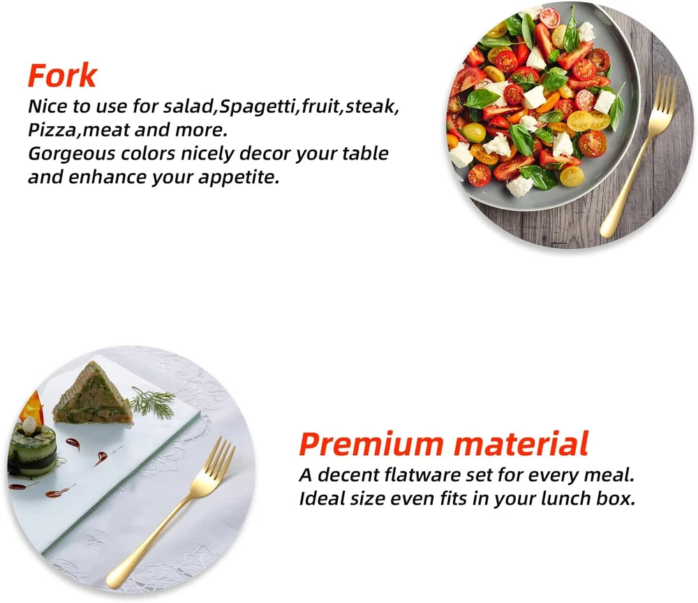 ✅Where are ALL the Forks?--Why you need more KITWARE bulk forks set? As forks are somehow disappearing around the appartment over the time. Spare forks can greatly secure your meals and dinners. With classic design, it will well match your existing knifes forks and spoons silverware. Can they fork? Yes, the metal forks do, as well as any other salad forks. Let's get forking happy :) ✅Shape/Balance + Price = Perfect!--All the kitchen utensils are in excellent shape. Perfect balance of toughness with simple elegance. The kitchen forks is attractive and feel good in hand. It is a pleasant suprise as cost isn't high. They make a great stainless steel forks for cake, salad, meat, dessert, appetizer, cocktails, as well as blending fork. GREAT FORKS SET to have with TEENAGER in the house. ✅Quality and Size-- KITWARE flatware set is made of food grade 18/0 stainless steel and eletroplated by the newest technology. It is rust-proof, durable and strong against bending. The stainless steel utensils are mirror polished and smoothen edges for pleasant using. The long fork size is 6.8 inch. With ideal size, the decent forks can live in your standard lunchbox. Nice bulk silverware for company gathering, family daily use, dinner party, Holiday, camping and festival gatherings. ✅Modern Silverware Forks only -- The heavy duty forks set adds a nice decoration to your home & kitchen. You will get compliments when your people sees them. A nice cutlery enable you enjoy your meals in ease. Make a worthy investment which not only cost effective, but a useful tableware set you will appreciate. It is DISHWASHER SAFE. ✅Buy with Confidence--Whether you are buying a kitchenware folk set for yourself or as a gift for newlyweds or new apartment essentials for the first apartment, we are sure you'll love our modern cutlery set as much as we do. We craft our tableware using only quality materials and focus on better designed. Our goal at KITWARE is to provide our customers with premium products at an affordable cost, so you can better enjoy your comfortable life and leave the details to us. Product Description Easy to Care: Hand wash recomended. Dry them before put them back into kitchen drawer. Every Piece is a direct spin off from space technology and nicely plated colored, very smooth surface, elegant colors, makes you feel in palace when dinning with them. The size of the fork and spoon set is perfect for everyday dining, and the front tines make it easy to pick up different foods in an ease way. Sturdy and fine material. Every piece is handpick and run through careful inspection before wrap up to ensure you receiving a perfect items.