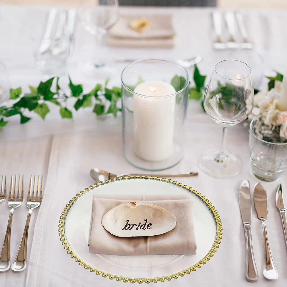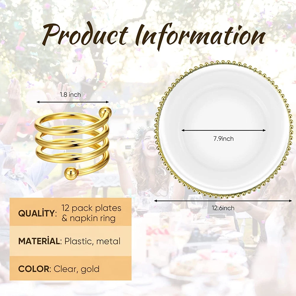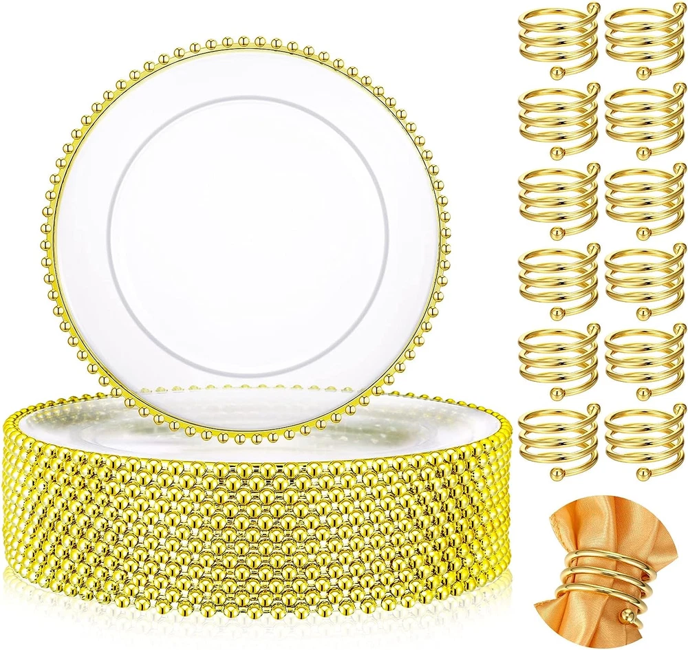 Package Content: you will get a total of 12 pieces clear charger plates and 12 pieces napkin rings, the rich quantity enough to meet your daily use, to add an elegant atmosphere to your dinner and let you and your guest enjoy delicious food Reliable Material: these gold charger plate are made of quality plastic material and personal napkin rings are made of metal, which are sturdy and smooth, not easy to break, providing a good using experience for you Elegant and Delicate Design: this plate chargers set is deigned with gold beads as rim, noble and attractive, creates a glamorous effect that will enhance the elegance of your table; Besides, the napkin ring set looks like a ring from the exterior, also exquisite and beautiful Keep Clean for you: these gold chargers bulk fit under salad plates, soup bowls, and dinner acrylic charger plates to prevent spills and messes and add glitz and charm to your party, you can enjoy your dinner to your heart's content