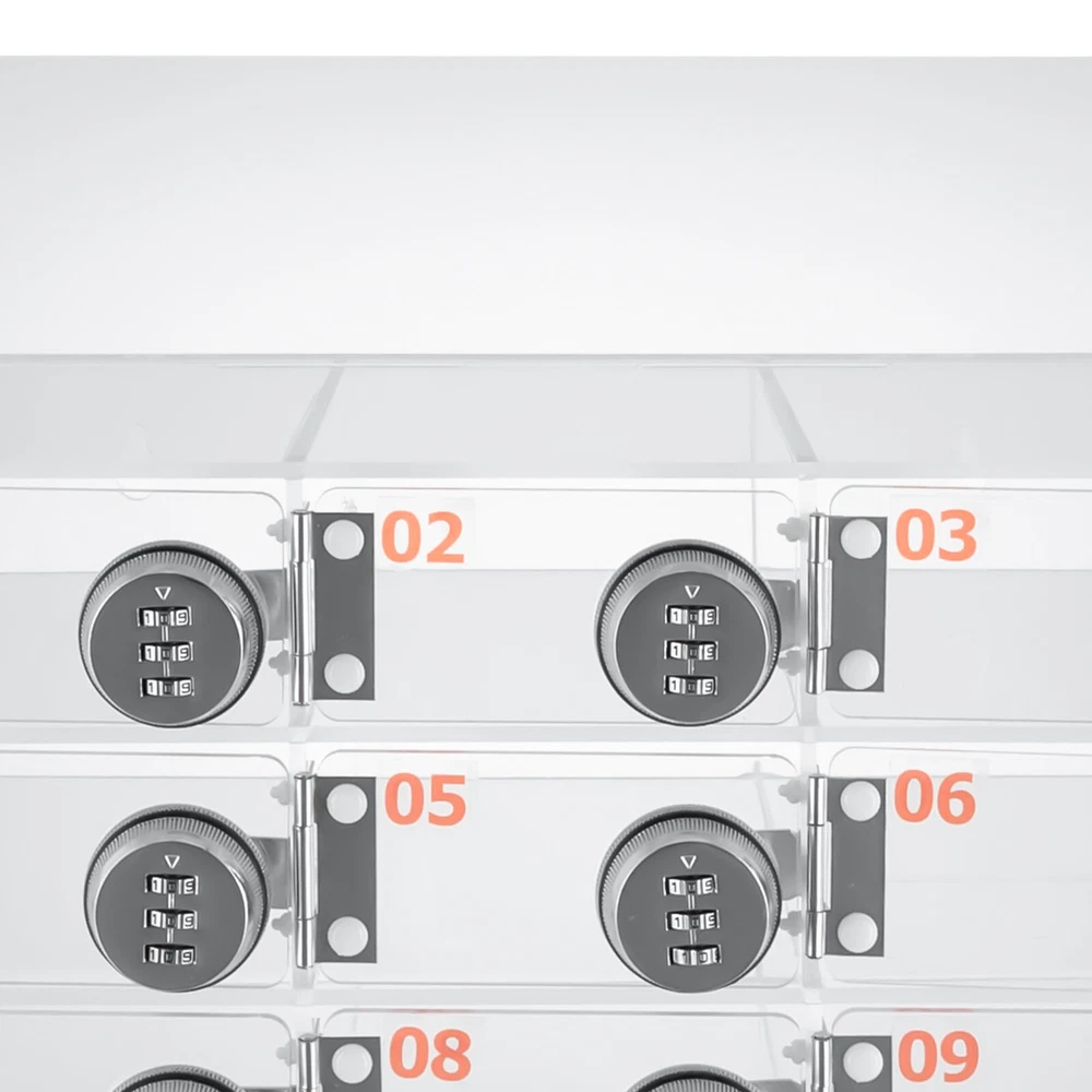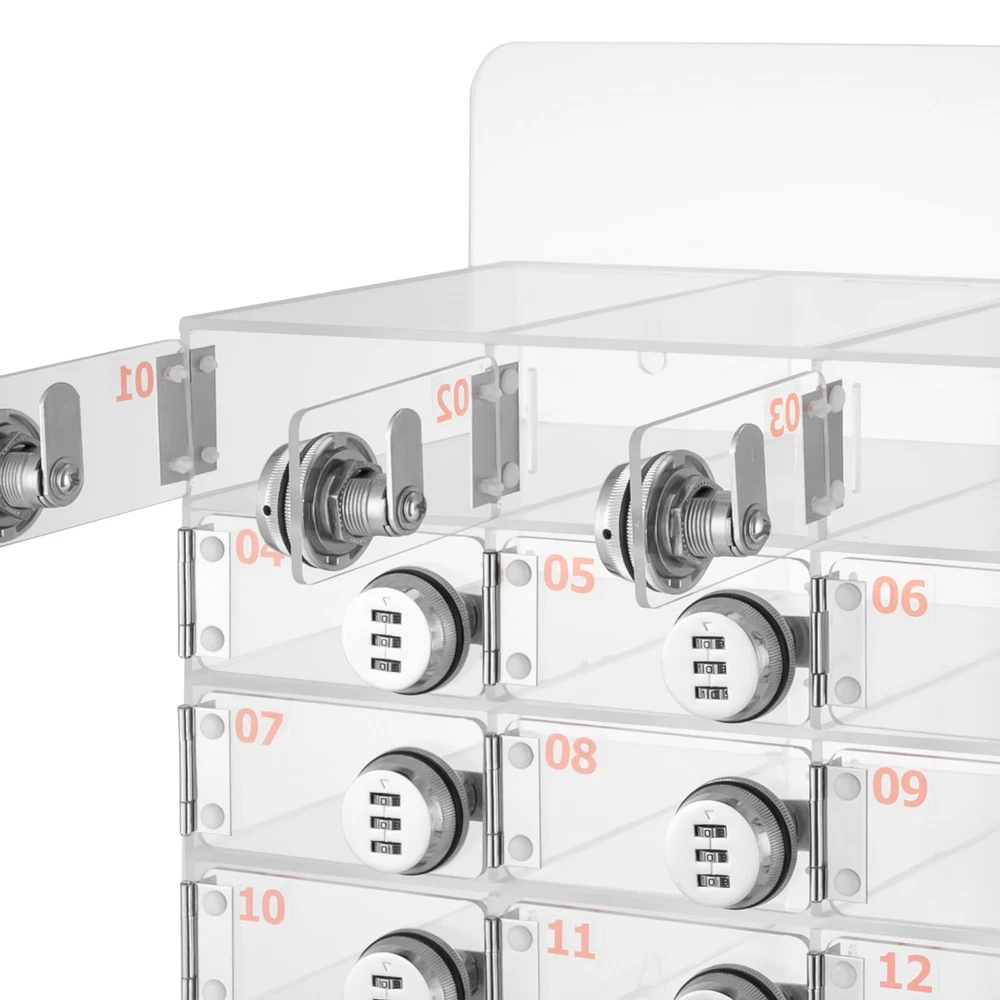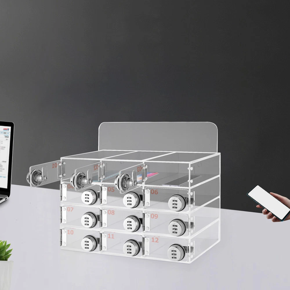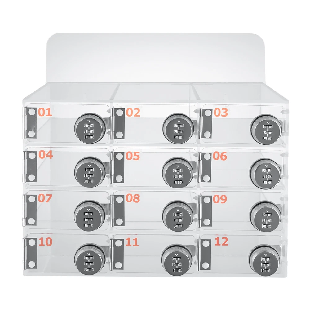 12 Slots Cell Phone Locker Box Transparent Acrylic Storage Box W/Locks TOP Description In this digital age, our mobile phones are not only a communication tool for everyone, but also a personal asset. That's why this mobile phone locker is designed to protect your favorite phone. It offers password protection, so you can rest assured that your mobile phone is safe and secure from theft and accidental damage. Its large-capacity design not only stores your mobile phone properly but also organizes keys, headphones, and other small items, keeping the space in order. Give your mobile phone a five-star home by choosing our mobile phone locker. Key Features Build to Last: The product is made of high-quality acrylic, using polishing technology, with high strength, wear resistance , and long service life. Safe and Secure: The three-digit combination lock has 1000 different combinations, providing a high level of confidentiality, keeping your mobile phone safe at all times, and also avoiding the hassle of carrying or losing your keys all the time. Large Capacity: Each of the 12 compartments measuring 1.97*3.94*7.09 inch es can not only store multiple mobile phones, but also keys, cards and other small items. It is suitable for storing 99% of mobile phone models on the market. Thoughtful Design: Each storage compartment has its number identification (1-12), allowing you to quickly pinpoint the location of your mobile phone. The clear body of the box makes it easy for you to observe the condition of your mobile phone and other items, avoiding accidents such as accidental taking. Productive Environment: With our mobile phone locker for storing mobile phones and wallets, you can stop letting your mobile phone cause a distraction during classes, meetings or sports, allowing your team to focus and create a productive environment. Easy Installation: Upon receipt, you do not need to assemble it to use it. The pre-drilled holes on the back of the product and the provided screws allow you to mount this product on the wall for your different needs. Easy to Clean: The smooth surface and simple structure allow you to easily clean it with a towel. Space-saving: I t has a small footprint (12.32*7.28* 8.7 inches) and can be placed on the desk without delaying the rest of your work. Customer Service: We aim to provide high-quality products and services. If you have any questions, please feel free to contact us. We will reply as soon as possible and solve the problem for you. Details Top Board: It gives you extra space to post reminder signs and more. Rectangular Base: It enables the product to stand steadily on the desktop. Application This product is ideal for use in classrooms, exam rooms, gyms, conference rooms, factories, labs, libraries, and more. How to Change a Password 1. Open the door and change the password to the initial password: 000 2. If the code is correct, press the metal (not included) against the right side of the lock hole. 3. Hold the right lock hole with metal while turning the numbers to the code you need. 4. After the password is changed, release the metal on the right side of the lock hole, and you are done. Specifications Style: Modern Shape: Rectangular Color: Clear Material: Acrylic Surface Treatment: Polishing Mount Type: Wall Mount, Tabletop Assembly Required: No Thickness: 3.5 mm/0.14 in Number of Compartments: 12 Lock Type: Combination Lock Weight: 3.4kg/ 7.49 lbs Net Weight: 3kg/ 6.61 lbs Product Size: 31.3*18.5*22.1 cm/12.32*7.28* 8.7 inch Each Compartment Size: 5*10*18cm/1.97*3.94*7.09 inch Package Size: 39*26*30cm/ 15.35*10.24* 11.81 in Package Included 1* Mobile Phone Locker Other Accessories Required for Installation Notes Please keep in mind your unlock code and storage location. Please note this product does not include other items. Please pay attention to the size before purchasing. Please allow the slight color difference caused by the shooting light and 1-3cm error due to manual measurement, and make sure you do not mind before you order. Payment Delivery details Terms of sales About us Contact us Payment We accept ebay payment 。 Fees such as import duties, taxes are not included in the item price or shipping costs. These charges are the buyer's responsibility. Delivery details Shipping: 2-9 working days to: USA Terms of sales We maintain high standards of excellence and strive for hundred percent customer satisfaction. Feedback is very important to us. We hope that you contact us immediately before you give neutral or negative feedback, so that we can address your concerns. It is impossible to address issues if we do not know about them! About us Your satis faction is our ultimate goal. We work hard to earn your trust and future business. Our certified technicians have tested each item before shipping. The unit comes with 1 year limited warranty on all manufacturing defects. a) If you receive a defective item, you may return it or ask for a discount. Please contact us within 14 days after you receive the package. b) What you returned must be intact and in its original packaging as re? u. Customer is responsible for shipping costs of the returned item. c) We will cover the cost of shipping back t with the shipping rate indicated in the registration page. We will send you a new unit or refund the full payment you paid. Thank you. Contact us Business Hour Business Hour: Monday To Friday: 8:30 AM to 5:00 PM (Beijing China time) Due to time zones, our reply to your questions may not be immediately. But within above working time, we will reply your email within 24 hours. If it's non-workdays, please kindly be patient and wait till Monday. Please contact us with ebay message. Please feel free to contact us if you have any questions. Monday To Friday: 8:30 AM to 5:00 PM (Beijing China time) Due to time zones, our reply to your questions may not be immediately. But within above working time, we will reply your email within 24 hours. If it's non-workdays, please kindly be patient