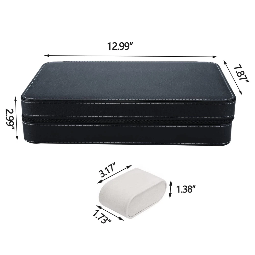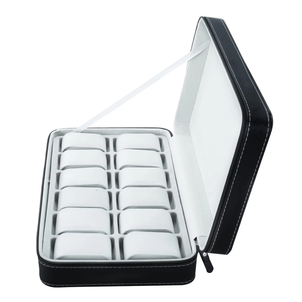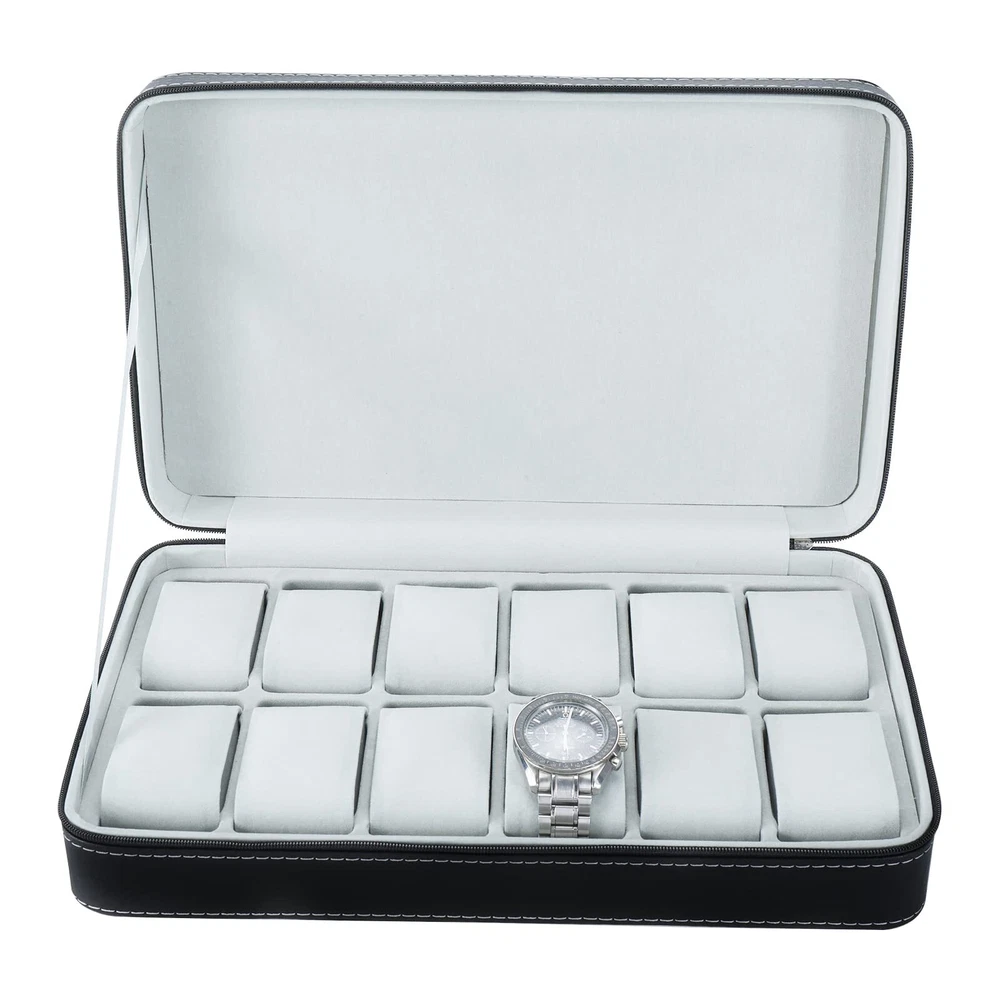Watch box materials:PU leather and flannelette 12 slots watch case size:approx 13'' x 7.8'' x 3" Watch jewelry display cases sturdy and secure zip lock The chain closure design makes it easy to use and portable for travel and outdoors The zipped watch box and flannel lining will keeps watch and other jewelry away from dust,fingerprints,scratches,ect