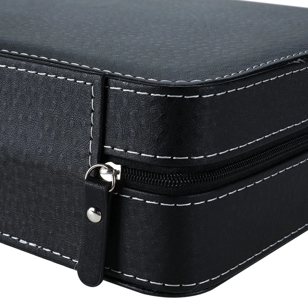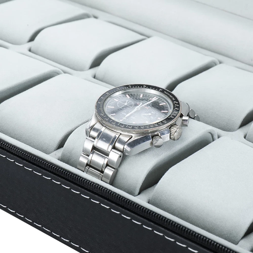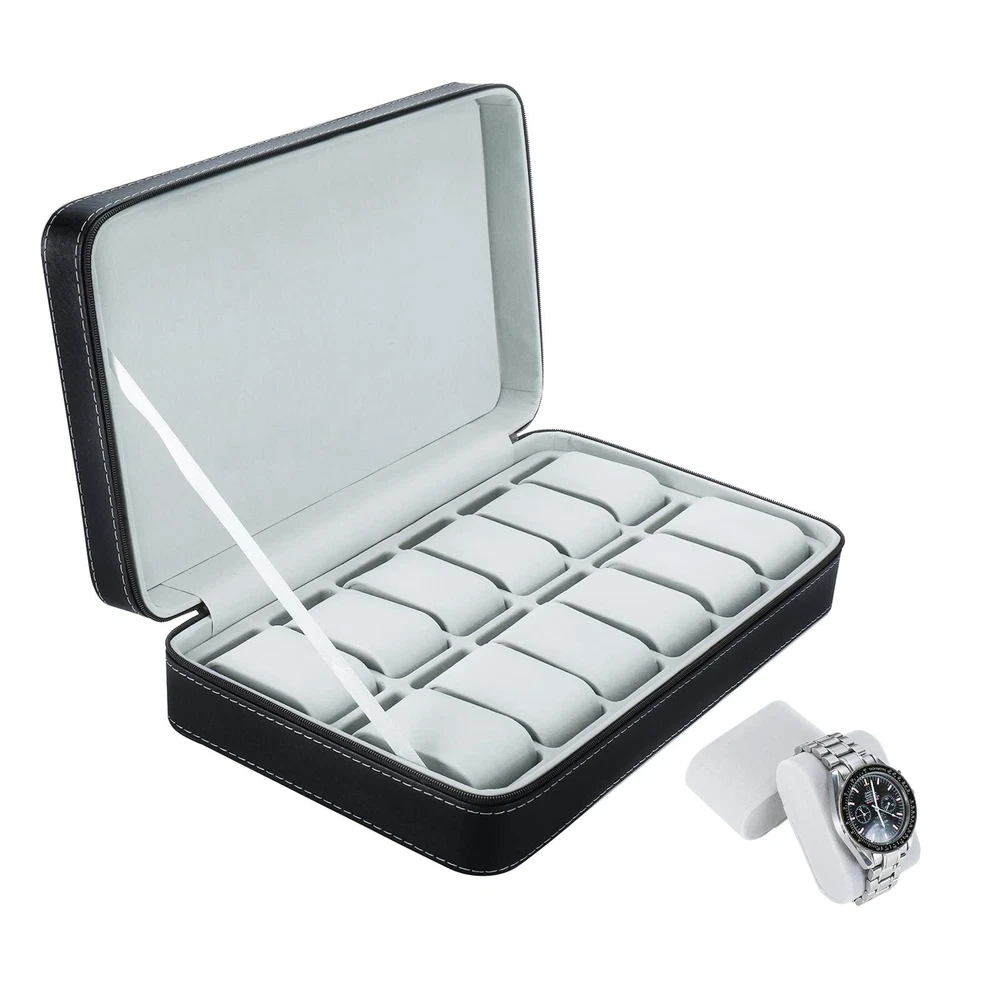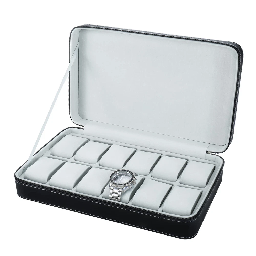 Watch box materials:PU leather and flannelette 12 slots watch case size:approx 13'' x 7.8'' x 3" Watch jewelry display cases sturdy and secure zip lock The chain closure design makes it easy to use and portable for travel and outdoors The zipped watch box and flannel lining will keeps watch and other jewelry away from dust,fingerprints,scratches,ect