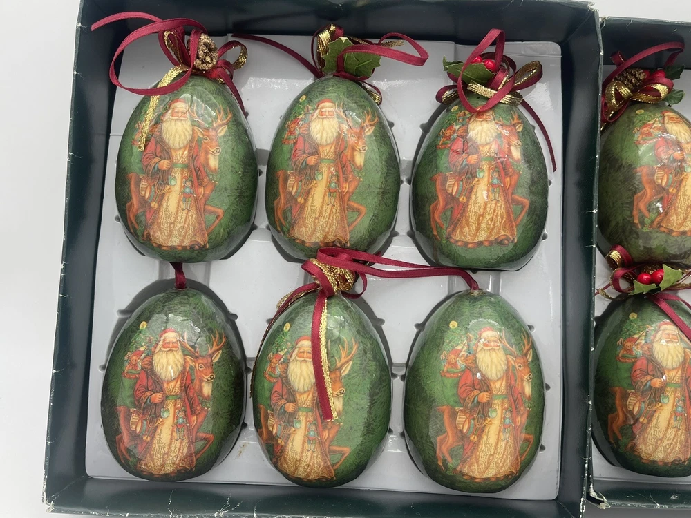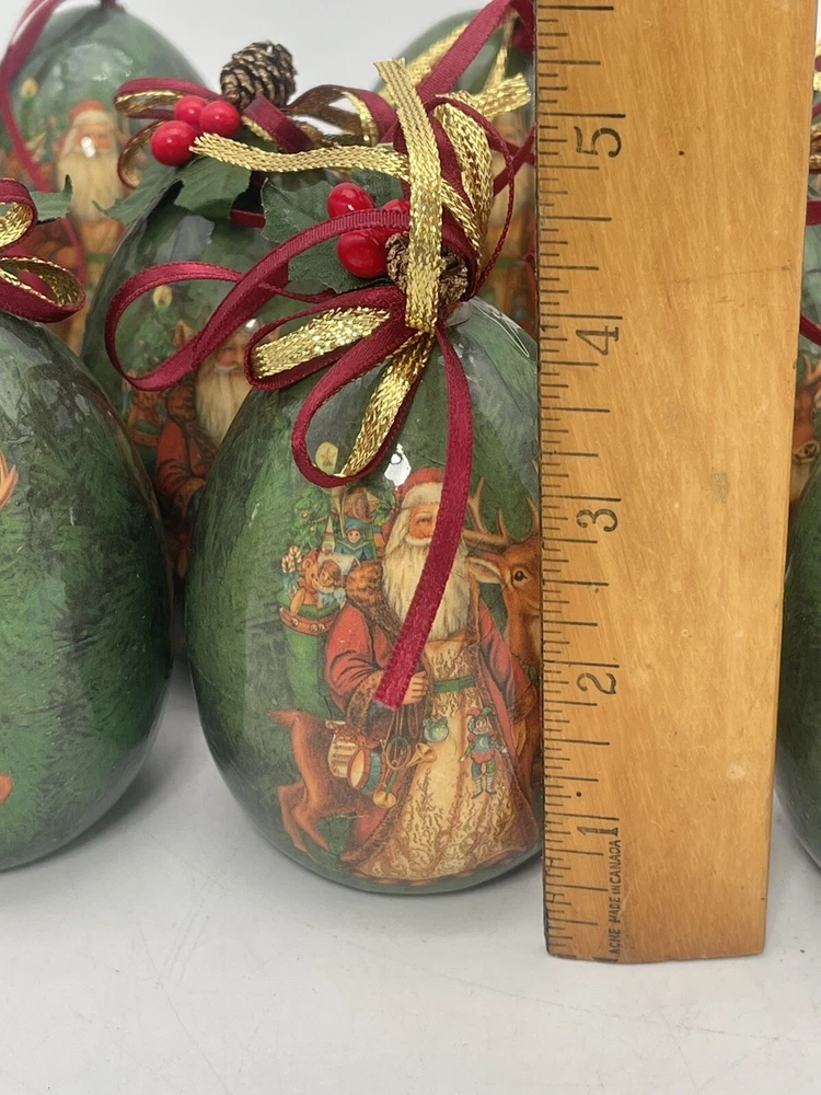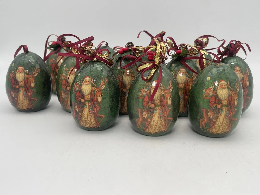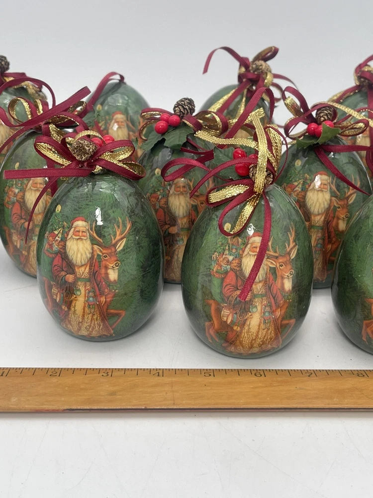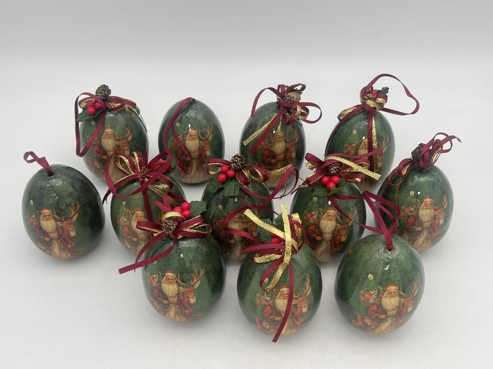 12 pcs | Vintage Egg Shaped Decoupage Santa With Reindeer Christmas Ornaments | Paper Mache Christmas tree Ornaments | Mache Christmas See my other listings π£ππβοΈ Please view and zoom in all images for item condition and what the item consists of. Colours may be slightly different than shown due to screen variations. Keep in mind this is a pre owned item and there is visible wear all over from years of loving using. There are scratches, stains, dents, breakage, missing pieces, crazing, rust and colour discolourations. Everyone has a different perception of item quality, thus we leave it up to the buyer to decide and evaluate on an itemβs condition. No original boxes. No chargers/adapters/batteries included. Questions, more pictures, videos? ask us π Happy shopping! *No staging elements are included in this sale* *sorry, no refunds, returns, cancellations or exchanges. For electrical items, please ensure wiring, plugs, batteries, and lightbulbs are compliant/safe before usage. Light cord is for USA-CANADA. Lightbulb not included. Please ensure cables or wires are away from children and pets. Adult supervision is required. I accept no responsibility or liability for the items that I sell. When purchasing jewelry, please ensure claps/connecting hooks are well closed before inserted a chain, charm, etc, or wearing your piece of jewelry purchased. All items are sold AS IS WHERE IS, with no guarantees or warranties (express or implied). I always ship with a tracking number and this number will be provided to you. You are responsible for tracking your order. For orders over $300 CAD for each item (shipping and taxes not included) a signature on delivery will be requested, therefore please ensure that you are available to receive your parcel(s). Unfortunately, I am not responsible for any lost, stolen, missing, undeliverable or unclaimed parcel(s) and no refund or any other type of compensation will be given should this happen. In addition, no recourse towards me will be possible should your parcel(s) be lost, stolen, missing, undeliverable or unclaimed. Once the package leaves our possession, we are not responsible for any damages incurred while transit or reception of opening package. If your package is delivered damaged, please reach out to us immediately (the day of delivery of package- not any other moment), to see if we can help you and assist you with filing a claim with the carrier. You must retain original box, item, and packaging material. Helping you or assisting you with filing a claim does not in any way constitute recourse towards us for your damaged item or that you will be compensated for your item.