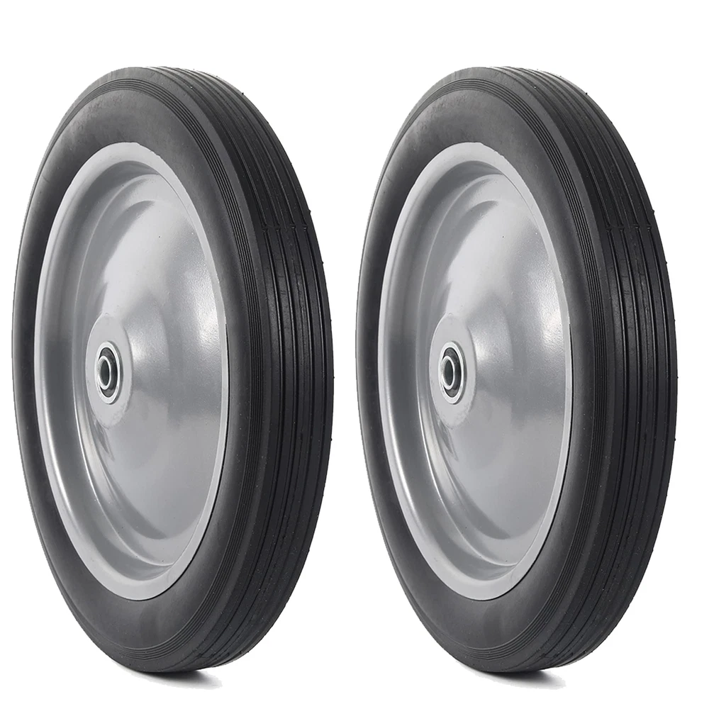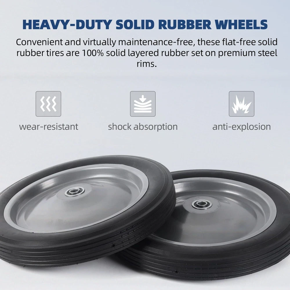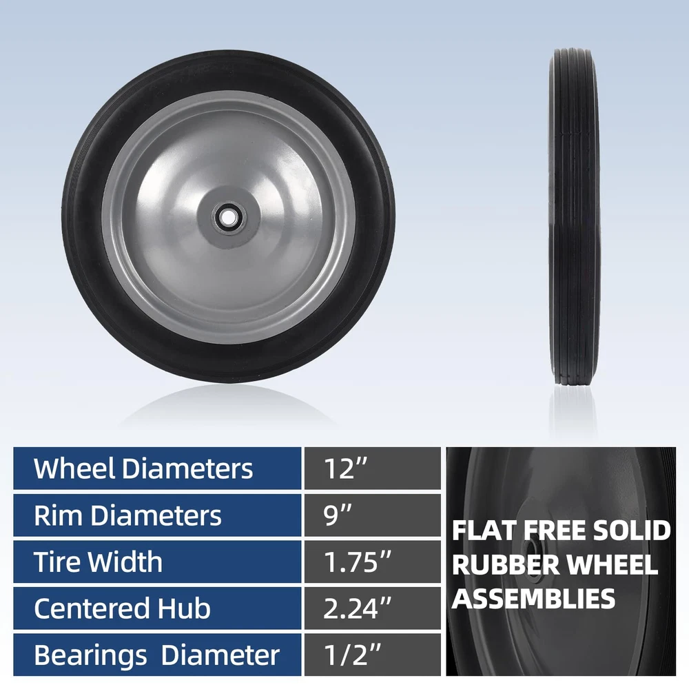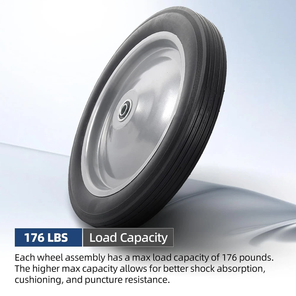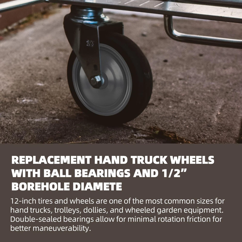 12” x 1.75” Solid Rubber Tires and Wheels Features and Advantages ●Universally compatible with a wide variety of commercial, utility, and garden wheeled equipment, including hand trucks, dollies, trolleys, garden carts, yard trailers, wagons, snowblowers, pressure washers, and more. ●The solid rubber tires are of high-quality and heavy-duty 100% natural rubber. ●solid rubber tires last 3x longer than other types of flat-free or filled tires. ●Excellent performance on rough, steep, and wet terrains. ●Solid construction provides more structural integrity compared with pneumatic tires. Flat-free solid rubber tires won’t deflate or deform. Punctures won’t impair the tire’s function - you don’t even need to stop for repairs! ●Ribbed flat-free tire treads provide maximum traction both in wet and dry conditions. The ribbed treads perform excellently on wet pavement as the ribbed design allows for superior water evacuation and even tread wear, preventing hydroplaning while also providing adequate traction. ●The rims are of premium steel, perfect for wheeled equipment with heavy workloads, and are always on the go. ●Tires are rim-bonded to prevent slippage, especially when used on rough terrain. ●Excellent equipment stabilization with heavier solid tires as they lower the center of gravity. ●Each tire and wheel assembly can support up to 176 pounds of distributed weight. ●Double ball bearings enable you to push less and push easier even with heavy loads! The bearings provide flexible rotations, radial and axial load support, and load balancing, while also minimizing rotational friction. ●These assemblies are the most cost-effective replacements for pneumatic tire and wheel assemblies. 12” X 1.75” FLAT FREE SOLID RUBBER WHEEL ASSEMBLIES - These sets of flat-free wheel assemblies have outer diameters of 12 inches and widths of 1.75 inches. These wheel assemblies are easy to mount and dismount. There’s no need for tools! Just insert the wheel assembly into the axle and install an axle push nut cap or a cotter pin to secure the wheel in place and you’re good to go. REPLACEMENT HAND TRUCK WHEELS WITH BALL BEARINGS AND 1/2” BOREHOLE DIAMETER - Wheel assemblies for hand trucks and garden carts come in different sizes, but these 12-inch tires and wheels are one of the most common sizes for hand trucks, trolleys, dollies, and wheeled garden equipment. They are suitable for a 1/2-inch axle shaft. Double-sealed bearings allow for minimal rotation friction for better maneuverability. HEAVY-DUTY SOLID RUBBER WHEELS - Convenient and virtually maintenance-free, these flat-free solid rubber tires are 100% solid layered rubber set on premium steel rims. They’re designed for heavy-duty use with their excellent wear, puncture, tear, and rot resistance. The solid metal rims and hubs also have high resistance to impact cracks, making them highly suitable for a wide variety of terrains. 176 LBS LOAD CAPACITY - Each wheel assembly has a max load capacity of 176 pounds. The higher max capacity allows for better shock absorption, cushioning, and puncture resistance. This makes the flat-free solid rubber wheels perfect for both home and commercial use, especially on workhorse hand trucks and garden carts. SAFE AND COMFORTABLE RIDE - Say goodbye to flats without saying goodbye to a smooth and comfortable ride. Unlike pneumatic tires, sharp debris and rough terrains are non-issues for flat-free solid rubber tires. Solid and thick layers of rubber provide superior vibration and noise dampening. Ride with the same bounce and feel as a pneumatic tire minus the risk of flats, explosive punctures, and pinched inner tubes!