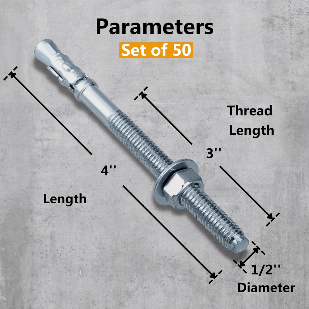 Store New Arrivals Add to Favorite View Feedback Contact 1/2 X 4 Inch Wedge Anchor, 50 Pcs Zinc-Plated Industrial Anchor Bolts for Cement, Concrete Description Fastener Type Bolt Number of Items 50 Material Steel Head Style Wedge Size 1/2 x 4" Package Dimensions 6 x 6 x 6 inches; 7 Pounds 50 PCs 1/2 inch x 4 inch heavy-duty wedge concrete anchors, securely packed; ideal for anchoring heavy-duty fixtures, beams, machinery, and handrails to concrete in construction and DIY projects. Heavy-Duty Performance: Built for strength and reliability, these wedge anchors deliver exceptional holding power in solid concrete, making them ideal for securing heavy equipment, fixtures, and structures. Corrosion Resistance: Crafted from premium-grade materials, these anchors resist rust and corrosion, ensuring long-lasting durability even in outdoor or harsh environments. Easy Installation: Designed for quick and hassle-free setup, the wedge anchors are compatible with standard tools and come with clear instructions for professional-grade results every time. Versatile Applications: Perfect for a wide range of projects, including construction, industrial setups, and DIY tasks such as installing railings, shelving, and machinery. Secure your heavy-duty projects with confidence using our Heavy-Duty Wedge Anchors1/2 x 4". Specifically designed for solid concrete applications, these anchors deliver exceptional holding power for critical tasks like anchoring structural supports, heavy machinery, and steel columns. Crafted from zinc-plated carbon steel, they offer basic corrosion resistance suitable for indoor environments, ensuring durability and reliability. Each anchor includes a nut and washer, and we've provided detailed installation instructions to make the process straightforward, addressing any concerns about installation difficulty. Installation requires a hammer drill and a wrench—no specialized tools needed. Please note, they are not compatible with impact drivers or tapping screws. Once installed, these anchors provide a permanent hold and are not removable or reusable, ensuring long-term stability. Our wedge anchors meet industry standards and building codes, giving you peace of mind about safety and compliance. They're not suitable for brick, block, or drywall, which answers common questions about proper material use. ABOUT US We offer the best prices around on high quality products. Our E-store includes media such as books, movies, music and games while offering electronics, toys, sporting apparel, clothing, tools, general home, garden items and more. SHIPPING We are always working hard to ensure your package arrives as soon as possible. Please understand that some factors like weather, high postal traffic, and the performance of shipping companies are outside of our control. We offer free shipping to the lower 48 states and ship within 2 business days of payment, usually sooner. We do not accept P.O. Boxes. Please provide a physical address. For shipping outside of the continental USA, we only use eBay's Global Shipping Program.The item is shipped to KY and then sent to the rest of the world. International customers are responsible for all duties and taxes. Continue to check out in order to calculate costs for shipping the item to your country. Messages regarding eBay's Global Shipping Program MUST be directed at eBay EXCLUSIVELY. RETURNS We offer a 30-Day Return Policy on items which you are not completely satisfied with. You have the option for a full-refund or an exchange of the item. No returns are available on items shipped outside of the USA. PAYMENT We accept PayPal. CONTACT US This page content is yet to come Please ad us to your favorite seller and visit again later Thank You CUSTOMER SATISFACTION We try our very best to make sure every customer is completely satisfied. If there's a problem, message us! We're happy to help. WE ACCEPT Copyright © 2021 AutoDS. | All Rights Reserved