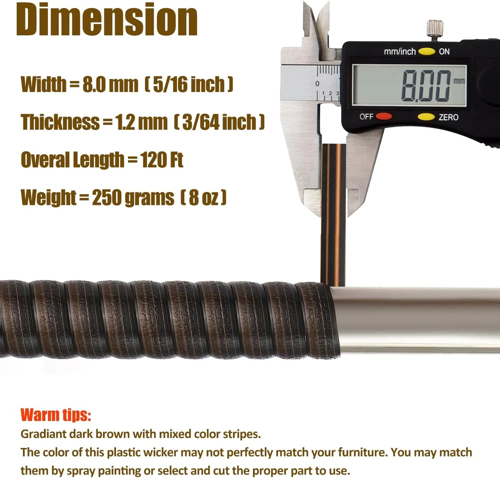 Store New Arrivals Add to Favorite View Feedback Contact 120 Ft Wicker Repair Kit, Plastic Wicker Repair Supplies, Gradient Dark Brown with Visible Mixed Color Stripes, Synthetic Rattan Replacement Material for Patio Wicker Furniture Repair Description Age Range Description Adult Is Customizable? No Pattern Striped Material Type Polyethylene Is Electric No Seat Cushion Quantity 1 Theme Wicker repair kit Type Sofa Chaise Frame Material Type Plastic Number of Pieces 1 Furniture Leg Color Gradient Dark Brown Room Type Patio Includes All Assembly Tools No Seating Capacity 1 Style Wicker furniture repair Brand Name Laphivieh Brand Laphivieh Seating Capacity 1 Required Assembly Yes Item Firmness Description Wicker repair kit Arm Style Straight Leg Style Solid Additional Features Wicker furniture repair Weight Capacity Maximum 250 Grams Back Style Wicker repair kit Furniture Leg Material Plastic Item Weight 0.55 Pounds Frame Material Plastic Material Polyethylene Special Feature Wicker furniture repair Weight Limit 250 Grams Has Removable Seat Cushion Cover false Assembly Required Yes Color Gradient Dark Brown Item Dimensions D x W x H 39.37"D x 39.76"W x 39.76"H Indoor Outdoor Usage Outdoor Material Features Synthetic, heavy-duty, waterproof, UV resistant, non-toxic, resistant to fading, cracking, and peeling Component Connector Assembly Not Required Style Name Wicker furniture repair Sofa Type Sofa Chaise Recommended Uses For Product repairing wicker patio furniture Seat Cushion Removability Attached Product Dimensions 39.37"D x 39.76"W x 39.76"H Product Care Instructions Wicker repair kit Size 0.55 Lbs ★[COLOR]: This wicker replacemenet material is not monochromatic but gradiant dark brown with mixed color stripes. ''Gradiant dark brown'' means this wicker's color is not consistant in only one brown color but mixed with cappuccino brown and espresso brown, and these two brown colors gradually transitions along with the wicker strand. ★[DIMENSIONS] Width = 8mm; Thickness = 1.2mm; Length = 120 ft; Weight = 0.55 lbs. This is a flat-shaped wicker, not round or half round either. ★[WICKER REPAIR KIT]: Save money and time with fun by fixing your patio furniture yourself and improve the value of your lawn furnitue while protecting your investment. You can also have fun to create some innovative DIY gadgets or art crafts like flower basket, food basket etc with this plastic wicker material. ★[HEAVY DUTY]: Synthetic plastic, 100% virgin polyethylene (PE), not natural rattan, high strength, waterproof, UV resistant, non-toxic, resistant to fading, cracking, and peeling, ensuring long-lasting use. ★[WARM TIPS]: This wicker's color may not exactly match your damaged wicker, but you can match the color either by spray painting the wicker or cut properly per your needs. In most cases a pretty close match wicker material can always blends in nicely with your originals. Product Description Wicker patio furniture adds a simple but elegant, woven touch to your outdoor living space if you are able to maintain it properly. It can be easy for you to do a basic repair, or a larger repair project with our wicker replacement material! Your wicker furniture will stay in top shape if you take good care of it. [Material] : Made of 100% virgin polyethylene [Color] : Gradiant Dark Brown with visible mixed color stripes [Overal length] : 120 feet [Width] : 8 mm ( 5/16 inch ) [Thickness] : 1.2 mm ( 3/64 inch ) [Weight] : 250gram ( 0.55 lbs ) Laphivieh Plastic Gradiant Dark Brown Wicker Supplies Revive your patio wicker furniture with a new modern stylish look! [Quality Material] Commercial-grade 100% virgin polyethylene with ultra violet inhibitors manufactured into the product, non-toxic, no harsh chemicals or hazardous impurities, safe around children and pets. [Heavy Duty] Resistant to fading, cracking, and peeling, ensuring long-lasting use. [Easy DIY] Save cost and time with fun by fixing and reviving your patio furniture with a modern, sleek and stylish look! [Tips #1] Please consider to use glue, nail gun or hot glue gun to join two pieces of wicker or attach wicker onto the frame. [Tips #2] Please kindly note that the color of this plastic wicker may not be exactly the same as that of the wicker furniture you are trying to repair. You may match the color by spray painting. [Tips #3] Remove one damaged wicker strand at a time and replace it before removing other damaged pieces. This makes it easier to keep the weaving pattern consistent with the original. [Tips #4] This wicker material is not monochromatic but gradient dark brown with visible mixed color stripes. [Tips #5] ''Gradiant dark brown'' means this wicker's color is not consistant in only one dark brown color but gradually varies along with the wicker extends. [Tips #6] Color chromatic aberration may exist due to different display monitors. [Tips #7] Slight deviation in dimensions may exist due to manual measurement. Steps to Repair Wicker Furniture Step 1. Identify the damaged wicker Assess the damages you need repair and determine how extensive the damaged wicker is and thus how much wicker replacement material you need. Step 2. Find proper replacement wicker Your wicker furniture can be made of either natural or synthetic plastic wicker. So identify what type of material of your damaged wicker is first, and then measure the size (width / thickness etc) of your damaged wicker and then get a match as close as possible. It might be difficult to find a perfect match especially for the color but in most cases a pretty close match wicker material can always blends in nicely with your originals. Step 3. Remove damaged wicker Observe and take note of the original weave pattern in case you might not recognize it when you weave the new wicker back in. Now start from the first damaged wicker strand, cut it and pull it out with your hand or other proper weaving tools. Our stainless steel weaving tool ( ASIN B0B3XSPZ18 ) can be a very handy option to assis