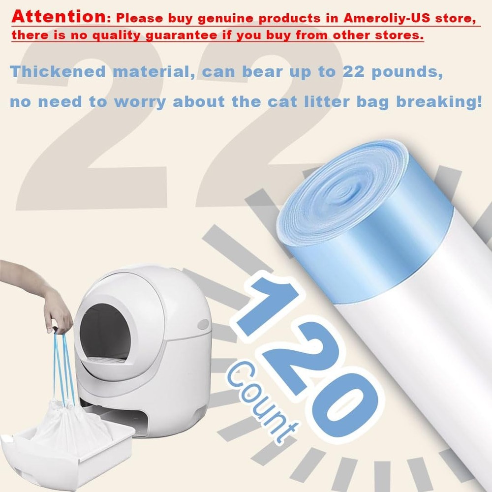 Cat Litter Bag Available through Ameroliy-US : cat litter liners are designed for cat lovers and make cleaning the litter box a breeze. Available through Ameroliy-US . When cleaning the litter box, simply tie it off and discard it once a week for convenience and hygiene. Long-Lasting & Convenient: Our cat litter box liners feature anti-scratch technology and micronized plastic that prevents tearing. Features signature blue drawstrings as shown in product images. Universal: Precision sized Designed compatible with Litter Box Robot 3/4 (38.5x48.5cm). They fit most standard litter boxes, including top entry litter boxes, providing full coverage and protection for your litter box. Value Package: Contains six 20-count roll, a total of 120 liners Easy to install and replace. We recommend changing them once or twice a week to keep your litter box clean and reduces odors in your home. After Service:with order number for assistance. Quality verified through durability testing. Provide order number from Ameroliy-US to 24-hour priority response.