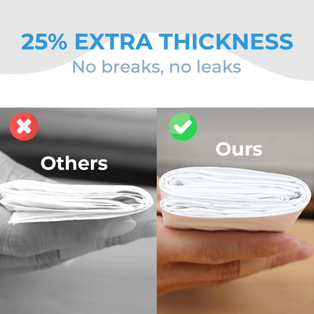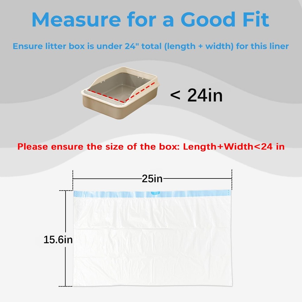 Cat Litter Bags 120 PACK Suitable for Automatic Litter Boxes: Our cat litter liners are compatible with Litter-Robot 3/4, ensuring effortless compatibility and effortless maintenance. Ensure litter box is under 24'’ total (length+width) for this liner. Drawstring Design: No more struggling with awkward ties or clips. Our cat litter box liners feature a convenient drawstring closure, allowing you to effortlessly seal and dispose of litter with a simple pull, making litter changes a breeze Engineered for Strength: our reinforced construction withstands your cat's digging and scratching. Say goodbye to flimsy bags and hello to peace of mind—Our reinforced construction ensures secure litter changes every time Easy to Separate: Our cat litter liners feature perforated tear lines that allow for effortless dispensing, ensure quick and smooth preparation for each cleanup Great Value: With dimensions measuring 25*16 inches and a generous capacity of 10-12 gallons, our cat box liners offer ample room for even the busiest litter boxes. Say goodbye to frequent bag changes and hello to convenience—our large-capacity bags ensure fewer interruptions and smoother cleanup sessions