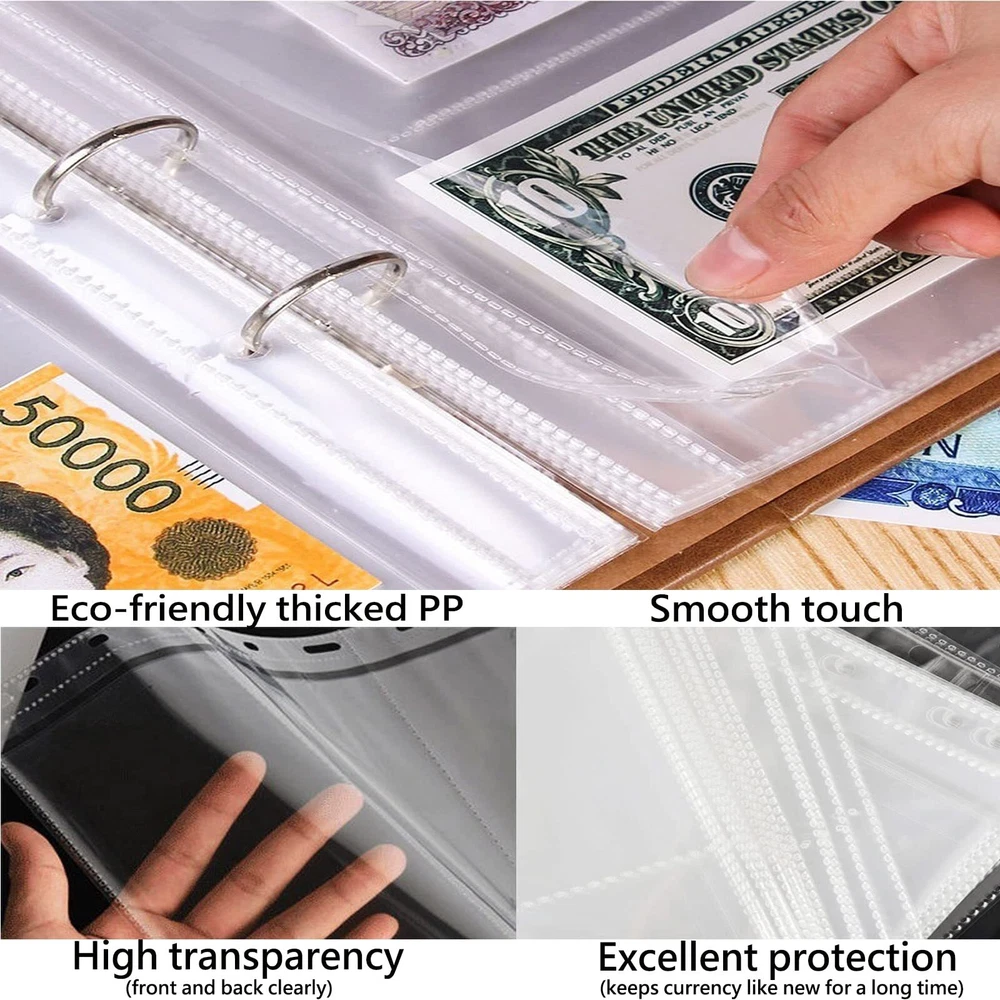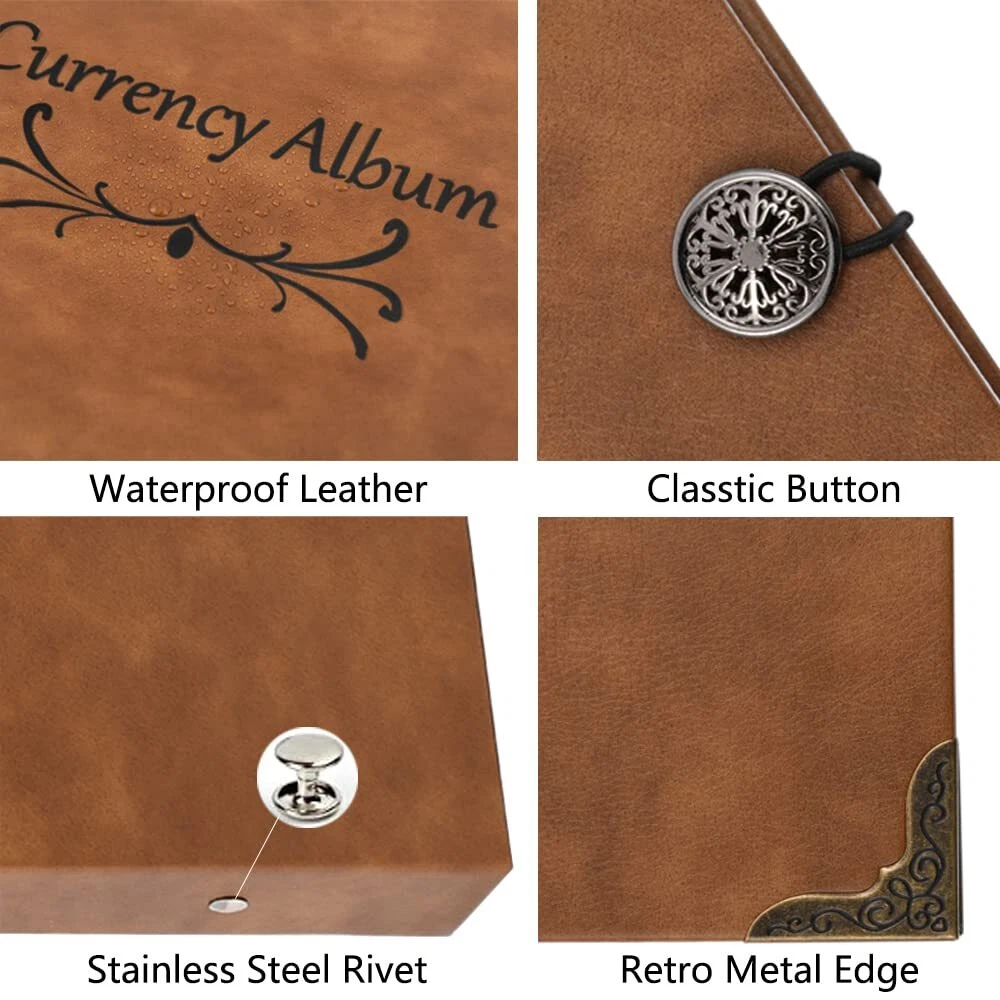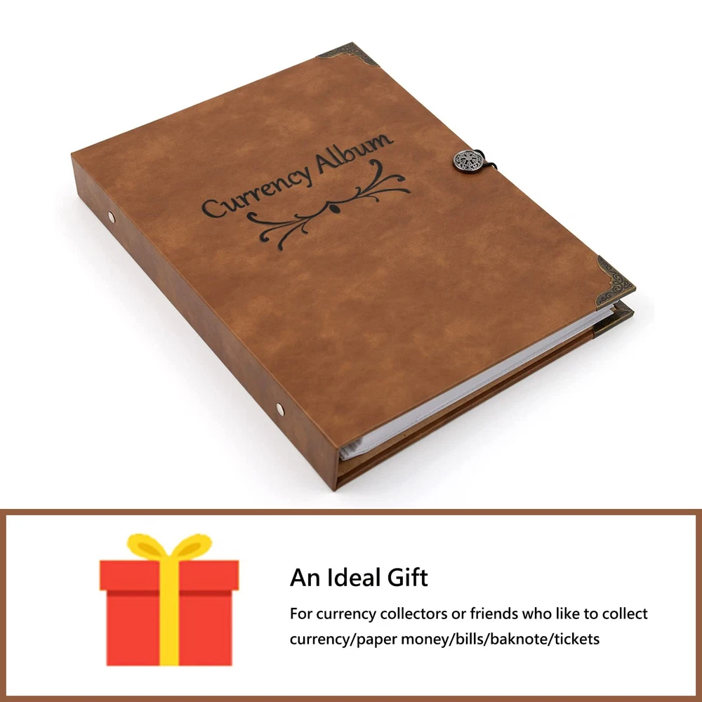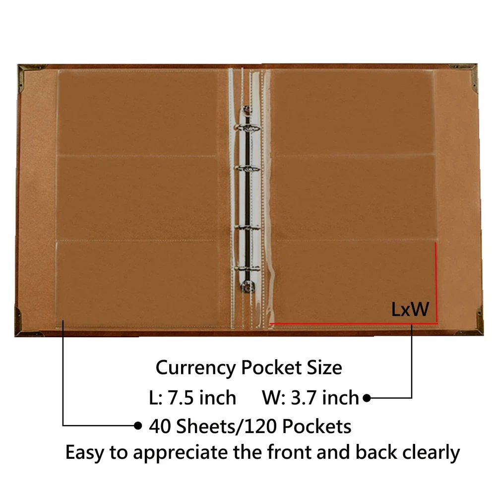 CAPACITY & SIZE: 40 Sheets, 3 pockets per currency storage page(both sides can be seen), holds 120 paper money. Banknote pocket size: 7.5x3.7 inch, album cover: 12x9.5x1.6 inch EXCELLENT PROTECTION: PU leather cover, eco-friendly transparent PP pages, smooth touch and protect currency well, good perspective effect, sturdy and durable, even at low temperatures, paper money collection book does't become brittle or hard PAGE PROTECT: High transparency thickened pages, keeps currency like new for a long time, an ideal way for collector to display, storage and protecting DESIGN: Integrated mechanical ring-type metal page holder - add or remove the inner pages easily. Pages with high transparency - Easy to view and appreciate the front and back clearly. The design of details, buttons, metal edge, cover, pattern and internal panel are retro, generous and elegant. A meaningful gift for collectors or friends who like to collect currency/paper money/bills/banknote/tickets GUARANTEE: If you have any question, please contact us, we will solve them in time for you, we are always doing our best to provide better products and service to our customers