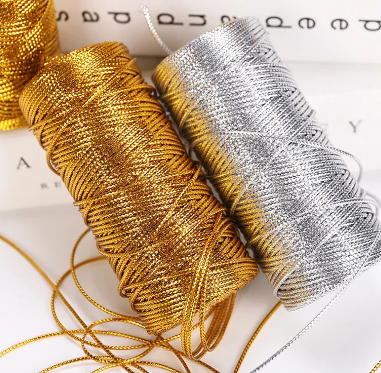 Listing for 120 yards Metallic Lurex Rope Twisted Thread Macrame Cord Rope 1.5mm. Unique yarn/rope/cord! Thickness: 1.5 mm Gold Cored lurex Rope: 1.5 mm Round Rope for Craft Jewelry Making, Thread Cord, Garment Sewing. Bobbin size: 10 cmX5 cm Each bobbin contains 120 yards. Material: The rope is made of high-quality lurex, ensuring strength and durability for long-term use. Gift Idea: This rope makes a perfect gift for your family and friends. You can use it to create handmade jewelry. These beautiful ropes are versatile additions to various projects, including home decor, wedding bouquets, crafts, handmade cards, scrapbook pages, and nursery items. You can also use them to trim a bassinet, decorate lampshades, or add interest and soft sheen to almost any project. Get creative and make tiny hair wreaths for dolls with these adorable ropes Once you try, you will love!