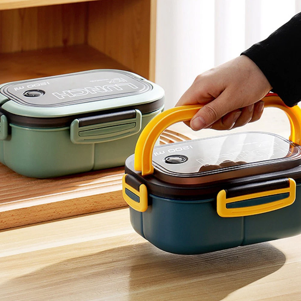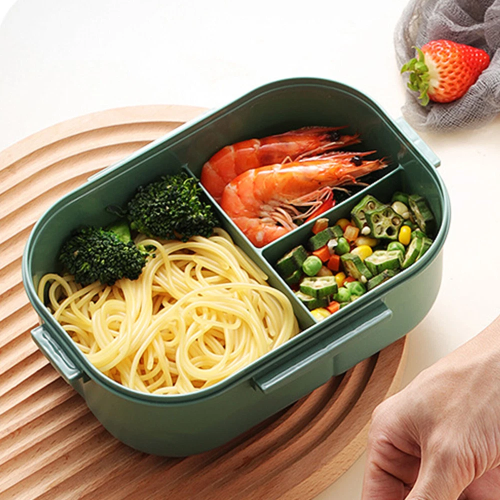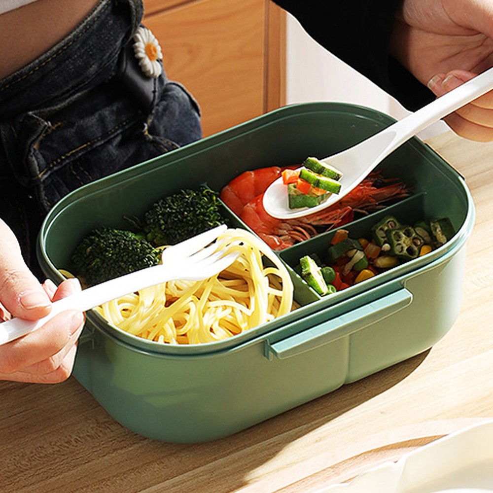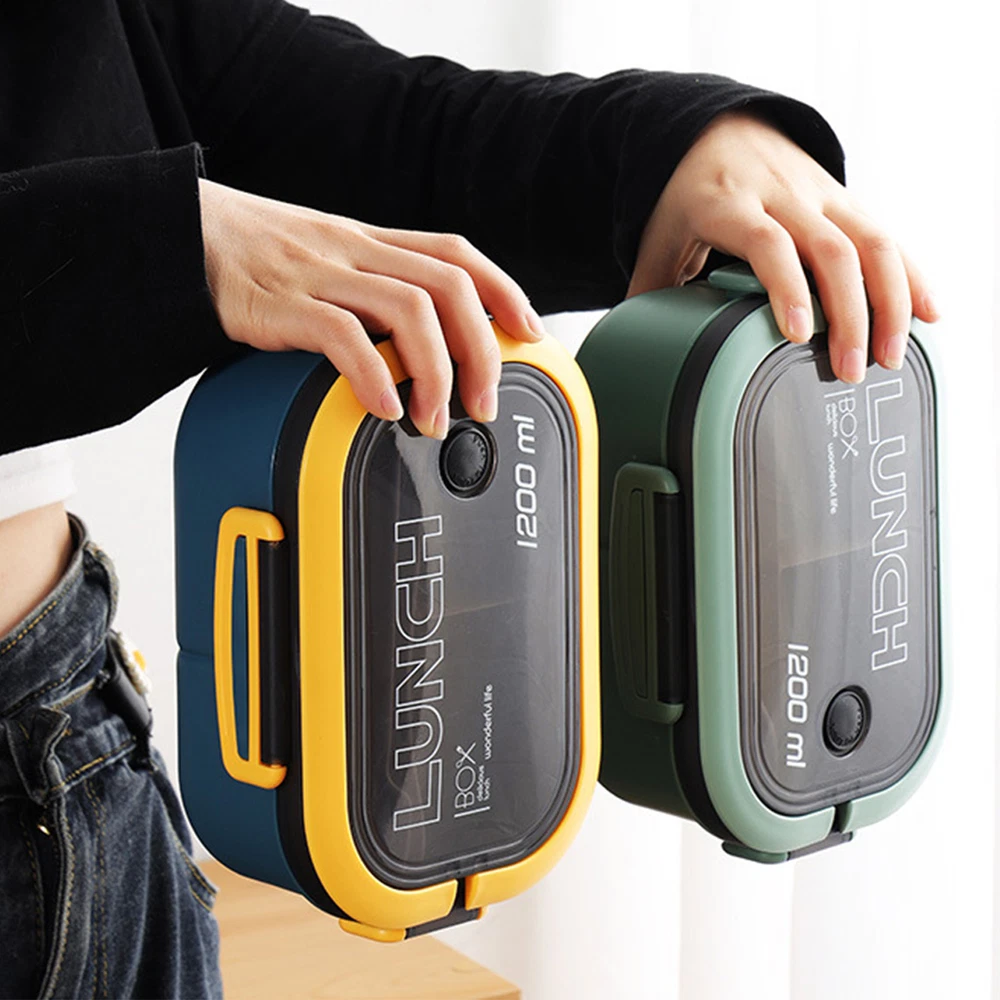 Feature: 1. Leak Proof Design: The bento lunch box has a built in silicone and is designed to be sealed to prevent leaks. 2. Double Layer Design: The layered lunch box features a double layer divider design to hold more food. 3. Insulation Function: The bento box has a snap on sealing lid, which provides good insulation and ensures no loss of flavor. 4. Quality Material: The lunch box container is made of high grade PP, which is safe and healthy to use. 5. Portable: The lunch box features a large capacity of 1200ml, making it easy to carry and suitable for students and office workers. Specification: Item Type: Bento Lunch Box Material: PP, Silicone Size: Approx. 21.5 x 8.2 x 15.8cm/8.5 x 3.2 x 6.2in Volume: 1200ml Gross Weight: Approx. 255g/9.0oz Package List: 1 x Bento Lunch Box 1 x Fork 1 x Spoon Note: Please allow some errors due to manual measurement.