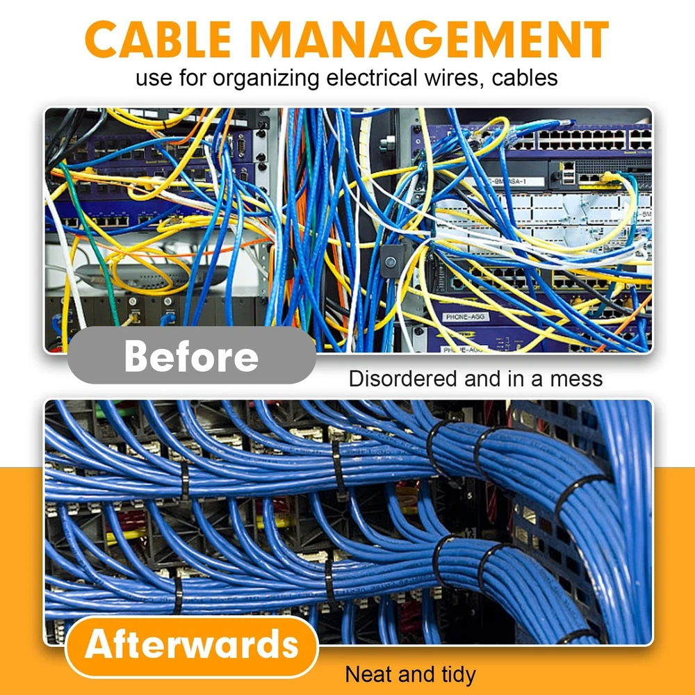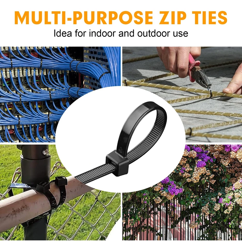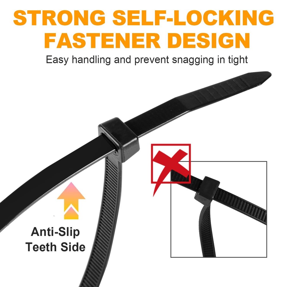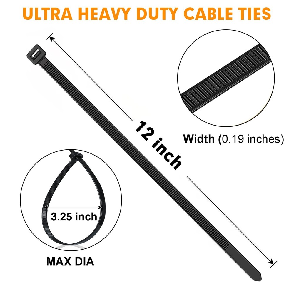 Zip Ties, 1200pcs Black Cable Zip Ties 12 Inch, Heavy Duty Plastic Wire Ties with 50lb Tensile Strength, Self-Locking Black Nylon Tie Wraps for Indoor and Outdoor PREMIUM QUALITY MATERIAL: Cable ties made of industrial strength nylon 66 material, UV-resistant, sturdiness, durability and weatherproof, outdoor in direct sunlight application is not an issue PACKAGE INCLUDED: black zip ties is 12β in length and 0.19" in width, its max diameter is 3.25 in, package includes 1200 pieces, it's enough for your projects or daily use 50LB TENSILE STRENGTH: The more width, the more tensile strength. Our wire ties is 0.19 inch(4.8mm), while industry standard is 0.14 inch(3.6mm), more tensile strength SELF-LOCKING DESIGN: Self-locking black nylon zip ties fastener design provides a secure and reliable fix. Super strong powerful lock, easy handling and prevent snagging in tight MULTI-PURPOSE: Cable wire ties with various applications for home, shed, garden, garage, cable cord management. Idea for many indoor & outdoor projects like hanging lights and banners, securing bike/ car accessories, ideal for keeping well organized and tidy in place