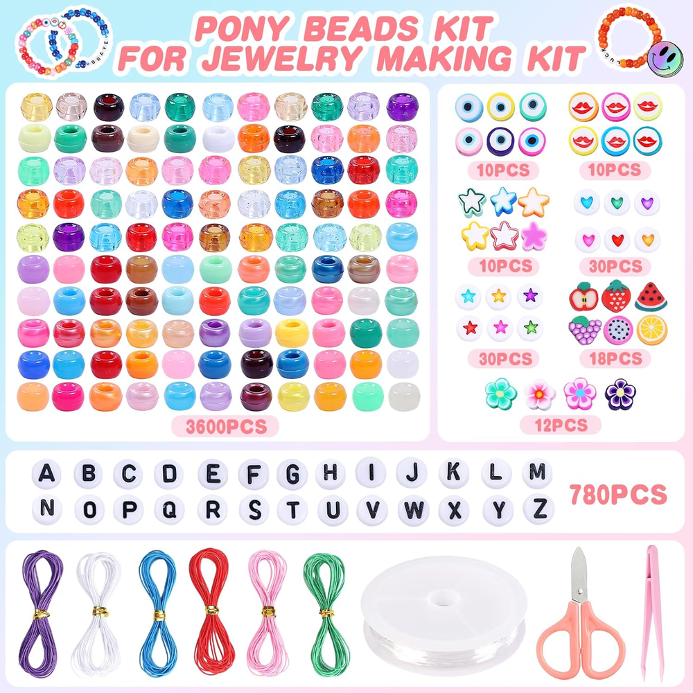 Bracelet making kit: You will receive 5 boxes bracelet making kit contains about 3600 pcs pony beads in 120 colors, about 60 pcs clay beads, 780 pcs letter beads , 60 pcs flat heart and star beads and so on, 7 rolls of strings, a scissors and a tweezers. Quality and vibrant beads: The pony beads for bracelets have 120 iridescent colors in all, and are made of premium materials with smooth surface and accurate 4 mm holes for easy stringing, waterproof, not easy to fade. Wide application: The bracelet making kit for girls 6-12 are very suitable for making necklaces, bracelets, hair braids, earrings, pendants, keychains, phone lanyard and other interesting DIY crafts like beaded pets, etc. Ideal for gift-giving: Our friendship bracelet making kit is warm gift for girls and adults, so it is a perfect gift for your families, kids, friends, teachers and colleagues at birthday, Christmas, Thanksgiving and Mother's and Children's Day! Great for festival: The pony bead kit is suitable for various festivals, by matching the color of the beads, highlighting the theme color, you can create a strong festival atmosphere. For example, the theme of St. Patrick's Day is green, and Christmas is green, white and red, etc. Product Description AMDBHC 5 Boxes Pony Beads For Friendship Bracelet Making Kit A must-have for DIY enthusiasts looking to create beautiful bracelets and jewelry pieces. Our bracelet making kit is designed with a focus on versatility, quality, and creativity, making it ideal for crafters of kids and adults. Inside this jewelry making kit, you will find everything you need to get started on your bracelet making journey. With over 3600 pcs sturdy pony beads in 120 assorted vibrant colors, the creative possibilities are endless. These lightweight and sturdy plastic beads are perfect for making bracelets, hair braiding, DIY crafts, and jewelry projects. Whether you are a beginner or experienced crafter, our bracelet making kit ensures a seamless crafting experience. The included organizer box keeps your beads neatly stored and organized, which will provide you with great convenience. Perfect for various occasions, our pony beads making kit is suitable for creating friendship bracelets. The high-quality materials ensure that your creations will stand the test of time, making them perfect for gift-giving or personal use. Bring out your inner artist with the AMDBHC bracelet making kit today and explore the endless possibilities of bead crafting. Transform simple beads into stunning accessories with ease and let your creativity shine through.