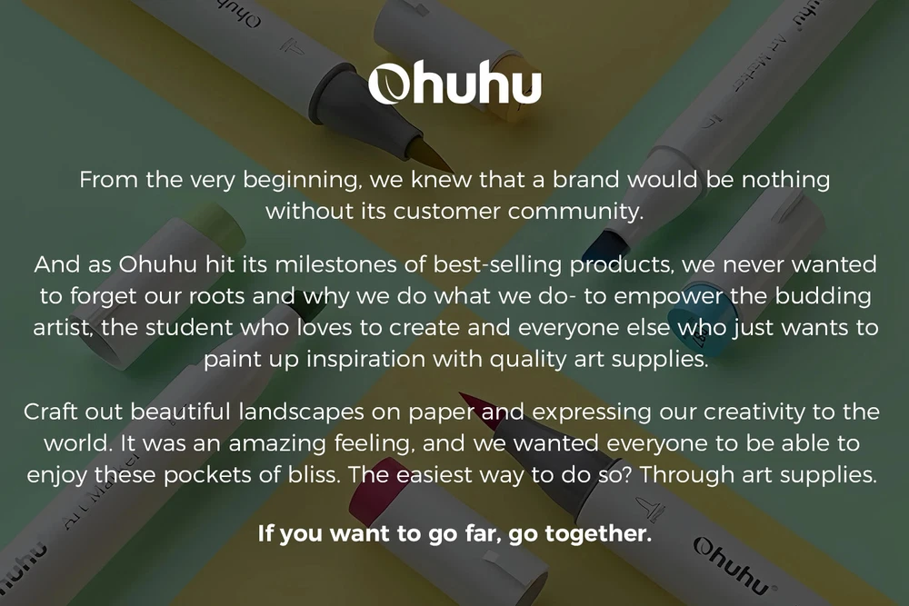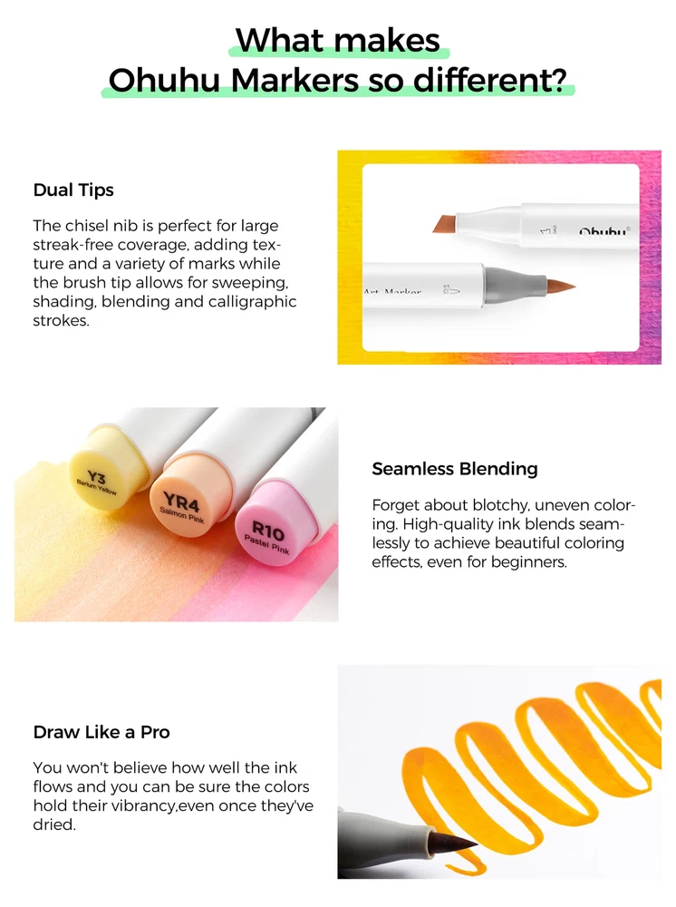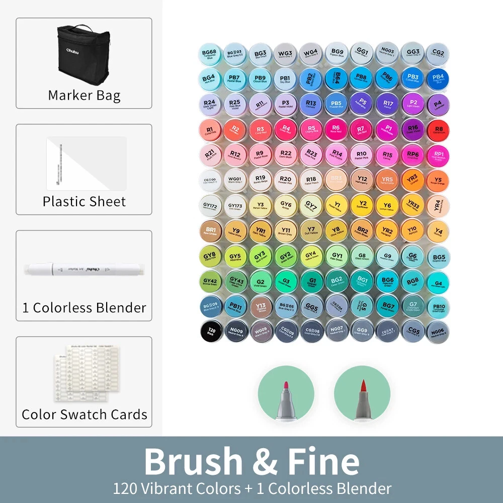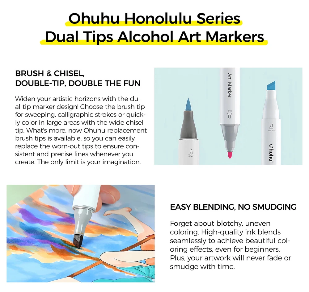 Main Featrues 【Honolulu Series】BRUSH & CHISEL , DOUBLE-TIP, DOUBLE THE FUN Widen your artistic horizons with the dual-tip marker design! Choose the brush tip for sweeping, calligraphic strokes or quickly color in large areas with the wide chisel tip. What's more, now Ohuhu replacement brush tips is available, so you can easily replace the worn-out tips to ensure consistent and precise lines whenever you create. The only limit is your imagination 【Honolulu B Series】BRUSH & FINE , DOUBLE-TIP, DOUBLE THE FUN Widen your artistic horizons with the dual-tip marker design! Choose the brush tip for sweeping, calligraphic strokes or the fine tip for details. What's more, now Ohuhu replacement brush tips is available, so you can easily replace the worn-out tips to ensure consistent and precise lines whenever you create. The only limit is your imagination REFILLABLE INK FOR A LIFETIME OF CREATIVITY With 51 Ohuhu popular colors available for refills now and more on the way, your creativity knows no bounds. Enjoy a wide range of hues and keep your markers going for years to come. Whether you're exploring the rich colors of Honolulu, Oahu, the Kaala, or the bold hues of Molokai Series, they are refillable now. Switch between sets seamlessly and unlock endless artistic possibilities SEAMLESSLY BLENDING Say goodbye to unsightly splotches and uneven coloring. Our high-quality ink seamlessly blends to create beautiful, professional-grade artwork, perfect for both beginners and experienced artists; Also, no more frustrating smudges or wet ink ruining your work. Our alcohol-based ink dries quickly, ensuring that your art is always clean, crisp, smudge-free, and ready to display 120 VIBRANT COLORS + 1 COLORLESS BLENDER The rainbow is at your fingertips - choose from 120 brilliant colors and bring your ideas to life. The color spectrum is yours to explore with 120 brilliant shades to choose from, plus a colorless blender for better blending effects. From coloring books to professional masterpieces, our brush markers will breathe life into your artwork EASY IDENTIFICATION, ORGANIZATION & PORTABILITY Don't waste time searching for the perfect color. Our markers come with color-coded caps to keep you organized and efficient. Plus, the free carrying case makes these markers perfect for any coloring adventure or as a thoughtful gift for any artist Product Description